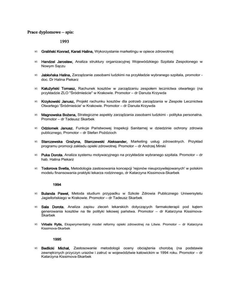 Prace dyplomowe – spis: 1993 • Graliński Konrad, Karaś Halina, Wykorzystanie marketingu w opiece zdrowotnej • Handzel Jarosław, Analiza struktury organizacyjnej Wojewódzkiego Szpitala Zespolonego w Nowym Sączu • Jabłońska Halina, Zarządzanie zasobami ludzkimi na przykładzie wybranego szpitala, promotor doc. Dr Halina Piekarz • Kałużyński Tomasz, Rachunek kosztów w zarządzaniu zespołem lecznictwa otwartego (na przykładzie ZLO "Śródmieście" w Krakowie. Promotor – dr Danuta Krzywda • Krzykowski Janusz, Projekt rachunku kosztów dla potrzeb zarządzania w Zespole Lecznictwa Otwartego 'Śródmieście' w Krakowie. Promotor – dr Danuta Krzywda • Magnowska Bożena, Strategiczne aspekty zarządzania zasobami ludzkimi - polityka personalna. Promotor – dr Tadeusz Skarbek • Odziomek Janusz, Funkcje Państwowej Inspekcji Sanitarnej w dziedzinie ochrony zdrowia publicznego, Promotor – dr Stefan Poździoch • Starczewska Grażyna, Starczewski Aleksander, Marketing usług zdrowotnych. Przykład programu promocji zakładu opieki zdrowotnej. Promotor – dr Andrzej Mirski • Puka Dorota, Analiza systemu motywacyjnego na przykładzie wybranego szpitala. Promotor – dr hab. Halina Piekarz • Todorova Svetla, Metodologia zastosowania koncepcji 'rejonów nieuprzywilejowanych' w polskim modelu finansowania praktyki lekarza rodzinnego, dr Katarzyna Kissimova-Skarbek 1994 • Bulanda Paweł, Metoda studium przypadku w Szkole Zdrowia Publicznego Uniwersytetu Jagiellońskiego w Krakowie. Promotor – dr Tadeusz Skarbek • Sala Dorota, Analiza zapisu zleceń lekarskich dotyczących farmakoterapii pod kątem generowania kosztów na tle polityki lekowej państwa. Promotor – dr Katarzyna KissimovaSkarbek • Virbalis Rytis, Eksperymentalny model reformy opieki zdrowotnej na Litwie. Promotor – dr Katarzyna Kissimova-Skarbek 1995 • Bedlicki Michał, Zastosowanie metodologii oceny obciążenia chorobą (na podstawie zewnętrznych przyczyn urazów i zatruć w województwie katowickim w 1994 roku. Promotor – dr Katarzyna Kissimova-Skarbek • Bryła Renata, Analiza strategiczna i plan rozwoju krakowskiego Szpitala Specjalistycznego im. Jana Pawła II. Promotor – prof. dr hab. Halina Piekarz • Ćwikła Aleksandra, Jagat Emilia, Aktywne formy walki z bezrobociem na przykładzie Rejonowego Urzędu Pracy w Chodzieży i w Wągrowcu. Promotor – dr Jacek Klich • Grzesiek Krystyna, Wykorzystanie informacji kosztowych w koncepcji zmian w zarządzaniu zespołem zakładów opieki zdrowotnej w Wadowicach. Promotor – dr Katarzyna KissimovaSkarbek • Hennig Jerzy, Zarządzanie ochroną zdrowia w aktualnym systemie opieki zdrowotnej na obszarze województwa, 1995. Promotor – prof. dr hab inż. Andrzej Matczewski • Karnicki Henryk, Opieka zdrowotna na Białorusi i kierunki zmian systemowych. Promotor – dr Stefan Poździoch • Kautsch Marcin, Doświadczenia z projektowania i funkcjonowania warsztatów terapii zajęciowej na przykładzie Państwowego Szpitala Klinicznego CM UJ • Marcinowicz Ludmiła, Projekt organizacji Wojewódzkiego Ośrodka Promocji Zdrowia i Edukacji Zdrowotnej. Promotor – prof. dr hab. inż Andrzej Matczewski • Muniak Piotr, Waldemar Stylo, Karta kontrolna zarządzania na przykładzie Krakowskego Szpitala Neuropsychiatrycznego im. J. Babińskiego. Promotor – dr Katarzyna Kissimova- Skarbek. • Śpitalniak Ewa, Koncepcja zmian organizacyjnych w ZOZ Myślenice na podstawie diagnozy podstawowych dysfunkcji z uwzględnieniem założeń reformy publicznej służby zdrowia. Promotor – prof. A. Matczewski • Tabariene Waleria, Zarządzanie Uniwersyteckim Szpitalem Dziecięcym na Litwie. Promotor - dr Stefan Poździoch • Wieja Andrzej, Koszty procedur medycznych jako podstawa zarządzania finansowego Szpitalem Klinicznym Nr 1 w Zabrzu. Promotor – dr Katarzyna Kissimova-Skarbek. • Wielogórska Halina, Niezbędny zakres instytucjonalnych rozwiązań w procesie rehabilitacji dzieci i młodzieży z mózgowym porażeniem dziecięcym na podstawie przeprowadzonych badań. Promotor – prof. Andrzej Matczewski • Wisłocka Anna, Propozycje zmian w zatrudnianiu i opłacaniu lekarzy stomatologów w Zespole Lecznictwa Otwartego 'Śródmieście' w Krakowie na tle proponowanych reform w systemie opieki zdrowotnej w Polsce. Promotor – dr Katarzyna Kissimova-Skarbek • Wójcicki Jarosław, Rola Rady Nadzorczej w procesie zarządzania szpitalem. Promotor – dr Stefan Poździoch Rok 1996 • Bośko Krystyna, Usytuowanie i rola domów opiekuńczych „Residential Homes” w strukturze systemu opieki zdrowotnej w Wielkiej Brytanii. Promotor – dr Stefan Poździoch. • Grabowska Elżbieta, Grzywa-Makur Danuta, Praktyka zamówień publicznych. • Grotkowska-Galata Barbara, Wielofunkcyjne kierunki działania domu pomocy społecznej im. L.A.Helców w Krakowie. Promotor – dr Stefan Poździoch. • Humięcka Bogumiła, Badania poziomu satysfakcji pacjentów korzystających ze świadczeń w przychodniach warszawskich. Analiza porównawcza. Promotor – dr Jacek Rafał Łuczak. • Marczak Joanna Teresa, Ewolucja praw dziecka do ochrony zdrowia. Promotor – dr Stefan Poździoch • Matysiak-Stempniak Elżbieta, Badanie satysfakcji rodziców dzieci - pacjentów Wojewódzkich Poradni Specjalistycznego Zespołu Opieki Zdrowotnej nad Matką i Dzieckiem we Wrocławiu • Minor Andrzej, Wdrażanie ustawy o zamówieniach publicznych w świetle praktyki wybranych zakładów opieki zdrowotnej w woj. katowickim. Promotor –dr Stefan Poździoch. • Niżankowski Marian, Organizacja i finansowanie Wojewódzkiej Epidemiologicznej. Promotor – dr Katarzyna Kissimova- Skarbek • Pawluś Anetta, Analiza kosztów i korzyści programu szczepień ochronnych przeciwko wirusowemu zapaleniu wątroby typu B. czy szczepienia przeciwko WZW typu B są opłacalne?. Promotor – dr Katarzyna Kissimova-Skarbek • Starszak-Trusz Elżbieta, Dokumentacja medyczna i sprawozdawczo