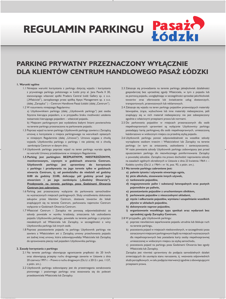 REGULAMIN PARKINGU PARKING PRYWATNY PRZEZNACZONY WYŁĄCZNIE DLA KLIENTÓW CENTRUM HANDLOWEGO PASAŻ ŁÓDZKI 1. Warunki ogólne 1.1 Niniejsze warunki korzystania z parkingu dotyczą wjazdu i korzystania z prywatnego parkingu położonego w Łodzi przy al. Jana Pawła II 30, stanowiącego własność spółki Pradera Central Łódź Gallery sp. z o.o. („Właściciel”), zarządzanego przez spółkę Apsys Management sp. z o.o. (dalej „Zarządca” ) – Centrum Handlowe Pasaż Łódzki (dalej „Centrum”). 1.2 W rozumieniu niniejszego Regulaminu: a) Użytkownikiem parkingu (dalej „Użytkownik parkingu”) jest osoba fizyczna kierująca pojazdem, a w przypadku braku możliwości ustalenia tożsamości kierującego pojazdem – właściciel pojazdu. b) Miejscem parkingowym jest wydzielona białymi liniami powierzchnia na terenie parkingu przeznaczona na parkowanie pojazdu. 1.3 P oprzez wjazd na teren parkingu Użytkownik parkingu zawiera z Zarządcą umowę o korzystanie z miejsca parkingowego na warunkach opisanych w niniejszym Regulaminie (dalej „Umowa”). Umowa wygasa z chwilą wyjazdu Użytkownika parkingu z parkingu i nie później niż z chwilą zamknięcia Centrum w danym dniu. 1.4 U żytkownik parkingu poprzez wjazd na teren parkingu wyraża zgodę na warunki Umowy przedstawione w niniejszym Regulaminie. 1.5 Parking jest parkingiem BEZPŁATNYM, NIESTRZEŻONYM, monitorowanym, czynnym w godzinach otwarcia Centrum. Użytkownik parkingu jest uprawniony do korzystania z parkingu i przebywania na jego terenie tylko w godzinach otwarcia Centrum, tj. od poniedziałku do niedzieli od godziny 8:00 do godziny 22:00, doliczając pół godziny przed jego otwarciem i po jego zamknięciu („Godziny Otwarcia”). Przebywanie na terenie parkingu poza Godzinami Otwarcia Centrum jest zabronione. 1.6 P arking jest przeznaczony wyłącznie do parkowania samochodów na wyznaczonych miejscach parkingowych. Służy umożliwieniu dokonania zakupów przez klientów Centrum, dostawie towarów do lokali znajdujących się na terenie Centrum, parkowaniu najemców Centrum wyłącznie w Godzinach Otwarcia Centrum. 1.7 W łaściciel Centrum i Zarządca nie ponoszą odpowiedzialności za szkody powstałe w wyniku kradzieży, zniszczenia lub uszkodzenia pojazdu Użytkownika parkingu, powstałe na terenie parkingu z przyczyn niezależnych od Właściciela lub Zarządcy, w szczególności z winy Użytkownika parkingu lub innych osób. 1.8 P oprzez pozostawienie pojazdu na parkingu Użytkownik parkingu nie zawiera z Właścicielem ani z Zarządcą umowy przechowania pojazdu ani żadnej innej umowy, która zobowiązywałaby Właściciela lub Zarządcę do sprawowania pieczy nad pojazdem Użytkownika parkingu. 2. Zasady korzystania z parkingu 2.1 N a terenie parkingu obowiązuje ograniczenie prędkości do 20 km/h oraz obowiązują przepisy ruchu drogowego zawarte w Ustawie z dnia 20 czerwca 1997 r. – Prawo o ruchu drogowym (Dz.U. z 2012 r. poz. 1137, z późn. zm.). 2.2 U żytkownik parkingu zobowiązany jest do przestrzegania oznakowania pionowego i poziomego parkingu oraz stosowania się do poleceń przedstawiciela Właściciela lub Zarządcy. PL_011-16_REGULAMIN_PARKINGU_905x1200.indd 1 2.3 Zakazuje się prowadzenia na terenie parkingu jakiejkolwiek działalności gospodarczej bez uprzedniej zgody Właściciela, w tym z pojazdu lub za pomocą pojazdu, uwzględniając w szczególności sprzedaż jakichkolwiek towarów oraz oferowanie lub świadczenie usług dostawczych, transportowych, przewozowych lub reklamowych. 2.4 Zakazuje się wjazdu na teren parkingu pojazdów przewożących materiały łatwopalne, żrące, wybuchowe lub inne materiały niebezpieczne, jeśli znajdujący się w nich materiał niebezpieczny nie jest zabezpieczony zgodnie z właściwymi przepisami prawa lub normami. 2.5 Do parkowania pojazdów w miejscach przeznaczonych dla osób niepełnosprawnych uprawnieni są wyłącznie Użytkownicy parkingu posiadający kartę parkingową dla osób niepełnosprawnych, umieszczoną każdorazowo w widocznym miejscu za przednią szybą pojazdu. 2.6 Użytkownik parkingu ponosi odpowiedzialność za wszelkie szkody wyrządzone osobom trzecim i Właścicielowi lub Zarządcy na terenie parkingu (w tym za zniszczenia, uszkodzenia i zanieczyszczenia). W razie powstania szkody Użytkownik parkingu zobowiązany jest przed opuszczeniem parkingu do niezwłocznego poinformowania Zarządcy o powstałej szkodzie. Zarządca ma prawo dochodzić naprawienia szkody na zasadach ogólnych określonych w Ustawie z dnia 23 kwietnia 1964 r. – Kodeks cywilny (Dz.U. z 1964 r. nr 16, poz. 93, z późn. zm.). 2.7 Na terenie parkingu zabronione jest: a) palenie tytoniu i używanie otwartego ognia, b) picie alkoholu, stosowanie innych używek, c) tankowanie pojazdów, d) magazynowanie paliw i substancji łatwopalnych oraz pustych pojemników po paliwie, e) pozostawianie pojazdów z uruchomionym silnikiem, f) parkowanie pojazdów z nieszczelnymi układami, g) mycie i odkurzanie pojazdów, wymiana i uzupełnianie wszelkich płynów w układach pojazdów, h) dokonywanie napraw pojazdów, i) organizowanie wszelkiego typu spotkań oraz wydarzeń bez uprzedniej zgody Zarządcy Centrum. 2.8 W przypadku, gdy Użytkownik parkingu: a) poprzez niewłaściwe zaparkowanie pojazdu utrudnia lub blokuje ruch na terenie parkingu, b) pozostawia pojazd w miejscach niedozwolonych, w szczególności poza oznaczonymi miejscami parkingowymi bądź na miejscach wyznaczonych dla niepełnosprawnych bez posiadania karty osoby niepełnosprawnej umieszczonej w widocznym miejscu za szybą samochodu, c) pozostawia pojazd na parkingu poza Godzinami Otwarcia bez zgody Właściciela lub Zarządcy, Zarządca jest również uprawniony do podjęcia samodzielnych działań zmierzających do usunięcia stanu naruszenia, tj. wezwania odpowiednich służb porządkowych, w celu podjęcia interwencji zgodnie z obowiązującymi przepisami prawa. 21.03.2016 13:36