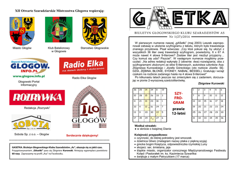 XII Otwarte Szaradziarskie Mistrzostwa Głogowa wspierają: BIULETYN GŁOGOWSKIEGO KLUBU SZARADZISTÓW AS Nr 1(27)/2014 Miasto Głogów Klub Batalionowy w Głogowie Starostwo Głogowskie Radio Elka Głogów Głogowski Portal Informacyjny Redakcja „Rozrywki” W pierwszym numerze naszej „gASetki” (maj 2003) Leszek zaproponował zabawę w ułożenie szyfrogramu z tekstu, którym była trawestacja znanego przysłowia. Pisał wówczas: „Czy ktoś pokusi się, by ułożyć z wszystkich 36 liter owej trawestacji szyfrogram, powiedzmy, 6 x 6? A może nawet 4 słowa 9-literowe? Zestaw liter jest niezbyt przyjazny… Czy komuś się uda? Piszcie!”. W następnym numerze mogliśmy przeczytać: „Na adres redakcji wpłynęły 2 (słownie: dwa) rozwiązania, oba z szyfrogramami złożonymi ze słów 6-literowych, autorstwa członków Asa: Zbigniewa Kurowskiego i Józefa Góreckiego (oto rozbicie Józefa: SĘDZIA, ZĘBINA, BŁONIE, SYDNEY, NABIAŁ, BESSEL). Gratuluję i wciąż czekam na rozbicie zadanego hasła na 4 słowa 9-literowe!” Po kilkunastu latach jeszcze raz zmierzyłem się z zadaniem, dorzucając w pionie 2-wyrazową sześcioliterówkę. Zbigniew Kurowski 36 25 14 34 8 19 10 28 15 26 33 3 11 21 31 23 18 1 32 4 12 16 24 7 13 9 20 30 22 5 17 35 29 2 27 6 SZYFROGRAM prawie 12-letni 1 2 3 4 5 6 7 8 9 10 11 12 13 14 15 16 17 18 19 20 21 22 23 24 25 26 27 28 29 30 31 32 33 34 35 36 Wzdłuż strzałek: ● w skrócie o księżnej Dianie Sobota Sp. z o.o. – Głogów Serdecznie dziękujemy! GASETKA. Biuletyn Głogowskiego Klubu Szaradzistów „As”, ukazuje się co jakiś czas. Przygotowywaniem „GAsetki” para się Zbigniew Kurowski. Niniejszy egzemplarz powielono 60 razy. Zapraszamy na profil „Asa” na Facebooku. Kolejność przypadkowa: • czynność, do której potrzebny jest smoczek • dzielnica Gliwic (metagram nazwy ptaka z piękną szyją) • grecka bogini Księżyca, odpowiedniczka rzymskiej Luny • skojarz: ser, śmietana, jaja • śląskie miasto, organizator corocznego Międzynarodowego Festiwalu Kolęd i Pastorałek im. ks. Kazimierza Szwarlika • świętuje z małym Patryczkiem (17 marca) TROPEM ASA As – polski miniserial kryminalny z 2002 roku w reżyserii Grzegorza Okrasy (odcinki 1 i 2) oraz Janusza Dymka (odc. 3). W rolach głównych wystąpili Mirosław Zbrojewicz jako Piotr Serafin, prywatny detektyw, oraz Aleksandra Woźniak jako Ania Łubieńska, jego asystentka. Serial realizowano w październiku 2002. Głównymi bohaterami serialu są: Piotr Serafin, prywatny detektyw oraz Ania Łubieńska, jego asystentka, która pracę w Biurze Detektywistycznym "AS" otrzymała w dość niecodzienny sposób. Biuro Detektywistyczne "AS" otrzymuje rozmaite zlecenia, od odnalezienia młodej dziewczyny, która uciekła z niewiadomych przyczyn z domu poprzez odszukanie sprawców zamachu na życie pewnego gwiazdora telewizyjnego aż do próby rozwikłania zagadki śmierci policjanta. Zapewne ta informacja zaciekawi naszą Kasię. Otóż w serialu gra Cezary Domagała jako Rozmus, ojciec policjantki Iwony. SZLAKIEM SZARADZISTY 3 sierpnia br. na Facebooku zamieściłem zdjęcie, z komentarzem: Mariuszu, zgadnij, gdzie ustrzeliłem fotkę. Dalsza dyskusja przebiegała następująco: Bogdan Witek Czy to kiosk z krzyżówkami? Mariusz Góralski obstawiam Nowy Sącz:) Zbigniew Kurowski Pudło! To Twój Wrocław. Dworzec autobusowy. Joanna Sieniawska Daleko szukał, blisko znalazł... Dodam, że fotografia otrzymała 7 polubień. Dla przypomnienia: Fotki zrobione na gohreńskich ulicach (wyspa Rugia, Niemcy). Są to tabliczki znamionowe wodociągów. Ciekawe jakie kryją informacje? Ot, hydrozagadka. Agencja Nieruchomości AS jest jedną z najstarszych agencji nieruchomości na terenie Górnego Śląska. Zasięgiem działania obejmuje głównie Gliwice, Zabrze, Knurów, oraz ich okolice. góralski1 przym. taki, który jest charakterystyczny dla górala – mieszkańca gór. Żartobliwy: góralski taniec (taniec, za który należy orkiestrze zapłacić górala, czyli 500 złotych). góralski2 rzecz. r. m. szybki taniec wykonywany przez górali podhalańskich, tańczony wokół watry (ogniska), głównie przez mężczyzn, rzadko w parach; złożony z 3-8 charakterystycznych figur, towarzyszą mu liczne przyśpiewki i solowe popisy taneczne; także: muzyka do tego tańca. Typowe motywy taneczne góralskiego to: zwyrtanie (obracanie), uderzanie w pięty i ciupkanie (przytupy). Góralski3 Mariusz (ur. 1960), korektor i adiustator, członek wrocławskiego klubu Kamer. Autor i czołowy rozwiązywacz. Zwycięzca wielu teleturniejów (Krzyżówka szczęścia, Gra, Awantura o kasę, Mowa polska i inne). Szaradziarski Mistrz Polski z roku 1988. Czołowy zawodnik Turniejów Kompozycji Krzyżówki, zwycięzca tych turniejów w 1988, 1989 i w 2001. Używa pseudonimu Góral. Rozkładówkę opracował: Zbigniew Kurowski Wykorzystałem informacje zawarte w Internecie, Encyklopedii Rozrywek Umysłowych i Praktycznym Słowniku Współczesnej Polszczyzny, wyd. Kurpisz.