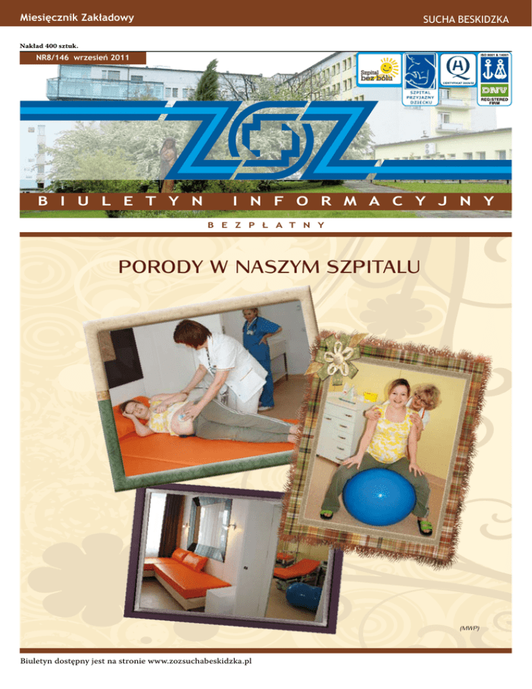 Miesięcznik Zakładowy Sucha Beskidzka Nakład 400 sztuk. NR8/146 wrzesień 2011 B I U L E T Y N I N F O R M A C Y J N Y B E Z P Ł A T N Y PORODY W NASZYM SZPITALU (MWP) Biuletyn dostępny jest na stronie www.zozsuchabeskidzka.pl nr 8 wrzesień 2011 B i u l e t y n i n f o r m a c y j n y PORODY W NASZYM SZPITALU 8 kwietnia 2011 roku weszło w życie Rozporządzenie Ministra Zdrowia z dnia 10 marca 2011 r. dotyczące opieki nad kobietą w okresie ciąży, porodu, połogu oraz opieką nad noworodkiem. Przepisy tego rozporządzenia porządkują sprawy merytoryczne, organizacyjne, prawne przy udzieleniu świadczeń z zakresu opieki nad kobietą ciężarną oraz okołoporodową. Poród to wyjątkową chwilą w życiu każdej kobiety i jej bliskich powinien się odbyć w sposób naturalny tak, aby wspólny wysiłek matki i dziecka zaowocował urodzeniem zdrowego i oczekiwanego dziecka. Wszystkie mamy pragną, aby odbył się bez komplikacji . Dążymy w naszym Szpitalu do stworzenia jak najlepszych warunków, które ułatwią kobietom narodziny zdrowego dziecka. Kobieta po porodzie ma prawo do tz. kontaktu „skóra do skóry” z nowo narodzonym dzieckiem co najmniej przez 2 godziny. Położne ułatwią matce rozpoznanie momentu, kiedy noworodek jest gotowy do ssania piersi oraz oferują pomoc w zakresie laktacji, jeśli będzie potrzebna. Personel medyczny nakłania ciężarne by skorzystały podczas porodu ze wsparcia kogoś bliskiego. Kobieta sama może decydować o tym jaką pozycję chce przyjąć podczas rodzenia. W świetle nowego rozporządzenia ma być informowana o wszelkich interwencjach personelu, a ciążę i poród fizjologiczny może prowadzić sama położna. Oddział Ginekologiczno – Położniczego i Neonatologiczny pracuje według zasad opracowanych na podstawie 10 kroków do udanego karmienia. Gwarantujemy profesjonalną opiekę nad rodzącą i położnicą oraz jej dzieckiem. Nasz personel na bieżąco podnosi swoje kwalifikacje zawodowe. Wszystkie Położne zatrudnione w naszym szpitalu posiadają certyfikaty: „Pozycje wertykalne w I i II okresie porodu teoria i praktyka, część osób ukończyła dodatkowo kursy: Nowoczesne prowadzenie porodu zgodnie ze standardem Ministerstwa Zdrowia dotyczącym opieki nad kobietą podczas porodu fizjologicznego. Są to kursy organizowane przez Fundację Rodzić po Ludzku. „Na Bloku Porodowym mogłam sama decydować w jakiej pozycji znosić ból. Panie położne wykazywały ze swej strony dużą cierpliwość i empatie. Oddział Położniczy to kolejne plusy: fachowa opieka, troska i uśmiech na twarzy. Gdy dzieciątko płacze natychmiast zjawia się jakaś miła osoba, która dyskretnie oferuje pomoc. Gdy mamie coś dolega – szybka reakcja. Jestem bardzo zadowolona z decyzji aby rodzić w szpitalu w Suchej Beskidzkiej. „ Życzę wszystkiego dobrego! Z wyrazami szacunki-pacjentka J. S. z córeczką Leną Nasz Szpital jest w trakcie zakupu dodatkowego sprzętu uzupełniającego do monitorowania pacjentek po porodach zabiegowych, oraz dodatkowy nowy sprzęt do monitorowania noworodków. Wszystko to ma na celu dostosowanie się do powyższego rozporządzenia jak również poprawę bezpieczeństwa zarówno dla rodzących u nas kobiet jak i ich nowo narodzonych pociech. Wprowadzenie standardów o których mowa wyżej nie wymagało wielu zmian z uwagi na fakt posiadania przez nasz szpital certyfikatów: Szpital Przyjazny Dziecku, Akredytacji jak również certyfikatów ISO. Od wielu lat na naszym oddziale istnieje możliwość skorzystania z porodu rodzinnego. Pacjentka podczas porodu ma do dyspozycji: klasyczną salę porodową podzieloną na 3 boksy B i u l e t y n i n f o r m a c y j n y wyposażoną w łóżka porodowe, salę porodów rodzinnych z wanną do porodu w wodzie, w obrębie bloku porodowego wydzieloną salę operacyjną (do wykonywania cięć cesarskich). „Trzy razy miałam to szczęście przebywać na oddziale (2003 – córka, 2006 – syn, 2011 – bliźnięta). Zawsze opuszczałam go jako szczęśliwa matka wyposażona w wiedzę umożliwiającą samodzielny i bardzo dobry start poza murami szpitala.„ Z podziękowaniem - I. W. Niezbędny sprzęt medyczny jest w zasięgu ręki. Podczas porodu kobieta ma możliwość wyboru pozycji porodowej. Pacjentka może korzystać z tradycyjnego łóżka porodowego, piłki, worka sako, materaca gimnastycznego. Dziecko od pierwszych chwil po narodzinach aż do wypisu z oddziału przebywa wraz z matką – co daje mu poczucie bezpieczeństwa, równocześnie codzienne odwiedziny bliskich, życzliwy stosunek personelu do matek i ich dzieci, cisza, uprzejmość, zapewnienie intymności - to wszystko powoduje, iż to Szpital Przyjazny Dziecku. Bardzo ważna jest możliwość „rodzinnego świętowania” po urodzeniu dziecka. Po porodzie można wraz z maluszkiem i towarzyszącą osobą pozostać jeszcze przez dwie godziny w tym samym pokoju i cieszyć się tą niepowtarzalną chwilą. Narodziny dziecka w takich warunkach nadają temu wydarzeniu prawdziwie rodzinnego charakteru. Oddział Ginekologiczno – Położniczy współpracuje z oddziałem Neonatologicznym który działa w systemie II poziomu referencyjności. Podstawowym za- daniem oddziału Neonatologicznego jest obserwacja i pielęgnacja zdrowych noworodków oraz diagnostyka i leczenie niedojrzałych lub chorych noworodków. Oddział funkcjonuje w systemie rooming-in, to znaczy, że każdy noworodek przebywa z matką przez cały czas pobytu w oddziale. U noworodków wykonywane są profilaktyczne badania przesiewowe oraz szczepienia ochronne. Oprócz działalności medycznej i pielęgnacyjnej podejmowane są szerokie działania edukacyjne: teore- nr 8 wrzesień 2011 nr 8 wrzesień 2011 B i u l e t y n i n f o r m a c y j n y „Karmienie piersią nie należy do rzeczy prostych ale przy wspólnym udziale mamy i kompetentnych pielęgniarek można zdziałać bardzo dużo. Można również karmić piersią równie szybko 