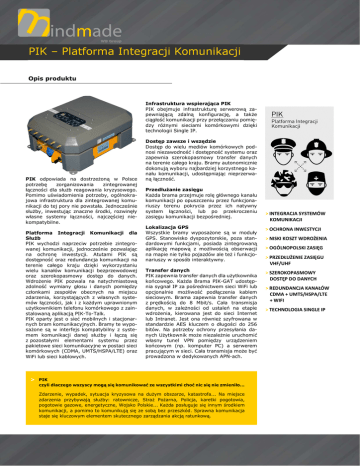 PIK – Platforma Integracji Komunikacji Opis produktu Infrastruktura wspierająca PIK PIK obejmuje infrastrukturę serwerową zapewniającą zdalną konfigurację, a także ciągłość komunikacji przy przełączaniu pomiędzy różnymi sieciami komórkowymi dzięki technologii Single IP. PIK odpowiada na dostrzeżoną w Polsce potrzebę zorganizowania zintegrowanej łączności dla służb reagowania kryzysowego. Pomimo uświadomienia potrzeby, ogólnokrajowa infrastruktura dla zintegrowanej komunikacji do tej pory nie powstała. Jednocześnie służby, inwestując znaczne środki, rozwinęły własne systemy łączności, najczęściej niekompatybilne. Platforma Integracji Komunikacji dla Służb PIK wychodzi naprzeciw potrzebie zintegrowanej komunikacji, jednocześnie pozwalając na ochronę inwestycji. Atutami PIK są dostępność oraz redundancja komunikacji na terenie całego kraju dzięki wykorzystaniu wielu kanałów komunikacji bezprzewodowej oraz szerokopasmowy dostęp do danych. Wdrożenie PIK pozwala na natychmiastową zdolność wymiany głosu i danych pomiędzy członkami zespołów obecnych na miejscu zdarzenia, korzystających z własnych systemów łączności, jak i z każdym uprawnionym użytkownikiem telefonu komórkowego z zainstalowaną aplikacją PIK-To-Talk. PIK oparty jest o sieć mobilnych i stacjonarnych bram komunikacyjnych. Bramy te wyposażone są w interfejs kompatybilny z systemem komunikacji danej służby i łączą się z pozostałymi elementami systemu przez pakietowe sieci komunikacyjne w postaci sieci komórkowych (CDMA, UMTS/HSPA/LTE) oraz WiFi lub sieci kablowych. Dostęp zawsze i wszędzie Dostęp do wielu mediów komórkowych podnosi niezawodność i dostępność systemu oraz zapewnia szerokopasmowy transfer danych na terenie całego kraju. Bramy autonomicznie dokonują wyboru najbardziej korzystnego kanału komunikacji, udostępniając nieprzerwaną łączność. Przedłużanie zasięgu Każda brama przejmuje rolę głównego kanału komunikacji po opuszczeniu przez funkcjonariuszy terenu pokrycia przez ich natywny system łączności, lub po przekroczeniu zasięgu komunikacji bezpośredniej. Lokalizacja GPS Wszystkie bramy wyposażone są w moduły GPS. Stanowisko dyspozytorskie, poza standardowymi funkcjami, posiada zintegrowaną aplikację mapową z możliwością obserwacji na mapie nie tylko pojazdów ale też i funkcjonariuszy w sposób interaktywny. Transfer danych PIK zapewnia transfer danych dla użytkownika końcowego. Każda Brama PIK-GAT udostępnia sygnał IP za pośrednictwem sieci WiFi lub opcjonalnie możliwość podłączenia kablem sieciowym. Brama zapewnia transfer danych z prędkością do 8 Mbit/s. Cała transmisja danych, w zależności od ustaleń na etapie wdrożenia, kierowana jest do sieci Internet lub Intranet. Jest ona również szyfrowana w standardzie AES kluczem o długości do 256 bitów. Na potrzeby ochrony przesyłania danych Użytkownik może niezależnie uruchomić własny tunel VPN pomiędzy urządzeniem końcowym (np. komputer PC) a serwerem pracującym w sieci. Cała transmisja może być prowadzona w dedykowanych APN-ach. > PIK czyli dlaczego wszyscy mogą się komunikować ze wszystkimi choć nic się nie zmieniło... Zdarzenie, wypadek, sytuacja kryzysowa na dużym obszarze, katastrofa... Na miejsce zdarzenia przybywają służby: ratownicze, Straż Pożarna, Policja, karetki pogotowia, pogotowie gazowe, energetyczne, Wojsko Polskie... Każda posługuje się innym środkiem komunikacji, a pomimo to komunikują się ze sobą bez przeszkód. Sprawna komunikacja staje się kluczowym elementem skutecznego zarządzania akcją ratunkową. > INTEGRACJA SYSTEMÓW KOMUNIKACJI > OCHRONA INWESTYCJI > NISKI KOSZT WDROŻENIA > OGÓLNOPOLSKI ZASIĘG > PRZEDŁUŻENIE ZASIĘGU VHF/UHF > SZEROKOPASMOWY DOSTĘP DO DANYCH > REDUNDANCJA KANAŁÓW CDMA + UMTS/HSPA/LTE + WIFI > TECHNOLOGIA SINGLE IP PIK – Platforma Integracji Komunikacji Infrastruktura Single IP W celu zapewnienia wysokiej jakości usług dzięki redundancji interfejsów radiowych oraz niezauważalnego przełączania pomiędzy nimi, w PIK zastosowano technologię SingleIP. Technologia ta, przy zastosowaniu serwerów SingleIP, zapewnia podtrzymanie połączenia w warunkach utraty jednego z łączy radiowych. Bramy dokonują bieżącej analizy dostępności oraz jakości interfejsów radiowych i wybierają najlepszą trasę do przesłania pakietów danych. Szerokie możliwości konfiguracji Każda brama mobilna pozwala m.in. wybrać sieć preferowaną oraz zapasową i wskazać tryb jej pracy, zdefiniować sposób korzystania z kart SIM/RUIM i wiele innych. Wszystkie czynności konfiguracyjne mogą być wykonywane zdalnie za pomocą interfejsu WWW. Do sterowania komunikacją w systemie dostarczamy konsolę dyspozytorską. Podstawowe parametry komunikacyjne platformy > INTERFEJSY KOMÓRKOWE: CDMA-2000 rev. A: 1XEVDO L-band Polkomtel; EvDO A-band Orange GPRS/EDGE/UMTS/HSPA+/LTE > PARAMETRY BRAMY: Zasilanie: nominalne 12V DC, dopuszczalne 8-18V DC Pobór prądu bramy (radiotelefon 1W): Radiotelefon bezczynny: średnio 900mA Radiotelefon odbiera: średnio 950mA Radiotelefon nadaje: średnio 1 300mA Maksymalnie: 2,3 A w piku 25 ms Pobór prądu bramy (radiotelefon 25W): Radiotelefon bezczynny: średnio 1 000mA Radiotelefon odbiera: średnio 1 100mA Radiotelefon nadaje: średnio 2 400mA Maksymalnie: 4,2 A w piku 25 ms Masa: 6,2 kg Wymiary: 300 x 240 x 125 mm Temperatura pracy -30 +50 °C, Wilgotność 5-95% Klasa odporności IP44 > ZINTEGROWANE TECHNOLOGIE KOMUNIKACJI SŁUŻBOWEJ: Tetra DMR (MotoTrbo, Hytera) GoTa (Polkomtel) Analog UHF/VHF Nexedge (Kenwood) FoNET (WB Electronics) inne ... > FUNKCJE DODATKOWE: Wsparcie technologii Single IP Konsola operatorska PIK-to-Talk Lokalizacja GPS Porównanie systemu homogenicznego oraz PIK > CECHA > ŁĄCZNOŚĆ ZINTEGROWANA PIK > SYSTEM HOMOGENICZNY Nakłady inwestycyjne Niskie – zakup bram i ewentualnie terminali Ogr