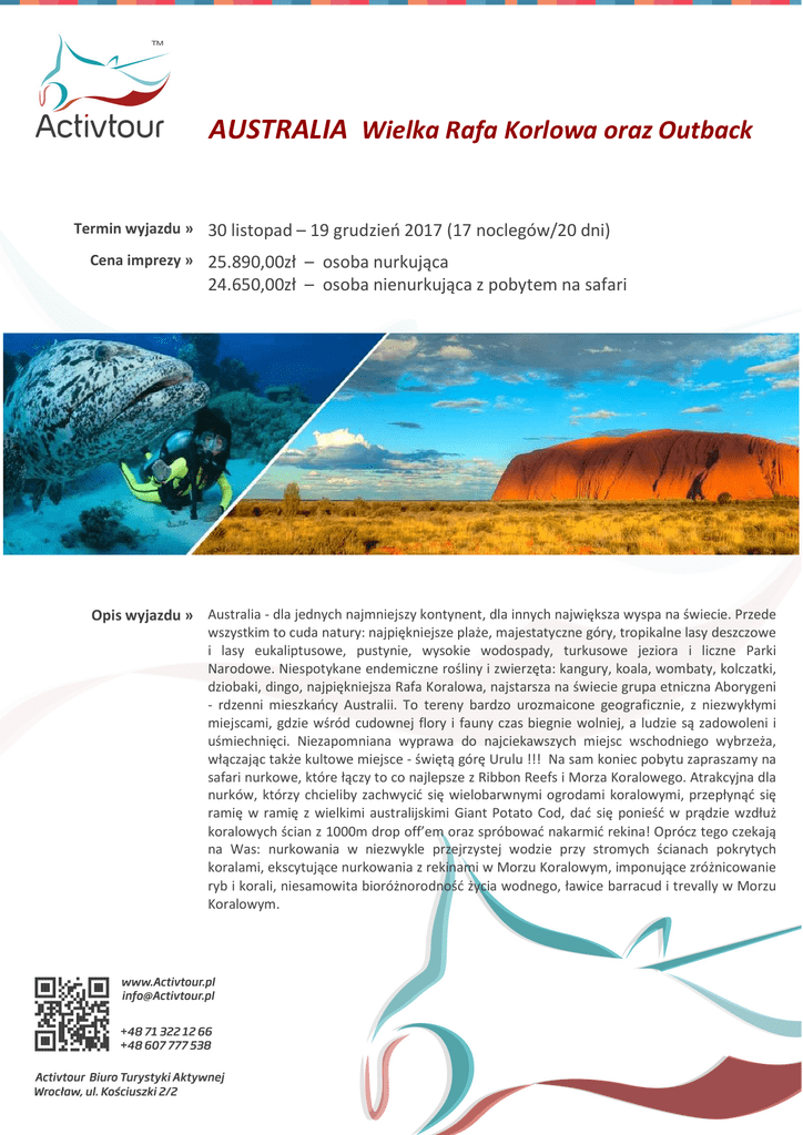AUSTRALIA Wielka Rafa Korlowa oraz Outback Termin wyjazdu » 30 listopad – 19 grudzień 2017 (17 noclegów/20 dni) Cena imprezy » 25.890,00zł – osoba nurkująca 24.650,00zł – osoba nienurkująca z pobytem na safari Opis wyjazdu » Australia - dla jednych najmniejszy kontynent, dla innych największa wyspa na świecie. Przede wszystkim to cuda natury: najpiękniejsze plaże, majestatyczne góry, tropikalne lasy deszczowe i lasy eukaliptusowe, pustynie, wysokie wodospady, turkusowe jeziora i liczne Parki Narodowe. Niespotykane endemiczne rośliny i zwierzęta: kangury, koala, wombaty, kolczatki, dziobaki, dingo, najpiękniejsza Rafa Koralowa, najstarsza na świecie grupa etniczna Aborygeni - rdzenni mieszkańcy Australii. To tereny bardzo urozmaicone geograficznie, z niezwykłymi miejscami, gdzie wśród cudownej flory i fauny czas biegnie wolniej, a ludzie są zadowoleni i uśmiechnięci. Niezapomniana wyprawa do najciekawszych miejsc wschodniego wybrzeża, włączając także kultowe miejsce - świętą górę Urulu !!! Na sam koniec pobytu zapraszamy na safari nurkowe, które łączy to co najlepsze z Ribbon Reefs i Morza Koralowego. Atrakcyjna dla nurków, którzy chcieliby zachwycić się wielobarwnymi ogrodami koralowymi, przepłynąć się ramię w ramię z wielkimi australijskimi Giant Potato Cod, dać się ponieść w prądzie wzdłuż koralowych ścian z 1000m drop off’em oraz spróbować nakarmić rekina! Oprócz tego czekają na Was: nurkowania w niezwykle przejrzystej wodzie przy stromych ścianach pokrytych koralami, ekscytujące nurkowania z rekinami w Morzu Koralowym, imponujące zróżnicowanie ryb i korali, niesamowita bioróżnorodność życia wodnego, ławice barracud i trevally w Morzu Koralowym. RAMOWY PROGRAM IMPREZY opcja z 8 dniowym safari nurkowym Dzień 1 - 30.11 » Zbiórka na lotnisku w Warszawie lub Krakowie w godzinach popołudniowych (możliwość organizacji przelotu z innych miast - może to wpłynąć na zmianę proponowanej ceny), Odprawa paszportowo - biletowa, przelot do Sydney - lot z 1 przesiadką, Dzień 2 - 01.12 » Lądowanie w Sydney, Przywitanie z opiekunem grupy, Transfer do lodgy w Sydney, Zakwaterowanie w pokojach, czas wolny i odpoczynek po podróży. Dzień 3 - 02.12 » Śniadanie, Półdniowa wycieczka po Sydney włączając słynną plażę Bondi. W programie min.: Circular Quay, Opera House, Herbour Bridge, Chinatown (luty to czas chińskiego nowego roku!!!), Darling Harbour, życie nocne w dzielnicy Kings Cross, przejazd przez zatokę Watson Bay i przystanek w miejscu zwanym "The Gap", pobyt na słynnej plaży surfingowców Bondi Beach, przejazd ekskluzywnymi zakątkami dzielnic Double Bay oraz Rose Bay. Powrót do hotelu, czas wolny. Dzień 4 - 03.12 » Śniadanie, \ Całodzienna wycieczka z adrenaliną! Przejedziemy do Parku Narodowego Gór Błękitnych, które nie są łańcuchem górskim lecz mocno zerodowaną wyżyną z piaskowca. Rozsypujące się skały utworzyły tu strome, niedostępne urwiska z malowniczymi formacjami skalnymi i wodospadami. Dotrzemy do punktu widokowego Echo Point, z którego roztacza się wspaniały widok na formacje skalne Three Sisters i Ruined Castle, doliny Jamison i Burragorang, Mount Solitary i wodospady Katoomba Falls. Następnie kolejką linową "Scenic Railway" z gondolami o szklanych podłogach przejedziemy nad doliną Jamison i będziemy podziwiać znajdujące się 200 m poniżej wąwozy i wodospady. W ciągu dnia lunch. Powrót do hotelu, czas wolny. Dzień 5 - 04.12 » Śniadanie, Wycieczka po najstarszej dzielnicy Sydney - The Rocks, Obecnie The Rocks to urodziwa, pełna starych (jak na Australię), odrestaurowanych budynków, dzielnica leżąca w bezpośrednim sąsiedztwie Opery i Mostu, i jedna z głównych atrakcji Sydney. Ale nie zawsze tak było. Przez lata The Rocks pełniło funkcję portu, i jak w przypadku wielu innych miast portowych w XVIII i XIX wieku było także slumsem, zagłębiem prostytucji, miejscem pełnym biedy, pijanych marynarzy, ciemnych zaułków i ścieków płynących ulicami. Powrót do hotelu, czas wolny. Dzień 6 - 05.12 » Śniadanie, Wykwaterowanie z hotelu, Przejazd na lotnisko i odprawa paszportowo - bagażowa, Lokalny przelot Sydney - Ayers Rock, Spotkanie z przewodnikiem, Półdniowa wycieczka na zachód słońca w scenerii Kata Tjuta. To nieco większa (albo raczej zdecydowanie większa) formacja skalna, której częścią jest właśnie Uluru. Oddalona od góry Aborygenów o 44 km jest atrakcją, którą zdecydowanie warto zobaczyć. O ile Uluru nie ma swojego tłumaczenia, o tyle Kata Tjuta w języków aborygeńskim oznacza „wiele głów” - dokładnie takie przywołuje skojarzenia. To dokładnie 36 ogromnych skał, a największa z nich ma 546 m wysokości. Przejazd do lodgy w Ayers Rock oraz zakwaterowanie w pokojach, Czas wolny. Dzień 7 - 06.12 » Pobudka oraz przejazd do Kata Tjuta - śniadanie o wschodzie słońca w spektakularnej scenerii Kata Tjuta, 2-3 godzinny trek w Dolinie Wiatrów (Valley of the Winds), Przejazd w okolice Masywu Urulu - świętej góry Aborygenów / symbolu Australii. Po aborygeńsku – Uluru, po angielsku – Ayers Rock. Miejsce o dwóch oficjalnych nazwach. Formacja skalna, która choć wcale nie jest największym monolitem świata – ani nie monolit, ani nie największy, obydwie te informacje zostały obalone – z pewnością jest tym najbardziej rozpoznawalnym, naturalnym symbolem Down Under. Aborygeni, którzy przywędrowali tu ponad 10 tysięcy lat temu (!!!) uznali to miejsce za święte. Podobno zostało stworzone w czasie Dreamtine (sennej drogi) i jest punktem orientacyjnym tejże drogi, wytyczonym przez praprzodków. Każda grota czy wgłębienie mają swoją historię i są śladem np. walk bóstw totemicznych. Z każdej strony tej potężnej skały można znaleźć groty pokryte archaicznymi malowidłami, źródła czy jeziorka. Dla Aborygenów były to miejsca inicjacji młodych, rytuałów, rozm