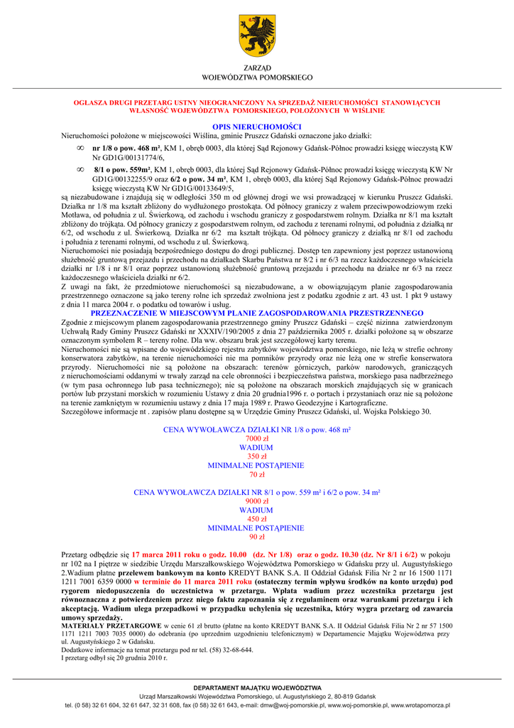OGŁASZA DRUGI PRZETARG USTNY NIEOGRANICZONY NA SPRZEDAŻ NIERUCHOMOŚCI STANOWIĄCYCH WŁASNOŚĆ WOJEWÓDZTWA POMORSKIEGO, POŁOŻONYCH W WIŚLINIE OPIS NIERUCHOMOŚCI Nieruchomości położone w miejscowości Wiślina, gminie Pruszcz Gdański oznaczone jako działki: • • nr 1/8 o pow. 468 m², KM 1, obręb 0003, dla której Sąd Rejonowy Gdańsk-Północ prowadzi księgę wieczystą KW Nr GD1G/00131774/6, 8/1 o pow. 559m², KM 1, obręb 0003, dla której Sąd Rejonowy Gdańsk-Północ prowadzi księgę wieczystą KW Nr GD1G/00132255/9 oraz 6/2 o pow. 34 m², KM 1, obręb 0003, dla której Sąd Rejonowy Gdańsk-Północ prowadzi księgę wieczystą KW Nr GD1G/00133649/5, są niezabudowane i znajdują się w odległości 350 m od głównej drogi we wsi prowadzącej w kierunku Pruszcz Gdański. Działka nr 1/8 ma kształt zbliżony do wydłużonego prostokąta. Od północy graniczy z wałem przeciwpowodziowym rzeki Motława, od południa z ul. Świerkową, od zachodu i wschodu graniczy z gospodarstwem rolnym. Działka nr 8/1 ma kształt zbliżony do trójkąta. Od północy graniczy z gospodarstwem rolnym, od zachodu z terenami rolnymi, od południa z działką nr 6/2, od wschodu z ul. Świerkową. Działka nr 6/2 ma kształt trójkąta. Od północy graniczy z działką nr 8/1 od zachodu i południa z terenami rolnymi, od wschodu z ul. Świerkową. Nieruchomości nie posiadają bezpośredniego dostępu do drogi publicznej. Dostęp ten zapewniony jest poprzez ustanowioną służebność gruntową przejazdu i przechodu na działkach Skarbu Państwa nr 8/2 i nr 6/3 na rzecz każdoczesnego właściciela działki nr 1/8 i nr 8/1 oraz poprzez ustanowioną służebność gruntową przejazdu i przechodu na działce nr 6/3 na rzecz każdoczesnego właściciela działki nr 6/2. Z uwagi na fakt, że przedmiotowe nieruchomości są niezabudowane, a w obowiązującym planie zagospodarowania przestrzennego oznaczone są jako tereny rolne ich sprzedaż zwolniona jest z podatku zgodnie z art. 43 ust. 1 pkt 9 ustawy z dnia 11 marca 2004 r. o podatku od towarów i usług. PRZEZNACZENIE W MIEJSCOWYM PLANIE ZAGOSPODAROWANIA PRZESTRZENNEGO Zgodnie z miejscowym planem zagospodarowania przestrzennego gminy Pruszcz Gdański – część nizinna zatwierdzonym Uchwałą Rady Gminy Pruszcz Gdański nr XXXIV/190/2005 z dnia 27 października 2005 r. działki położone są w obszarze oznaczonym symbolem R – tereny rolne. Dla ww. obszaru brak jest szczegółowej karty terenu. Nieruchomości nie są wpisane do wojewódzkiego rejestru zabytków województwa pomorskiego, nie leżą w strefie ochrony konserwatora zabytków, na terenie nieruchomości nie ma pomników przyrody oraz nie leżą one w strefie konserwatora przyrody. Nieruchomości nie są położone na obszarach: terenów górniczych, parków narodowych, graniczących z nieruchomościami oddanymi w trwały zarząd na cele obronności i bezpieczeństwa państwa, morskiego pasa nadbrzeżnego (w tym pasa ochronnego lub pasa technicznego); nie są położone na obszarach morskich znajdujących się w granicach portów lub przystani morskich w rozumieniu Ustawy z dnia 20 grudnia1996 r. o portach i przystaniach oraz nie są położone na terenie zamkniętym w rozumieniu ustawy z dnia 17 maja 1989 r. Prawo Geodezyjne i Kartograficzne. Szczegółowe informacje nt . zapisów planu dostępne są w Urzędzie Gminy Pruszcz Gdański, ul. Wojska Polskiego 30. CENA WYWOŁAWCZA DZIAŁKI NR 1/8 o pow. 468 m² 7000 zł WADIUM 350 zł MINIMALNE POSTĄPIENIE 70 zł CENA WYWOŁAWCZA DZIAŁKI NR 8/1 o pow. 559 m² i 6/2 o pow. 34 m² 9000 zł WADIUM 450 zł MINIMALNE POSTĄPIENIE 90 zł Przetarg odbędzie się 17 marca 2011 roku o godz. 10.00 (dz. Nr 1/8) oraz o godz. 10.30 (dz. Nr 8/1 i 6/2) w pokoju nr 102 na I piętrze w siedzibie Urzędu Marszałkowskiego Województwa Pomorskiego w Gdańsku przy ul. Augustyńskiego 2.Wadium płatne przelewem bankowym na konto KREDYT BANK S.A. II Oddział Gdańsk Filia Nr 2 nr 16 1500 1171 1211 7001 6359 0000 w terminie do 11 marca 2011 roku (ostateczny termin wpływu środków na konto urzędu) pod rygorem niedopuszczenia do uczestnictwa w przetargu. Wpłata wadium przez uczestnika przetargu jest równoznaczna z potwierdzeniem przez niego faktu zapoznania się z regulaminem oraz warunkami przetargu i ich akceptacją. Wadium ulega przepadkowi w przypadku uchylenia się uczestnika, który wygra przetarg od zawarcia umowy sprzedaży. MATERIAŁY PRZETARGOWE w cenie 61 zł brutto (płatne na konto KREDYT BANK S.A. II Oddział Gdańsk Filia Nr 2 nr 57 1500 1171 1211 7003 7035 0000) do odebrania (po uprzednim uzgodnieniu telefonicznym) w Departamencie Majątku Województwa przy ul. Augustyńskiego 2 w Gdańsku. Dodatkowe informacje na temat przetargu pod nr tel. (58) 32-68-644. I przetarg odbył się 20 grudnia 2010 r. Informacje o pozostałych nieruchomościach: www.woj-pomorskie.pl oraz www.wrotapomorza.pl