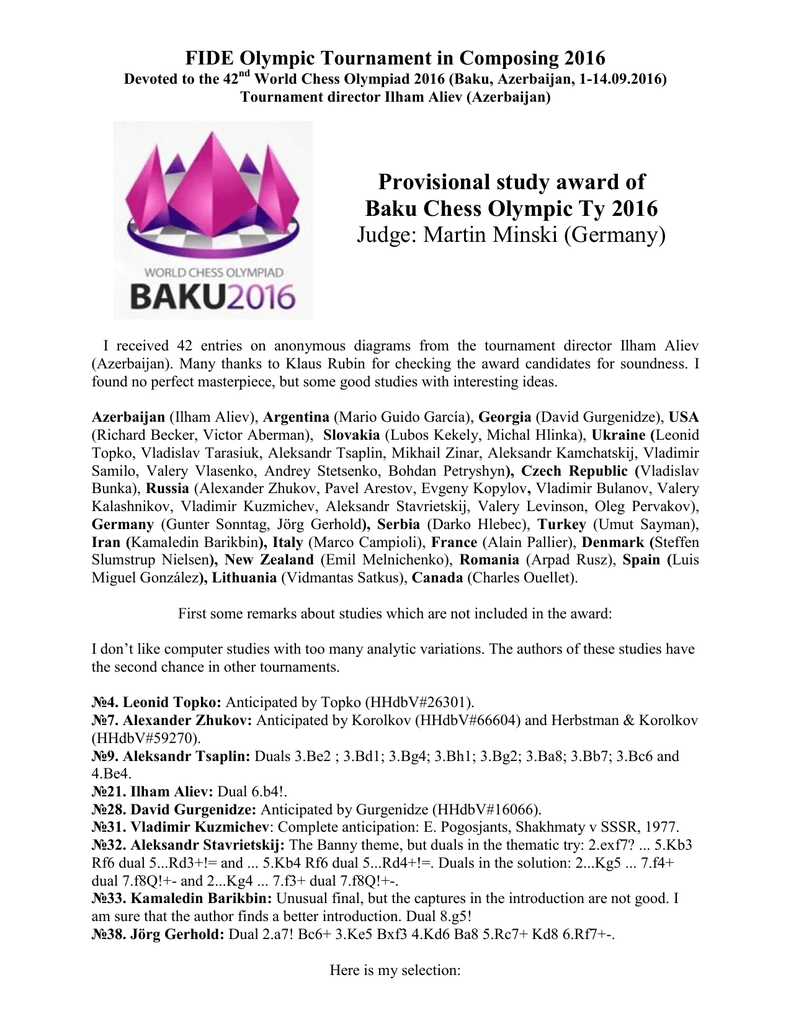 FIDE Olympic Tournament in Composing 2016 Devoted to the 42nd World Chess Olympiad 2016 (Baku, Azerbaijan, 1-14.09.2016) Tournament director Ilham Aliev (Azerbaijan) Provisional study award of Baku Chess Olympic Ty 2016 Judge: Martin Minski (Germany) I received 42 entries on anonymous diagrams from the tournament director Ilham Aliev (Azerbaijan). Many thanks to Klaus Rubin for checking the award candidates for soundness. I found no perfect masterpiece, but some good studies with interesting ideas. Azerbaijan (Ilham Aliev), Argentina (Mario Guido García), Georgia (David Gurgenidze), USA (Richard Becker, Victor Aberman), Slovakia (Lubos Kekely, Michal Hlinka), Ukraine (Leonid Topko, Vladislav Tarasiuk, Aleksandr Tsaplin, Mikhail Zinar, Aleksandr Kamchatskij, Vladimir Samilo, Valery Vlasenko, Andrey Stetsenko, Bohdan Petryshyn), Czech Republic (Vladislav Bunka), Russia (Alexander Zhukov, Pavel Arestov, Evgeny Kopylov, Vladimir Bulanov, Valery Kalashnikov, Vladimir Kuzmichev, Aleksandr Stavrietskij, Valery Levinson, Oleg Pervakov), Germany (Gunter Sonntag, Jörg Gerhold), Serbia (Darko Hlebec), Turkey (Umut Sayman), Iran (Kamaledin Barikbin), Italy (Marco Campioli), France (Alain Pallier), Denmark (Steffen Slumstrup Nielsen), New Zealand (Emil Melnichenko), Romania (Arpad Rusz), Spain (Luis Miguel González), Lithuania (Vidmantas Satkus), Canada (Charles Ouellet). First some remarks about studies which are not included in the award: I don’t like computer studies with too many analytic variations. The authors of these studies have the second chance in other tournaments. №4. Leonid Topko: Anticipated by Topko (HHdbV#26301). №7. Alexander Zhukov: Anticipated by Korolkov (HHdbV#66604) and Herbstman & Korolkov (HHdbV#59270). №9. Aleksandr Tsaplin: Duals 3.Be2 ; 3.Bd1; 3.Bg4; 3.Bh1; 3.Bg2; 3.Ba8; 3.Bb7; 3.Bc6 and 4.Be4. №21. Ilham Aliev: Dual 6.b4!. №28. David Gurgenidze: Anticipated by Gurgenidze (HHdbV#16066). №31. Vladimir Kuzmichev: Complete anticipation: E. Pogosjants, Shakhmaty v SSSR, 1977. №32. Aleksandr Stavrietskij: The Banny theme, but duals in the thematic try: 2.exf7? ... 5.Kb3 Rf6 dual 5...Rd3+!= and ... 5.Kb4 Rf6 dual 5...Rd4+!=. Duals in the solution: 2...Kg5 ... 7.f4+ dual 7.f8Q!+- and 2...Kg4 ... 7.f3+ dual 7.f8Q!+-. №33. Kamaledin Barikbin: Unusual final, but the captures in the introduction are not good. I am sure that the author finds a better introduction. Dual 8.g5! №38. Jörg Gerhold: Dual 2.a7! Bc6+ 3.Ke5 Bxf3 4.Kd6 Ba8 5.Rc7+ Kd8 6.Rf7+-. Here is my selection: №35. Steffen Slumstrup Nielsen (Denmark) Baku Chess Olympic ty 2016 1st Prize Draw (=) 6+6 1.Kg6 Rc6+ [1...Nf4+ 2.Kxh6 Rc6+ 3.Qd6!+-] 2.Bd6 [2.f6? Qxc7; 2.Bf6+? Rxf6+ 3.Kxf6 Qb6+] 2...Nf4+ 3.Kxh6 Ne6! [3...Ne2 4.c8Q+ Rxc8 5.Be5+ Qg7+ 6.Bxg7#; 3...Nd3 4.Qxd3 Qa1 eg 5.Kh5=] 4.Qxb3 [4.Be5+? Ng7+; 4.fxe6? Qe3+ 5.Kh5 Qxe6] 4...Qxc7 5.Bxc7 Nd4+ [or 5...Nc5+] 6.Qe6! [6.f6? Nxb3 7.Be5 Nc5!-+] 6...Nxe6 [6...Nxf5+ 7.Kg6 (7.Kg5) ] 7.Be5+ Ng7+ 8.f6 Ne6! [8...Nf5+ 9.Kg5; 8...Ne8 9.Kg5; 8...Ra6 9.Kg6] 9.f7+ [9.Bb2? Nf8] 9...Ng7+ 10.Kg5 Kxh7 11.f8N+! [11.f8Q? Ne6+ -+]=. Impressive flow of black and white counterplay with spectacular Queen sacrifices, crosschecks and a Knight underpromotion. Autor: "At move eight piece A unpins piece B, which immediately unpins piece A." There is a study by Richter (HHdbV#40043), but I think that this is not a real anticipation. №18. Evgeny Kopylov (Russia) Baku Chess Olympic ty 2016 2nd Prize Win (+) 10+5 1.Re4+ [1.e8Q+? Rxe8 2.Re4+ Kf7 3.Re7+ Rxe7 4.Nxe7 Qc3+!=] 1...Kf7! [1...Kd5 2.e8Q Rxe8 3.Rxe8+-; 1...Kd7 2.f7 Rb3+ 3.Kg2+-] 2.Nh6+! [2.Nc6? Qc3+ 3.e3 Rxg8–+; 2.e8Q+? Rxe8 3.Re7+ Rxe7 4.Nxe7 Qc3+=] 2...Qxh6 [2...Kxf6 3.g8Q+-] 3.Nc6! [3.e8Q+? Rxe8 4.Rxe8 Qh5+ 5.Kg2 Qd5+ 6.Kxh2 Kxe8=] 3...Qh5+ [3...Re8 4.Ne5+ Kxf6 5.g8N+ Rxg8 6.Ng4++-] 4.g4 [4.Kg2? Re8–+] 4...Qxh4 [4...Qd5 5.Nxb8+-] 5.Nd8+ Rxd8 [5...Kxf6 6.e8N+!+- Another knight 6...Kg5 7.Nf7#] 6.exd8N+! [6.exd8Q?? Qg3#] 6...Kxf6 [6...Kg8 7.Re8++-] 7.g5+! Qxg5 8.g8N+! Double Phoenix! [8.g8Q?? Qg3#] 8...Kf5 [8...Kg7 9.Ne6++-] 9.Re5+!! [9.Ne7+? Kf6 10.Re6+ Kg7 11.Rxg6+ Qxg6 12.Nxg6 Kxg6=] 9...Bxe5 [9...Kxe5 10.Nf7+ Kf5 11.e4+ Ke6 12.Nxg5++-] 10.e4#! Ideal mate by pawn in the middle of the board with two self-blocks and two promoted PhoenixKnights. In comparison to the 1st prize no black counterplay. №37. Luis Miguel González (Spain) Baku Chess Olympic ty 2016 3rd Prize Win (+) 5+4 1.g7+ [1.Rc8+? Qxc8 2.g7+ Kh7 3.Bxc8 Rf1! 4.Bb7 Rf7 5.Be4+ Kg8 6.Bd5 Kh7 7.Bxf7 stalemate] 1...Kh7 2.Bf5+ Kg8 3.Rc8+ Qxc8 4.Bxc8 Rd1+ 5.Ke5 [5.Ke4? Re1+ 6.Kd5 Kf7] 5...Re1+ 6.Kf6! [6.Kd6? Kf7 7.Bb7 Re6+ 8.Kc5 Re8 9.Bc6 Rd8 10.Bd5+ Kg6 11.Nf4+ Kh7 12.Be4+ Kg8 13.Nh5 Kf7 14.Bd5+ Kg6= positional draw] 6...Rf1+ 7.Bf5! [7.Kg6? Rg1+ 8.Kxh6 Rg6+ 9.Kxg6 stalemate] 7...Rf2 8.Ke5 Re2+ 9.Be4! [9.Kd6? Kf7!=] 9...Kf7 10.Kd4! [loss of time 10.Kf4 Rd2! 11.Bg6+ Kg8 12.Bf5 Rf2+ 13.Ke5] 10...Rd2+ 11.Bd3! [11.Kc5? Rd8=] 11...Rd1 12.Kc3! Rc1+ 13.Bc2! Rg1 14.Bb3+ wins. Amazing systematic movement. Compare with Dobrescu (HHdbV#36369) and Krug & Garcia (HHdbV#01318), but this is not the same pattern. №13. Darko Hlebec (Serbia) Baku Chess Olympic ty 2016 Special prize BTM, Draw (=) 10+10 1...Ne6+! [1...Ra4+ 2.Bb4! Rxb4+ 3.Kc3 a2 4.exf8Q+ Be8 5.Qxe8+! Nxe8 6.exf5=] 2.Nxe6 Qxe4+! 3.Rxe4 a2 4.e8Q+ [4.Rxd6? a1Q+–+ 5.Kd5 Bxe4+–+] 4...Bxe8 5.Rxd6 a1Q+ Phoenix 6.Kd5 Qa2+ 7.Nc4 Rd1+ 8.Bd4 [8.Nd4? Bf7+ 9.Rde6 gxh1Q–+] 8...Ra5+ 9.Nc5 Bf7+ 10.Rde6 [10.Kc6? Rxc5+!–+] 10...gxh1Q [10...Bxe6+ 11.Kxe6 Qxc4+ 12.Kxf6 Ra6+ 13.Nxa6 Qxa6+ 14.Kg7 Qb7+ 15.Kf8 Qxe4 16.Qh3+=; 10...gxh1R 11.Kd6 Ra6+ 12.Nxa6 Qxa6+ 13.Ke7 Qb7+ 14.Kxf6 Rh6+ 15.Kg5 Rxe6 16.Nd6+ Rxd6 17.Qxd6 Qxe4 18.Qc5+!=] 11.Qc7+!! Kxc7 stalemate. Ideal stalemate on five pinned pieces. An impressive task record. Unfortunately, the play is not optimum. Is there really no better introduction? №14. Victor Aberman (USA) Baku Chess Olympic ty 2016 1st honourable mention Win (+) 4+4 1.h5 Nc5 2.Kf3 [2.h6? Ne4+ 3.Kg2 Be5 4