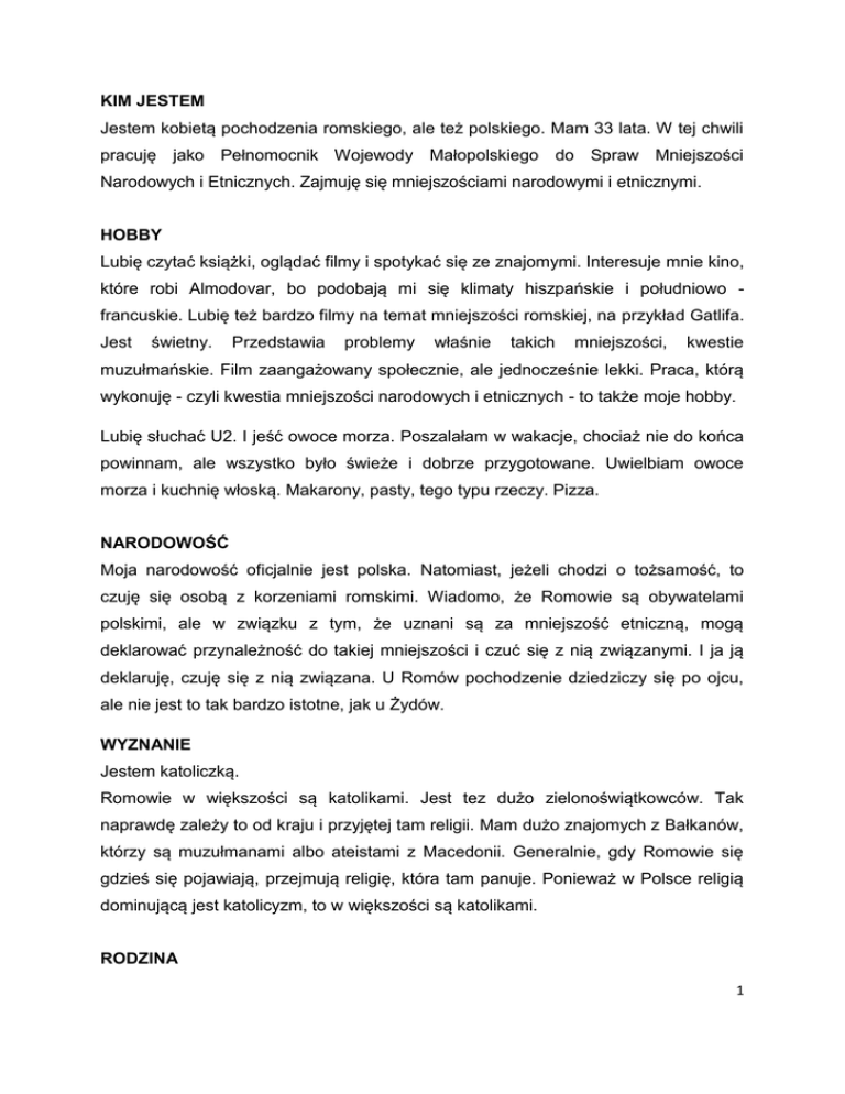 KIM JESTEM Jestem kobietą pochodzenia romskiego, ale też polskiego. Mam 33 lata. W tej chwili pracuję jako Pełnomocnik Wojewody Małopolskiego do Spraw Mniejszości Narodowych i Etnicznych. Zajmuję się mniejszościami narodowymi i etnicznymi. HOBBY Lubię czytać książki, oglądać filmy i spotykać się ze znajomymi. Interesuje mnie kino, które robi Almodovar, bo podobają mi się klimaty hiszpańskie i południowo francuskie. Lubię też bardzo filmy na temat mniejszości romskiej, na przykład Gatlifa. Jest świetny. Przedstawia problemy właśnie takich mniejszości, kwestie muzułmańskie. Film zaangażowany społecznie, ale jednocześnie lekki. Praca, którą wykonuję - czyli kwestia mniejszości narodowych i etnicznych - to także moje hobby. Lubię słuchać U2. I jeść owoce morza. Poszalałam w wakacje, chociaż nie do końca powinnam, ale wszystko było świeże i dobrze przygotowane. Uwielbiam owoce morza i kuchnię włoską. Makarony, pasty, tego typu rzeczy. Pizza. NARODOWOŚĆ Moja narodowość oficjalnie jest polska. Natomiast, jeżeli chodzi o tożsamość, to czuję się osobą z korzeniami romskimi. Wiadomo, że Romowie są obywatelami polskimi, ale w związku z tym, że uznani są za mniejszość etniczną, mogą deklarować przynależność do takiej mniejszości i czuć się z nią związanymi. I ja ją deklaruję, czuję się z nią związana. U Romów pochodzenie dziedziczy się po ojcu, ale nie jest to tak bardzo istotne, jak u Żydów. WYZNANIE Jestem katoliczką. Romowie w większości są katolikami. Jest tez dużo zielonoświątkowców. Tak naprawdę zależy to od kraju i przyjętej tam religii. Mam dużo znajomych z Bałkanów, którzy są muzułmanami albo ateistami z Macedonii. Generalnie, gdy Romowie się gdzieś się pojawiają, przejmują religię, która tam panuje. Ponieważ w Polsce religią dominującą jest katolicyzm, to w większości są katolikami. RODZINA 1 Podobno mój prapradziadek był z Węgier, ale nie wiemy skąd byli jego pradziadowie. Na pewno z Indii, to jest zapisane w historii. Moja najbliższa rodzina prawie od stu lat mieszka w Czarnej Górze, w miejscowości, z której pochodzę. Jeśli chodzi o moją rodzinę, to po obu stronach jest ogromna. Mama i tato mieli po dziesięcioro rodzeństwa. Mieszkamy z rodziną ojca i to ona miała większy wpływ na moje życie. Jest to taka bardziej cygańska rodzina, chociaż nietypowa, ponieważ czymś powszechnym dla braci i sióstr mojego taty jest małżeństwo mieszane. Dla mnie także to coś normalnego – mój mąż jest nie-Romem. JĘZYK Posługuję się oczywiście językiem polskim. Romskim także, ale bardziej biernie. Potrafię rozmawiać, nie jest to natomiast język, w którym zostałam wychowana. W domu, z rodzicami, rozmawialiśmy raczej po polsku. Po romsku mówiło się u dziadków. Z tego, co mi mama opowiadała, dużo lepiej mówiłam wtedy niż obecnie. Teraz mam trochę pretensji do mojego taty, że nie rozmawiał z nami po romsku. Tak, więc moje języki to polski, romski oraz angielski. Adam Bartosz ma taką teorię. W latach 70 robił ze swoimi studentami badania. Twierdzi, a ja się z nim zgadzam, że pokolenie naszych rodziców wstydziło się tego, kim są. To były czasy, kiedy niechlubne było bycie Romem. Rodzice nie chcieli tak do końca przekazywać swoim dzieciom tej tradycji. A jej częścią był język. Uważali, że znajomość języka romskiego nam zaszkodzi. Według Bartosza właśnie, dlatego ten język nie był przekazywany. Może to było powodem, że bardziej uczyliśmy się polskiego - żebyśmy nie odstawali od reszty. W Polsce mamy dwa podręczniki, w dwóch dialektach: w Polskiej Romie i Bergitke Roma, ale brak osób mogących nauczać. To, że znasz język nie oznacza, że umiesz go nauczać i przekazać. TOŻSAMOŚĆ Nie można jej jednoznacznie zdefiniować. Tożsamość określa, kim jest człowiek, kim się czuje. Moja tożsamość jest skomplikowana przez to, że mam tak bardzo różnych rodziców. Rzeczywistość, która nas otacza, w porównaniu z tym, jak żyją inni 2 Romowie, jest trudna do pogodzenia. Ja się czuje kimś będącym na pograniczu dwóch światów. Na tożsamość może mieć wpływ bardzo wiele czynników. Na pewno rodzina i wychowanie. Dla mnie na przykład, zawsze naturalne było to, że Romowie są, że Romowie żyją w określony sposób, w określony sposób się do siebie odzywają, mają jakieś przyzwyczajenia, że się przesiaduje u kogoś, że wszyscy w niedzielę czy w sobotę wychodzą z kawą na zewnątrz i grają w karty. To, jak się wychowałam, jakich rodziców miałam, moje kuzynostwo. Wszystko to było naturalne i mnie z pewnością ukształtowało. Na moje poczucie odrębności wpływa także świadomość pochodzenia. Romowie mają swój hymn i zawsze, gdy go śpiewamy, czy są momenty, gdzie jest odśpiewywany, to czuję takie ukłucie gdzieś w sercu. Ale to samo czuję śpiewając hymn Polski. Jest flaga, odrębny język i to daje poczucie odrębności. Mam świadomość, że to coś wyjątkowego. Jest też świadomość historii. Wiele osób ze społeczności romskiej, które interesują się swoją historią, wie dobrze, co, jak i dlaczego jesteśmy w tym właśnie momencie, tu i teraz. Na poczucie odrębności wśród Romów mają także ogromny wpływ więzy krwi, ze względu na tradycję wielkich, rozszerzonych rodzin. Myślę, że w innych mniejszościach jest podobnie. To jest przede wszystkim ludzkie. U Romów jednak tworzy to mocne poczucie odrębności. No i jeszcze kwestia terytorium. Dla ogółu Romów nie ma ona jednak takiego znaczenia, bo dziś są tu, a jutro zupełnie gdzie indziej. To zależy od tego, czy dana grupa jest osiadła, czy nie. W naszym przypadku – Bergitka Roma - jest to istotne, ponieważ jesteśmy osiadli, związani z konkretnym miejscem. MOJA DROGA DO SAMOOKREŚLENIA Jak każdy młody człowiek na tym etapie, gdy kształtuje się tożsamość, zadaw