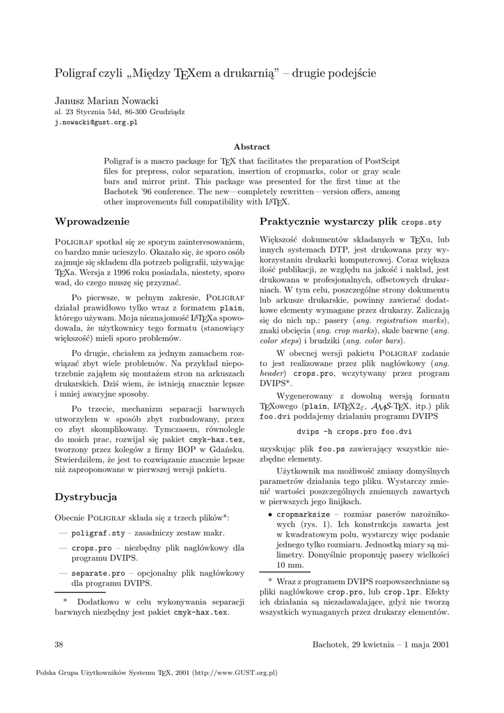 Poligraf czyli „Między TEXem a drukarnią” – drugie podejście Janusz Marian Nowacki al. 23 Stycznia 54d, 86-300 Grudziądz [email protected] Abstract Poligraf is a macro package for TEX that facilitates the preparation of PostScipt files for prepress, color separation, insertion of cropmarks, color or gray scale bars and mirror print. This package was presented for the first time at the Bachotek ’96 conference. The new—completely rewritten—version offers, among other improvements full compatibility with LATEX. Wprowadzenie Praktycznie wystarczy plik crops.sty Poligraf spotkał się ze sporym zainteresowaniem, co bardzo mnie ucieszyło. Okazało się, że sporo osób zajmuje się składem dla potrzeb poligrafii, używając TEXa. Wersja z 1996 roku posiadała, niestety, sporo wad, do czego muszę się przyznać. Większość dokumentów składanych w TEXu, lub innych systemach DTP, jest drukowana przy wykorzystaniu drukarki komputerowej. Coraz większa ilość publikacji, ze względu na jakość i nakład, jest drukowana w profesjonalnych, offsetowych drukarniach. W tym celu, poszczególne strony dokumentu lub arkusze drukarskie, powinny zawierać dodatkowe elementy wymagane przez drukarzy. Zaliczają się do nich np.: pasery (ang. registration marks), znaki obcięcia (ang. crop marks), skale barwne (ang. color steps) i brudziki (ang. color bars). W obecnej wersji pakietu Poligraf zadanie to jest realizowane przez plik nagłówkowy (ang. header) crops.pro, wczytywany przez program DVIPS*. Wygenerowany z dowolną wersją formatu TEXowego (plain, LATEX2ε , AMS-TEX, itp.) plik foo.dvi poddajemy działaniu programu DVIPS Po pierwsze, w pełnym zakresie, Poligraf działał prawidłowo tylko wraz z formatem plain, którego używam. Moja nieznajomość LATEXa spowodowała, że użytkownicy tego formatu (stanowiący większość) mieli sporo problemów. Po drugie, chciałem za jednym zamachem rozwiązać zbyt wiele problemów. Na przykład niepotrzebnie zająłem się montażem stron na arkuszach drukarskich. Dziś wiem, że istnieją znacznie lepsze i mniej awaryjne sposoby. Po trzecie, mechanizm separacji barwnych utworzyłem w sposób zbyt rozbudowany, przez co zbyt skomplikowany. Tymczasem, równolegle do moich prac, rozwijał się pakiet cmyk-hax.tex, tworzony przez kolegów z firmy BOP w Gdańsku. Stwierdziłem, że jest to rozwiązanie znacznie lepsze niż zaproponowane w pierwszej wersji pakietu. Dystrybucja Obecnie Poligraf składa się z trzech plików*: — poligraf.sty – zasadniczy zestaw makr. — crops.pro – niezbędny plik nagłówkowy dla programu DVIPS. — separate.pro – opcjonalny plik nagłówkowy dla programu DVIPS. * Dodatkowo w celu wykonywania separacji barwnych niezbędny jest pakiet cmyk-hax.tex. dvips -h crops.pro foo.dvi uzyskując plik foo.ps zawierający wszystkie niezbędne elementy. Użytkownik ma możliwość zmiany domyślnych parametrów działania tego pliku. Wystarczy zmienić wartości poszczególnych zmiennych zawartych w pierwszych jego linijkach. • cropmarksize – rozmiar paserów narożnikowych (rys. 1). Ich konstrukcja zawarta jest w kwadratowym polu, wystarczy więc podanie jednego tylko rozmiaru. Jednostką miary są milimetry. Domyślnie proponuję pasery wielkości 10 mm. * Wraz z programem DVIPS rozpowszechniane są pliki nagłówkowe crop.pro, lub crop.lpr. Efekty ich działania są niezadawalające, gdyż nie tworzą wszystkich wymaganych przez drukarzy elementów. 38 Polska Grupa Użytkowników Systemu TEX, 2001 (http://www.GUST.org.pl) Bachotek, 29 kwietnia – 1 maja 2001 Poligraf czyli „Między TEXem a drukarnią” – drugie podejście czy też w LATEXu \documentclass[b5paper]{article} Jeżeli rozmiarów papieru nie określimy w pliku źródłowym, DVIPS przyjmie wartość domyślną z pliku config.ps, najczęściej A-4, co nie musi być zgodne z naszymi oczekiwaniami. Trzeba też zwrócić uwagę na czasem zaskakujące działanie DVIPSa, polegające na „zaokrąglaniu” formatu, do rozmiarów domyślnych, z bliżej nieokreśloną dokładnością. Zapobiega temu opcja -t unknown Rysunek 1: A — cropmarksize, B — cropmarkdistance, C — barsize • cropmarkdistance – odległość paserów od pola strony (rys. 1). Jednostką miary są milimetry. Domyślnie proponuję odstęp wielkości 3 mm. • barsize – rozmiar kwadratowych pól (rys. 1), z których tworzone są paski barwne (skale barwne i brudziki). Jednostką miary są milimetry. Domyślnie proponuję kwadraciki o boku 5 mm. • colorbars – przełącznik sterujący zakresem dodawanych elementów graficznej obudowy strony: 0 – bez pasków barwnych, np. do montażu, 1 – z kompletem pasków barwnych, 2 – tylko ze skalami kolorów, 3 – tylko z brudzikami. • mirror – lustrzane odbicie całych stron wraz z graficzną obudową strony. Nie należy stosować w tym miejscu innych sposobów odwracania stron. • labeloff – wyłączenie umieszczania na poszczególnych stronach etykiet zawierających TEXowe i PostScriptowe numery stron oraz nazwę koloru separacji. • xoffset i yoffset – przesunięcie całych stron wraz z graficzną obudową strony względem punktu 0,0 PostScriptowego układu współrzędnych. Zwracam w tym miejscu uwagę na konieczność definiowania w źródłowym pliku TEXowym formatu papieru, na którym drukowana będzie nasza publikacja. Pomijanie tego zagadnienia jest powodem często występujących problemów. Samemu TEXowi format papieru jest w zasadzie obojętny, istotna jest szerokość składu, jego wysokość, punkt początkowy strony (lewy górny). Formatem papieru zajmuje się DVIPS, ustalając go na podstawie informacji pochodzącej z pliku źródłowego TEXa np. \special{papersize=xmm,ymm} wyłączająca formaty domyślne. *. Upewnimy się w ten sposób, że zastosowane zostaną rozmiary przez nas zdefiniowane. Z wnętrza pliku TEXowego Pliki nagłówkowe programu DVIPS uniezależniają nas od TEXowych formatów, lec