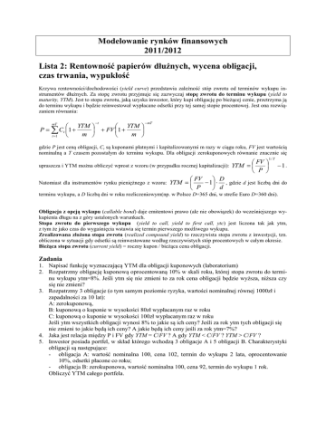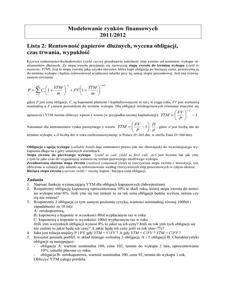 Modelowanie rynków finansowych 2011/2012 Lista 2: Rentowność papierów dłużnych, wycena obligacji, czas trwania, wypukłość Krzywa rentowności/dochodowości (yield curve) przedstawia zależność stóp zwrotu od terminów wykupu instrumentów dłużnych. Za stopę zwrotu przyjmuje się zazwyczaj stopę zwrotu do terminu wykupu (yield to maturity, YTM). Jest to stopa zwrotu, jaką uzyska inwestor, który kupi obligację po bieżącej cenie, przetrzyma ją do terminu wykupu i będzie reinwestował wypłacane odsetki przy tej samej stopie procentowej. Jest ona rozwiązaniem równania: t YTM YTM P Ct 1 FV 1 m m t 1 mT mT gdzie P jest ceną obligacji, Ct są kuponami płatnymi i kapitalizowanymi m razy w ciągu roku, FV jest wartością nominalną a T czasem pozostałym do terminu wykupu. Dla obligacji zerokuponowych równanie znacznie się 1/ T FV upraszcza i YTM można obliczyć wprost z wzoru (w przypadku rocznej kapitalizacji): YTM 1. P FV D Natomiast dla instrumentów rynku pieniężnego z wzoru: YTM 1 , gdzie d jest liczbą dni do P d terminu wykupu, a D liczbą dni w roku rozliczeniowym(np. w Polsce D=365 dni, w strefie Euro D=360 dni). Obligacja z opcją wykupu (callable bond) daje emitentowi prawo (ale nie obowiązek) do wcześniejszego wykupienia długu na z góry ustalonych warunkach. Stopa zwrotu do pierwszego wykupu (yield to call, yield to first call, ytc) jest liczona tak jak ytm, z tym że jako czas do wygaśnięcia wstawia się termin pierwszego możliwego wykupu. Zrealizowana złożona stopa zwrotu (realized compound yield) to rzeczywista stopa zwrotu z inwestycji, tzn. obliczona w sytuacji gdy odsetki są reinwestowane według rzeczywistych stóp procentowych w całym okresie. Bieżąca stopa zwrotu (current yield) = roczny kupon / bieżąca cena obligacji. Zadania 1. Napisać funkcję wyznaczającą YTM dla obligacji kuponowych (laboratorium) 2. Rozpatrzmy obligację kuponową oprocentowaną 10% w skali roku, której stopa zwrotu do terminu wykupu ytm=8%. Jeśli ytm się nie zmieni to za rok cena obligacji będzie wyższa, niższa czy się nie zmieni? 3. Rozpatrzmy 3 obligacje (o tym samym poziomie ryzyka, wartości nominalnej równej 1000zł i zapadalności za 10 lat): A: zerokuponową, B: kuponową o kuponie w wysokości 80zł wypłacanym raz w roku C: kuponową o kuponie w wysokości 100zł wypłacanym raz w roku Jeśli ytm wszystkich obligacji wynosi 8% to jakie są ich ceny? Jeśli za rok ytm tych obligacji się nie zmieni to jakie będą ich ceny? A jakie będą ich ceny jeśli za rok ytm=7%? 4. Jaka jest relacja między P i FV gdy YTM = C/FV ? A gdy YTM < C/FV ? YTM > C/FV ? 5. Inwestor posiada portfel, w skład którego wchodzą 3 obligacje A i 5 obligacji B. Charakterystyki obligacji są następujące: - obligacja A: wartość nominalna 100, cena 102, termin do wykupu 2 lata, oprocentowanie 10%, odsetki płacone co roku; - obligacja B: zerokuponowa, wartość nominalna 100, cena 92, termin do wykupu 1 rok. Obliczyć YTM całego portfela. 6. Załóżmy, że roczna obligacja zerokuponowa o wartości nominalnej 100zł jest sprzedawana po 94,34zł, a dwuletnia po 84,99zł. Zastanawiasz się nad zakupem dwuletniej obligacji kuponowej o wartości nominalnej 100zł i kuponach w wysokości 12zł płatnych raz w roku. Jaka jest ytm dwuletniej obligacji zerokuponowej? A jaka obligacji kuponowej? Jaka jest stopa forward 1r2 (na drugi rok)? 7. Obliczyć odsetki proste od długu zaciągniętego 15 grudnia 2001 i zwróconego 28 listopada 2002, jeśli roczna stopa procentowa wynosiła 10.5%. Zastosować każdą z czterech strategii obliczania odsetek związanych ze sposobem liczenia czasu. 8. Obligacje skarbowe o kuponie 8% (w skali roku) płatnym co 6 miesięcy są obecnie sprzedawane po cenie równej wartości nominalnej. Jaki powinien być kupon tych obligacji gdyby odsetki były płatne raz w roku a ich cena byłaby równa wartości nominalnej? 9. Dwie obligacje mają identyczne terminy zapadalności i kupony. Jedna może być wykupiona przez emitenta (callable) po cenie 105zł a druga po 110zł. Która powinna mieć większą ytm? 10. Rozpatrzmy obligację z kuponem 8% (płatności raz na rok) sprzedawaną po $953,10 i terminem zapadalności za 3 lata. Stopy procentowe w kolejnych 3 latach będą następujące: 8%, 10% i 12%. Oblicz ytm oraz zrealizowaną złożoną stopę zwrotu (realized compound yield). 11. Rozpatrzmy obligację z kuponem 10% (płatności 2 razy w roku) i terminem zapadalności za 3 lata. Rynkowa stopa procentowa na pół roku wynosi jedynie 4%. Jaka jest dzisiejsza cena obligacji? A jaka będzie jej cena za pół roku po wypłacie kuponu? Jaka jest 6 miesięczna stopa zwrotu z tej obligacji? 12. Obligacja z kuponem 7% wypłaca odsetki dwa razy w roku: 15/1 i 15/7. 30 stycznia The Wall Street Journal podaje cenę tej obligacji jako 100:02. Jaka jest brudna cena tej obligacji? Wartość nominalna = $1000. Przyjąć, że okres między płatnościami kuponów wynosi 182 dni. 13. Bieżąca stopa zwrotu obligacji wynosi 9% a ytm=10%. Czy obligacja jest sprzedawana powyżej czy poniżej wartości nominalnej? Czy kupon tej obligacji jest wyższy czy niższy niż 9%? 14. 30-letnia obligacja o oprocentowaniu 8% (w skali roku) wypłacająca kupony co pół roku może być wykupiona przez emitenta (callable) za pięć lat po cenie 1100zł. Obecna ytm tej obligacji wynosi 7%. Jaka jest stopa zwrotu to pierwszego wykupu (ytc)? Jaka jest ytc jeśli cena wykupu (call price) wynosi tylko 1050zł? Jaka jest ytc jeśli cena wykupu wynosi 1100zł, ale obligacja może być wykupiona przez emitenta już za dwa lata? 15. Cena dwuletniej obligacji o odsetkach płatnych raz w roku i wynoszących $100 jest równa wartości nominalnej ($1000). Oblicz ytm. Jaka będzie zrealizowana złożona stopa zwrotu jeśli w następnym roku stopa procentowa będzie wynosić 8%? 10%? 12%? 16. Jaka jest relacja pomiędzy ytm a zrealizowaną złożoną stopą zwrotu obligacji zerokuponow