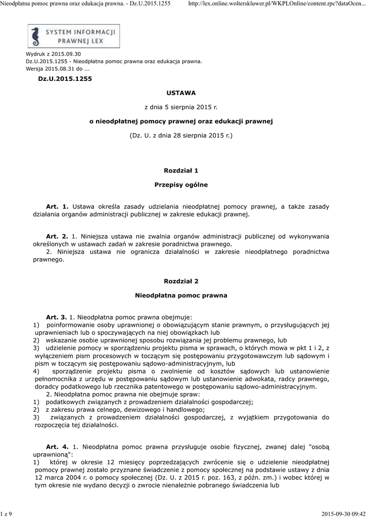 Nieodpłatna pomoc prawna oraz edukacja prawna. - Dz.U.2015.1255 1z9 http://lex.online.wolterskluwer.pl/WKPLOnline/content.rpc?dataOcen... Wydruk z 2015.09.30 Dz.U.2015.1255 - Nieodpłatna pomoc prawna oraz edukacja prawna. Wersja 2015.08.31 do ... Dz.U.2015.1255 USTAWA z dnia 5 sierpnia 2015 r. o nieodpłatnej pomocy prawnej oraz edukacji prawnej (Dz. U. z dnia 28 sierpnia 2015 r.) Rozdział 1 Przepisy ogólne Art. 1. Ustawa określa zasady udzielania nieodpłatnej pomocy prawnej, a także zasady działania organów administracji publicznej w zakresie edukacji prawnej. Art. 2. 1. Niniejsza ustawa nie zwalnia organów administracji publicznej od wykonywania określonych w ustawach zadań w zakresie poradnictwa prawnego. 2. Niniejsza ustawa nie ogranicza działalności w zakresie nieodpłatnego poradnictwa prawnego. Rozdział 2 Nieodpłatna pomoc prawna Art. 3. 1. Nieodpłatna pomoc prawna obejmuje: 1) poinformowanie osoby uprawnionej o obowiązującym stanie prawnym, o przysługujących jej uprawnieniach lub o spoczywających na niej obowiązkach lub 2) wskazanie osobie uprawnionej sposobu rozwiązania jej problemu prawnego, lub 3) udzielenie pomocy w sporządzeniu projektu pisma w sprawach, o których mowa w pkt 1 i 2, z wyłączeniem pism procesowych w toczącym się postępowaniu przygotowawczym lub sądowym i pism w toczącym się postępowaniu sądowo-administracyjnym, lub 4) sporządzenie projektu pisma o zwolnienie od kosztów sądowych lub ustanowienie pełnomocnika z urzędu w postępowaniu sądowym lub ustanowienie adwokata, radcy prawnego, doradcy podatkowego lub rzecznika patentowego w postępowaniu sądowo-administracyjnym. 2. Nieodpłatna pomoc prawna nie obejmuje spraw: 1) podatkowych związanych z prowadzeniem działalności gospodarczej; 2) z zakresu prawa celnego, dewizowego i handlowego; 3) związanych z prowadzeniem działalności gospodarczej, z wyjątkiem przygotowania do rozpoczęcia tej działalności. Art. 4. 1. Nieodpłatna pomoc prawna przysługuje osobie fizycznej, zwanej dalej "osobą uprawnioną": 1) której w okresie 12 miesięcy poprzedzających zwrócenie się o udzielenie nieodpłatnej pomocy prawnej zostało przyznane świadczenie z pomocy społecznej na podstawie ustawy z dnia 12 marca 2004 r. o pomocy społecznej (Dz. U. z 2015 r. poz. 163, z późn. zm.) i wobec której w tym okresie nie wydano decyzji o zwrocie nienależnie pobranego świadczenia lub 2015-09-30 09:42 Nieodpłatna pomoc prawna oraz edukacja prawna. - Dz.U.2015.1255 2z9 http://lex.online.wolterskluwer.pl/WKPLOnline/content.rpc?dataOcen... 2) która posiada ważną Kartę Dużej Rodziny, o której mowa w ustawie z dnia 5 grudnia 2014 r. o Karcie Dużej Rodziny (Dz. U. poz. 1863), lub 3) która uzyskała zaświadczenie, o którym mowa w ustawie z dnia 24 stycznia 1991 r. o kombatantach oraz niektórych osobach będących ofiarami represji wojennych i okresu powojennego (Dz. U. z 2014 r. poz. 1206 oraz z 2015 r. poz. 693), lub 4) która posiada ważną legitymację weterana albo legitymację weterana poszkodowanego, o których mowa w ustawie z dnia 19 sierpnia 2011 r. o weteranach działań poza granicami państwa (Dz. U. Nr 205, poz. 1203), lub 5) która nie ukończyła 26 lat, lub 6) która ukończyła 65 lat, lub 7) która w wyniku wystąpienia klęski żywiołowej, katastrofy naturalnej lub awarii technicznej znalazła się w sytuacji zagrożenia lub poniosła straty. 2. Prawo do nieodpłatnej pomocy prawnej osoba uprawniona, o której mowa w: 1) ust. 1 pkt 1 - wykazuje przez przedłożenie oryginału albo odpisu decyzji o przyznaniu świadczenia z pomocy społecznej lub zaświadczenia o udzieleniu świadczenia, o którym mowa w art. 106 ust. 2 ustawy z dnia 12 marca 2004 r. o pomocy społecznej; 2) ust. 1 pkt 2 - wykazuje przez przedłożenie ważnej Karty Dużej Rodziny, o której mowa w ustawie z dnia 5 grudnia 2014 r. o Karcie Dużej Rodziny; 3) ust. 1 pkt 3 - wykazuje przez przedłożenie zaświadczenia, o którym mowa w ustawie z dnia 24 stycznia 1991 r. o kombatantach oraz niektórych osobach będących ofiarami represji wojennych i okresu powojennego; 4) ust. 1 pkt 4 - wykazuje przez przedłożenie ważnej legitymacji weterana albo legitymacji weterana poszkodowanego, o których mowa w ustawie z dnia 19 sierpnia 2011 r. o weteranach działań poza granicami państwa; 5) ust. 1 pkt 5 i 6 - wykazuje przez przedłożenie dokumentu stwierdzającego tożsamość; 6) ust. 1 pkt 7 - wykazuje przez złożenie oświadczenia, że zachodzi co najmniej jedna z okoliczności wymienionych w tym przepisie. 3. Osoba uprawniona, o której mowa w ust. 1 pkt 1, przed uzyskaniem nieodpłatnej pomocy prawnej składa pisemne oświadczenie, że nie wydano wobec niej decyzji o zwrocie nienależnie pobranego świadczenia. 4. Osobie uprawnionej, o której mowa w ust. 1 pkt 1-6, wymagającej niezwłocznego uzyskania nieodpłatnej pomocy prawnej w przypadku sytuacji kryzysowej lub zdarzenia losowego, nieodpłatna pomoc prawna jest udzielana na podstawie pisemnego oświadczenia, że jest ona uprawniona do jej uzyskania na podstawie ust. 1 pkt 1-6, a z uwagi na sytuację kryzysową lub zdarzenie losowe nie jest w stanie przedstawić dokumentów wymienionych w ust. 2 pkt 1-5. 5. Oświadczenia, o których mowa w ust. 2 pkt 6 oraz ust. 3 i 4, osoba uprawniona składa udzielającemu nieodpłatnej pomocy prawnej pod rygorem odpowiedzialności karnej za złożenie fałszywego oświadczenia. Składający oświadczenie jest obowiązany do zawarcia w nich klauzuli o następującej treści: "Jestem świadomy odpowiedzialności karnej za złożenie fałszywego oświadczenia.". Klauzula ta zastępuje pouczenie organu o odpowiedzialności karnej za złożenie fałszywego oświadczenia. 6. Oświadczenia, o których mowa w ust. 2 pkt 6 oraz ust. 3 i 4, przechowuje się w warunkach uniemożliwiających dostęp do nich osób trzecich. 7. Starosta jest administratorem danych osobowych zawartych w oświadczeniach, o któryc