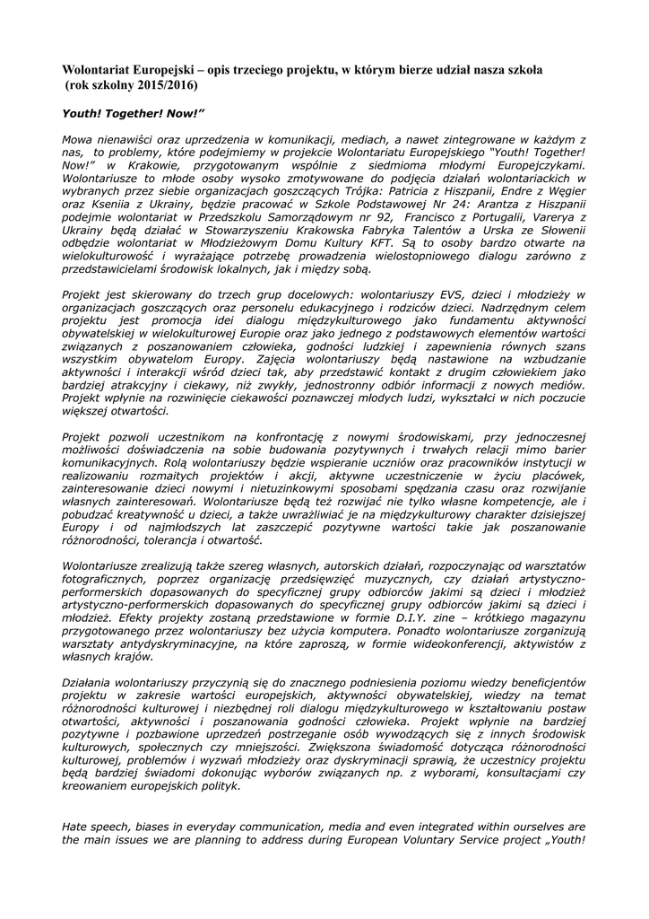 Wolontariat Europejski – opis trzeciego projektu, w którym bierze udział nasza szkoła (rok szkolny 2015/2016) Youth! Together! Now!” Mowa nienawiści oraz uprzedzenia w komunikacji, mediach, a nawet zintegrowane w każdym z nas, to problemy, które podejmiemy w projekcie Wolontariatu Europejskiego “Youth! Together! Now!” w Krakowie, przygotowanym wspólnie z siedmioma młodymi Europejczykami. Wolontariusze to młode osoby wysoko zmotywowane do podjęcia działań wolontariackich w wybranych przez siebie organizacjach goszczących Trójka: Patricia z Hiszpanii, Endre z Węgier oraz Kseniia z Ukrainy, będzie pracować w Szkole Podstawowej Nr 24: Arantza z Hiszpanii podejmie wolontariat w Przedszkolu Samorządowym nr 92, Francisco z Portugalii, Varerya z Ukrainy będą działać w Stowarzyszeniu Krakowska Fabryka Talentów a Urska ze Słowenii odbędzie wolontariat w Młodzieżowym Domu Kultury KFT. Są to osoby bardzo otwarte na wielokulturowość i wyrażające potrzebę prowadzenia wielostopniowego dialogu zarówno z przedstawicielami środowisk lokalnych, jak i między sobą. Projekt jest skierowany do trzech grup docelowych: wolontariuszy EVS, dzieci i młodzieży w organizacjach goszczących oraz personelu edukacyjnego i rodziców dzieci. Nadrzędnym celem projektu jest promocja idei dialogu międzykulturowego jako fundamentu aktywności obywatelskiej w wielokulturowej Europie oraz jako jednego z podstawowych elementów wartości związanych z poszanowaniem człowieka, godności ludzkiej i zapewnienia równych szans wszystkim obywatelom Europy. Zajęcia wolontariuszy będą nastawione na wzbudzanie aktywności i interakcji wśród dzieci tak, aby przedstawić kontakt z drugim człowiekiem jako bardziej atrakcyjny i ciekawy, niż zwykły, jednostronny odbiór informacji z nowych mediów. Projekt wpłynie na rozwinięcie ciekawości poznawczej młodych ludzi, wykształci w nich poczucie większej otwartości. Projekt pozwoli uczestnikom na konfrontację z nowymi środowiskami, przy jednoczesnej możliwości doświadczenia na sobie budowania pozytywnych i trwałych relacji mimo barier komunikacyjnych. Rolą wolontariuszy będzie wspieranie uczniów oraz pracowników instytucji w realizowaniu rozmaitych projektów i akcji, aktywne uczestniczenie w życiu placówek, zainteresowanie dzieci nowymi i nietuzinkowymi sposobami spędzania czasu oraz rozwijanie własnych zainteresowań. Wolontariusze będą też rozwijać nie tylko własne kompetencje, ale i pobudzać kreatywność u dzieci, a także uwrażliwiać je na międzykulturowy charakter dzisiejszej Europy i od najmłodszych lat zaszczepić pozytywne wartości takie jak poszanowanie różnorodności, tolerancja i otwartość. Wolontariusze zrealizują także szereg własnych, autorskich działań, rozpoczynając od warsztatów fotograficznych, poprzez organizację przedsięwzięć muzycznych, czy działań artystycznoperformerskich dopasowanych do specyficznej grupy odbiorców jakimi są dzieci i młodzież artystyczno-performerskich dopasowanych do specyficznej grupy odbiorców jakimi są dzieci i młodzież. Efekty projekty zostaną przedstawione w formie D.I.Y. zine – krótkiego magazynu przygotowanego przez wolontariuszy bez użycia komputera. Ponadto wolontariusze zorganizują warsztaty antydyskryminacyjne, na które zaproszą, w formie wideokonferencji, aktywistów z własnych krajów. Działania wolontariuszy przyczynią się do znacznego podniesienia poziomu wiedzy beneficjentów projektu w zakresie wartości europejskich, aktywności obywatelskiej, wiedzy na temat różnorodności kulturowej i niezbędnej roli dialogu międzykulturowego w kształtowaniu postaw otwartości, aktywności i poszanowania godności człowieka. Projekt wpłynie na bardziej pozytywne i pozbawione uprzedzeń postrzeganie osób wywodzących się z innych środowisk kulturowych, społecznych czy mniejszości. Zwiększona świadomość dotycząca różnorodności kulturowej, problemów i wyzwań młodzieży oraz dyskryminacji sprawią, że uczestnicy projektu będą bardziej świadomi dokonując wyborów związanych np. z wyborami, konsultacjami czy kreowaniem europejskich polityk. Hate speech, biases in everyday communication, media and even integrated within ourselves are the main issues we are planning to address during European Voluntary Service project „Youth! Together! Now!” in Krakow, organised together with seven young Europeans. Volunteers are young persons, highly motivated to undertake voluntary service in the chosen institutions. Three of them: Patricia from Spain, Endre from Hungary and Kseniia from Ukraine will work in Primary School no 24; Arantza from Spain will work in Local Kindergarten no 92, Francisco from Portugal and Varerya from Ukraine will perform their activities in Association Krakow Talent Factory and Urska from Slovenia will perform voluntary service in Cultural Centre of KTF. They are all very open towards multiculturalism and are expressing the need to introduce dialogue both with representatives of local community and between themselves. The project is directed to three target groups: EVS volunteers, children and youth in the host organisations and the educational staff and parents of children. The main aim of the project is to promote the idea of intercultural dialogue as a foundation for active citizenship in a multicultural Europe, and as one of the basic values associated with respect for human dignity that can ensure equal opportunities for all citizens of Europe. Volunteers’ activities will be aimed to enhance activity and interaction among children in a way to show contact with other people as more attractive and interesting than a plain, one-sided receipt of information from new media. The project will affect the development of cognitive curiosity of young people and their openness towards other cultures. The project will allow participants to indulge in new environments while being able to experie