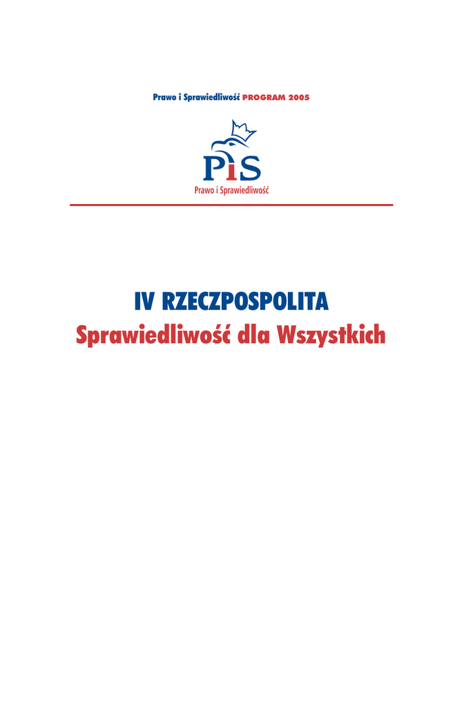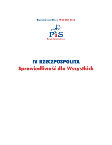 Prawo i Sprawiedliwość PROGRAM 2005 IV RZECZPOSPOLITA Sprawiedliwość dla Wszystkich 2 Jarosław Kaczyński: „IV Rzeczpospolita – Sprawiedliwość dla Wszystkich” jak każdy poważny program polityczny wynika z dążenia do realizacji celów, które wyrastają z najgłębszych przekonań środowiska, które program prezentuje, z przeświadczeń wyrastających z wyznawanego systemu wartości. 3 IV RZECZPOSPOLITA Sprawiedliwość dla Wszystkich Dla nas, członków Prawa i Sprawiedliwości, podstawowym przeświadczeniem, z którego wynikają w ten czy inny sposób wszystkie pozostałe, jest mocne przekonanie o tym, że Polska jest wartością, że warto być Polakiem i trzeba uczynić wszystko, by nasz naród rozwijał się, by wnosił coraz więcej do wspólnego europejskiego dorobku, by istniało niepodległe Państwo Polskie, w którym w środku Europy żyją w poczuciu bezpieczeństwa szczęśliwi ludzie. Więcej, chcemy by Polska stawała się, w sposób niemożliwy do zakwestionowania przez nikogo, jednym z najbardziej znaczących krajów naszego kontynentu. Powinniśmy chcieć być wielkim narodem. I nie powinniśmy nigdy zapominać, że to jest cel, który przybliżamy albo oddalamy każdego dnia. Jesteśmy głęboko przekonani, że są szanse na realizacje tego celu, że to wszystko co Polacy uczynili w swych najnowszych dziejach, w tym także w ciągu ostatnich 25 lat, otworzyło do tego drogę. Dostrzegamy także zagrożenia. Zjawiska, które mogą być przeszkodą na naszej drodze, a nawet godzić w trwałość dotychczasowego dorobku. Nasz program to odpowiedź na pytanie, które musi postawić sobie dziś każdy świadomy obywatel: jak wykorzystać szansę i uchylić zagrożenia? Nasz program, proponuje dwa podstawowe, odrębne, choć łączące się ze sobą zespoły działań. Pierwszy to napraw państwa, drugi to nowa polityka gospodarcza. Na zespół pierwszy składają się działania opisane w rozdziałach 1, 2, 3 (Państwo, Bezpieczeństwo i Polityka zagraniczna). Nowa polityka gospodarcza to działania opisane w po- 4 IV RZECZPOSPOLITA Sprawiedliwość dla Wszystkich zostałych rozdziałach. Odnoszą się one nie tylko do gospodarki sensu stricto, ale tez do szeroko rozumianej sfery społecznej. Są rzecz jasna takie dziedziny, w których łączą się kwestie odnoszące się do spraw publicznych, gospodarki i spraw społecznych. Postanowiliśmy je umieścić w części – nowa polityka gospodarcza, gdyż możliwości pozytywnych działań w tych sferach są w dużej mierze zależne od sytuacji ekonomicznej. Program ma charakter integralny i jego najskuteczniejszą realizację można przeprowadzić wtedy, gdy będzie realizowany w całości. Program składa się z poszczególnych rozdziałów sektorowych, z których każdy jest odrębną całością. Stąd pojawiające się w kilku wypadkach powtórzenia. Postanowiliśmy przyjąć taki charakter poszczególnych rozdziałów, gdyż mogą być one przedmiotem odrębnego zainteresowania i związanych z nim analiz. Poszczególne rozdziały są w większości wypadków skrótami znacznie obszerniejszych opracowań przygotowanych przez PIS. Nasz program „IV RZECZPOSPOLITA – Sprawiedliwość dla Wszystkich” ma poparcie kandydata na Prezydenta RP Lecha Kaczyńskiego, który zapowiedział, iż jako Prezydent będzie czynnie zabiegał o jego realizację. Jarosław Kaczyński Prezes PiS 5 Wprowadzenie – Jarosław Kaczyński Polska nowej umowy społecznej – szanse i zagrożenia „Gruntowna przebudowa państwa, zasadnicza reorientacja polskiej polityki społeczno-ekonomicznej wraz z przywróceniem jej moralnego wymiaru jest sprawą najwyższej wagi.” 6 Wprowadzenie Polska nowej umowy społecznej – szanse i zagrożenia Stajemy, jako Polacy wobec zasadniczej decyzji: czy podtrzymać politykę, która prowadzi do kryzysu, czy też wybrać drogę sprawiedliwości i rozwoju. Wybierając zmianę, damy Narodowi szansę na pomyślność i godziwe życie na miarę dużego europejskiego państwa. Jeśli wybierzemy politykę kontynuacji i prowadzące do kryzysu tendencje nie zostaną powstrzymane, to kraj nasz może zostać zdegradowany do roli niewiele znaczącego państwa o peryferyjnej gospodarce. Zagrożone będą wówczas podstawy naszego narodowego bytu. Na niebezpieczeństwo, które zawisło nad Polską, składa się kilka nakładających się na siebie od kilkunastu lat procesów. Trudna sytuacja, w jakiej Polska obecnie się znajduje ma korzenie, tak w wyborze błędnej drogi transformacji po zmianie systemowej 1989 roku, jak i w politycznych decyzjach ówczesnych elit, które zamiast zerwania z obciążającym państwo polskie dziedzictwem PRL, zdecydowały się na politykę kontynuacji. Beneficjentami budowanego w takich warunkach kapitalizmu stali się niezasłużenie uprzywilejowani na starcie ludzie dawnego porządku. Polska Ludowa była, jak każde niedemokratyczne państwo, krajem głęboko spatologizowanym. Było więc oczywiste, że nie zrywając ze starym systemem III Rzeczpospolita musi przejąć wiele z jego ułomności, które z kolei wypaczą rodzące się instytucje wolnej i demokratycznej Polski. I tak się stało. Dostaliśmy w spadku po PRL stary aparat państwowy oraz nieformalne układy i grupy interesów, wyrosłe często na wpływach i tajnych powiązaniach peerelowskich służb specjalnych i ich styku ze światem przestępczym. W wyniku tego powstała ustrojowa hybryda, jaką jest postkomunizm. Zamiast powszechnego kapitalizmu otrzymaliśmy postkomunistyczny kapitalizm polityczny. Taki obrót spraw musiał mieć swoje konsekwencje. Jedną z jego ofiar zostało państwo polskie. Tym, którzy korzystali z opanowania życia polityczno-gospodarczego przez nieformalne i często przenikające się układy, koterie i grupy interesów, w tym dwie potężne grupy nacisku: lobby bankowe oraz importerskie, nie zależało na zbudowaniu silnego, sprawnego i uczciwego państwa. Nielicznych dążącyc