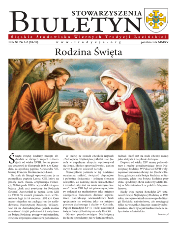 Biuletyn STOWARZYSZENIA Ś l ą s k i e Ś r o d o w i s k o Rok XI Nr 1-2 (94-95) W i e r n y c h Tr a d y c j i w w w . t r a d y c j a . o r g Ł a c i ń s k i e j październik MMXV Rodzina Święta Ś więto świętej Rodziny zaczęto obchodzić w różnych krajach i diecezjach od wieku XVIII. Po raz pierwszy ustanowił je 4 listopada 1684 r. w Kanadzie, za aprobatą papieża Aleksandra VII, biskup Francois Montmorency-Laval. Na stałe do liturgii wprowadzono je za pontyfikatu papieża Leona XIII, który na prośbę kard. Bausa, arcybiskupa Florencji, 20 listopada 1890 r. wydał dekret aprobujący „kult czci zwrócony ku Rodzinie Świętej”. Zatwierdził je papież Leon XIII (+ 1903). W swoich pismach, m.in. w Neminem fugit (z 14 czerwca 1892 r.) i Cum nuper niejeden raz zachęcał on do naśladowania Najświętszej Rodziny. Wskazywał też na dobrodziejstwa, jakich można oczekiwać dzięki pobożności i związkom ze Świętą Rodziną: postęp w miłosierdziu, świętość obyczajów, atmosfera pobożności. W jednej ze swoich encyklik napisał: „Pod opieką Najświętszej Matki i św. Józefa w zupełnym ukryciu wychowywał się Jezus, Słońce sprawiedliwości, zanim swym blaskiem oświecił narody. Niewątpliwie jaśniała w tej Rodzinie wzajemna miłość, świętość obyczajów i pobożne ćwiczenia - jednym słowem wszystko, co rodzinę może uszlachetnić i ozdobić, aby dać na wzór naszym czasom”. Leon XIII był też pierwszym, który wskazał na małżeństwo jako miejsce uświęcenia (Arcanum divinae sapientiae), nadrabiając wielowiekowy brak spojrzenia na rodzinę jako na miejsce postępu duchowego i służby w Kościele. Papież Benedykt XV (+ 1922) rozszerzył święto Świętej Rodziny na cały Kościół. Obrazy przedstawiające Najświętszą Rodzinę spotykamy już w katakumbach. Jednak Józef jest na nich obecny raczej jako statysta i na planie dalszym. Dopiero od wieku XIV mamy pełne obrazy i rzeźby przedstawiające życie Najświętszej Rodziny. W Polsce od XVII w słyną nawet cudowne obrazy: św. Józefa w Kaliszu, gdzie jest cała Święta Rodzina, w Studziannie, gdzie jest Święta Rodzina przy stole, i podobny obraz cudowny Matki Bożej w Miedniewicach w pobliżu Niepokalanowa. Kiedy więc papież Benedykt XV ustanowił święto Najświętszej Rodziny w 1921 roku, nie wprowadzał on nowego do liturgii Kościoła nabożeństwa, ale rozciągnął tylko na wszystkie diecezje i narody nabożeństwo, które było już bardzo znane w całym świecie katolickim. brewiarz.pl Nawrócenie Świętego Pawła S zaweł urodził się w Tarsie około 5-10 roku po Chrystusie. Pochodził z żydowskiej rodziny silnie przywiązanej do tradycji. Byli niewolnikami, którzy zostali wyzwoleni. Szaweł odziedziczył po nich obywatelstwo rzymskie. Uczył się rzemiosła - tkania płótna namiotowego. Później przybył do Jerozolimy, aby studiować Torę. Być może był uczniem Gamaliela. Gorliwość w strzeżeniu tradycji religij- Śląskie Środowisko Wiernych Tradycji Łacińskiej w w w. t r a d y c j a . o r g nr rachunku bankowego: 93 2030 0045 1110 0000 0139 5910 IBAN: PL93 2030 0045 1110 0000 0139 5910 SWIFT: GOPZPLPW KRS: 0000273473 NIP: 6262888863 REGON: 240612697 Opracowanie graficzne i skład biuletynu: Daniel Zając 2 nej sprawiła, że mając około 25 lat stał się zdecydowanym przeciwnikiem i prześladowcą Kościoła. Uczestniczył jako świadek w kamienowaniu św. Szczepana. Około 35 roku z własnej woli udał się z listami polecającymi do Damaszku (Dz 9, 1n; Ga 1, 1516), aby tam ścigać chrześcijan. W Dziejach Apostolskich czytamy: Gdy zbliżał się już w swojej podróży do Damaszku, olśniła go nagle światłość z nieba. A gdy upadł na ziemię, usłyszał głos, który mówił: „Szawle, Szawle, dlaczego Mnie prześladujesz?” Powiedział: „Kto jesteś, Panie?” A On: „Ja jestem Jezus, którego ty prześladujesz. Wstań i wejdź do miasta, tam ci powiedzą, co masz czynić”. Ludzie, którzy mu towarzyszyli w drodze, oniemieli ze zdumienia, słyszeli bowiem głos, lecz nie widzieli nikogo. Szaweł podniósł się z ziemi, a kiedy otworzył oczy, nic nie widział. Wprowadzili go więc do Damaszku, trzymając za ręce. Przez trzy dni nic nie widział i ani nie jadł, ani nie pił. W Damaszku znajdował się pewien uczeń, imieniem Ananiasz. Pan przemówił do niego w widzeniu: „Ananiaszu!” A on odrzekł: „Jestem, Panie!” A Pan do niego: „Idź na ulicę Prostą i zapytaj w domu Judy o Szawła z Tarsu, bo właśnie się modli”. (I ujrzał w widzeniu, jak człowiek imieniem Ananiasz wszedł i położył na nim ręce, aby przejrzał). Odpowiedział Ananiasz: „Panie, słyszałem z wielu stron jak dużo złego wyrządził ten człowiek świętym Twoim w Jerozolimie. I ma on także władzę od arcykapłanów więzić tutaj wszystkich, którzy wzywają Twego imienia”. Odpowiedział mu Pan: „Idź, bo wybrałem sobie tego człowieka za narzędzie. On zaniesie imię moje do pogan i królów i do synów Izraela. I pokażę mu, jak wiele będzie musiał wycierpieć dla mego imienia”. Wtedy Ananiasz poszedł. Wszedł do domu, położył na nim ręce i powiedział: „Szawle, bracie, Pan Jezus, który ukazał ci się na drodze, którą szedłeś, przysłał mnie, abyś przejrzał i został napełniony Duchem Świętym”. Natychmiast jakby łuski spadły z jego oczu i odzyskał wzrok, i został ochrzczony. A gdy go nakarmiono, odzyskał siły. Jakiś czas spędził z uczniami w Damaszku i zaraz zaczął głosić w synagogach, że Jezus jest Synem Bożym. Wszyscy, którzy go słyszeli, mówili zdumieni: „Czy to nie ten sam, który w Jerozolimie prześladował wyznawców tego imienia i po to tu przybył, aby ich uwięzić i zaprowadzić do arcykapłana?” A Szaweł występował coraz odważniej, dowodząc, że Ten jest Mesjaszem, i szerzył zamieszanie wśród Żydów mieszkających w Damaszku. (Dz 9, 1-22) Po trzech latac