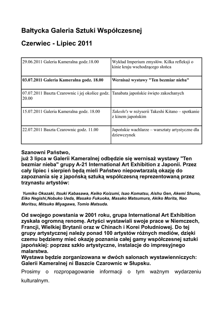 Bałtycka Galeria Sztuki Współczesnej Czerwiec - Lipiec 2011 29.06.2011 Galeria Kameralna godz.18.00 Wykład Imperium zmysłów. Kilka refleksji o kinie kraju wschodzącego słońca 03.07.2011 Galeria Kameralna godz. 18.00 Wernisaż wystawy "Ten bezmiar nieba" 07.07.2011 Baszta Czarownic i jej okolice godz. Tanabata japońskie święto zakochanych 20.00 15.07.2011 Galeria Kameralna godz. 18.00 Takeshi's w reżyserii Takeshi Kitano – spotkanie z kinem japońskim 22.07.2011 Baszta Czarownic godz. 11.00 Japońskie wachlarze – warsztaty artystyczne dla dziewczynek Szanowni Państwo, już 3 lipca w Galerii Kameralnej odbędzie się wernisaż wystawy "Ten bezmiar nieba" grupy A-21 International Art Exhibition z Japonii. Przez cały lipiec i sierpień będą mieli Państwo niepowtarzalą okazję do zapoznania się z japońską sztuką współczesną reprezentowaną przez trzynastu artystów: Yumiko Okazaki, Itsuki Kabasawa, Keiko Koizumi, Isao Komatsu, Aishu Gen, Akemi Shuno, Eiko Negishi,Nobuko Ueda, Masako Fukuoka, Masako Matsumura, Akiko Morita, Nao Moritsu, Mitsuko Miyagawa, Tomio Matsuda. Od swojego powstania w 2001 roku, grupa International Art Exhibition zyskała ogromną renomę. Artyści wystawiali swoje prace w Niemczech, Francji, Wielkiej Brytanii oraz w Chinach i Korei Południowej. Do tej grupy artystycznej należy ponad 100 artystów różnych mediów, dzięki czemu będziemy mieć okazję poznania całej gamy współczesnej sztuki japońskiej: poprzez szkło artystyczne, instalacje do impresyjnego malarstwa. Wystawa będzie zorganizowana w dwóch salonach wystawienniczych: Galerii Kameralnej ni Baszcie Czarownic w Słupsku. Prosimy o kulturalnym. rozpropagowanie informacji o tym ważnym wydarzeniu