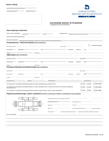 Numer szkody NUMER SZKODY (NADANY PRZEZ TOWARZYSTWO) DATA PRZYJĘCIA ZGŁOSZENIA GODZINA ZGŁ. (GG : MM) ZGŁOSZENIE SZKODY W POJEŹDZIE z ubezpieczenia AUTOCASCO Dane dotyczące zdarzenia DATA I GODZ. ZDARZENIA (DD / MM / RRRR) NUMER POLISY: (GG : MM) NUMER POLISY, Z KTÓREJ ZGŁASZANA JEST SZKODA PRZYCZYNA POWSTANIA SZKODY: MIEJSCE ZDARZENIA: ( MIEJSCOWOŚĆ, ULICA, NUMER BUDYNKU, NUMER LOKALU LUB GMINA, NUMER DROGI, NAJBLIŻSZA MIEJSCOWOŚĆ) Poszkodowany - właściciel pojazdu (dane kontaktowe) WSPÓŁWŁASNOŚĆ IMIĘ NAZWISKO / NAZWA KOD POCZTOWY PESEL / REGON MIEJSCOWOŚĆ ULICA TELEFON NR BUDYNKU NR LOKALU GMINA ADRES E-MAIL Zgłaszający (dane kontaktowe) IMIĘ NAZWISKO / NAZWA KOD POCZTOWY PESEL / REGON MIEJSCOWOŚĆ ULICA TELEFON NR BUDYNKU NR LOKALU GMINA ADRES E-MAIL Kierujący pojazdem poszkodowanego (dane kontaktowe) IMIĘ NAZWISKO KOD POCZTOWY PESEL / REGON MIEJSCOWOŚĆ ULICA TELEFON NR PRAWA JAZDY (5.) NR BUDYNKU NR LOKALU GMINA ADRES E-MAIL KATEGORIA DATA WYDANIA (4a.) WYDANE PRZEZ (4c.) CZY KIERUJĄCY POJAZDEM POSZKODOWANEGO W CHWILI ZDARZENIA MIAŁ ZAPIĘTE PASY? TAK NIE NIE WIEM CZY KIERUJĄCY POJAZDEM POSZKODOWANEGO W CHWILI ZDARZENIA BYŁ W STANIE PO SPOŻYCIU ALKOHOLU, ŚRODKÓW ODURZAJĄCYCH? TAK NIE NIE WIEM CZY KIERUJĄCY POJAZDEM POSZKODOWANEGO POSIADAŁ WAŻNE PRAWO JAZDY W DNIU ZDARZENIA? TAK NIE NIE WIEM Pojazd poszkodowanego, zakres uszkodzeń (prosimy o zaznaczenie znakiem X uszkodzonych części pojazdu) RODZAJ POJAZDU (NP. SAMOCHÓD OSOBOWY, CIĘŻAROWY,) NUMER REJESTRACYJNY [A] NUMER NADWOZIA [E] MARKA [D.1] TYP [D.2] MODEL [D.3] DATA PIERWSZEJ REJESTRACJI [B] ROK PRODUKCJI DATA WAŻNOŚCI BADANIA TECHNICZNEGO POJEMNOŚĆ SILNIKA [P] PRZEZNACZENIE (PRYWATNE / ZAROBKOWE / MIESZANE) OPIS USZKODZEŃ DZSACPOJv150507 str.1/5 Pojazd poszkodowanego, zakres uszkodzeń CZY POJAZD POSZKODOWANEGO JEST ZDATNY DO JAZDY?: TAK NIE NIE WIEM CZY POJAZD POSZKODOWANEGO ZOSTAŁ ODHOLOWANY Z MIEJSCA ZDARZENIA?: TAK NIE NIE WIEM MIEJSCE POSTOJU POJAZDU: ( MIEJSCOWOŚĆ, ULICA, NUMER BUDYNKU, NUMER LOKALU LUB GMINA, NUMER DROGI, NAJBLIŻSZA MIEJSCOWOŚĆ) Polisy poszkodowanego POLISA OC POLISA AC SYMBOL I NR POLISY NAZWA ZAKŁADU UBEZPIECZEŃ OKRES UBEZPIECZENIA SYMBOL I NR POLISY NAZWA ZAKŁADU UBEZPIECZEŃ OKRES UBEZPIECZENIA SUMA UBEZPIECZENIA Właściciel pojazdu sprawcy (dane kontaktowe) IMIĘ NAZWISKO / NAZWA KOD POCZTOWY PESEL / REGON MIEJSCOWOŚĆ ULICA NR BUDYNKU NR LOKALU GMINA ADRES E-MAIL TELEFON Kierujący pojazdem sprawcy (dane kontaktowe) IMIĘ NAZWISKO PESEL KOD POCZTOWY MIEJSCOWOŚĆ ULICA TELEFON NR BUDYNKU NR LOKALU GMINA ADRES E-MAIL NR PRAWA JAZDY (5.) KATEGORIA (9) WYDANE PRZEZ (4c.) DATA WYDANIA (4a.) CZY KIERUJĄCY POJAZDEM SPRAWCY W CHWILI ZDARZENIA BYŁ W STANIE PO SPOŻYCIU ALKOHOLU, ŚRODKÓW ODURZAJĄCYCH?: TAK NIE NIE WIEM CZY KIERUJĄCY POJAZDEM SPRAWCY ZBIEGŁ Z MIEJSCA ZDARZENIA?: TAK NIE NIE WIEM CZY KIERUJĄCY POJAZDEM SPRAWCY POSIADAŁ WAŻNE PRAWO JAZDY W DNIU ZDARZENIA?: TAK NIE NIE WIEM SPOSÓB UKARANIA SPRAWCY?: BRAK MANDAT INNY: JAKI Pojazd sprawcy, zakres uszkodzeń (prosimy o zaznaczenie znakiem X uszkodzonych części pojazdu) RODZAJ POJAZDU (NP. SAMOCHÓD OSOBOWY, CIĘŻAROWY,) KOLOR NUMER REJESTRACYJNY [A] NUMER NADWOZIA [E] MARKA [D.1] TYP [D.2] MODEL [D.3] DATA PIERWSZEJ REJESTRACJI [B] ROK PRODUKCJI DATA WAŻNOŚCI BADANIA TECHNICZNEGO POJEMNOŚĆ SILNIKA [P] PRZEZNACZENIE (PRYWATNE / ZAROBKOWE / MIESZANE) OPIS USZKODZEŃ Polisa OC sprawcy (dla Bezpośredniej Likwidacji Szkód) ZAKŁAD UBEZPIECZEŃ NAZWA ZAKŁADU UBEZPIECZEŃ NR POLISY SYMBOL I NR POLISY OKRES UBEZPIECZENIA: OKRES UBEZPIECZENIA OD - DO DZSACPOJv150507 str.2/5 Opis zdarzenia i szkic DOKŁADNY OPIS PRZEBIEGU ZDARZENIA W TYM: PRZYCZYNA WYPADKU, SYTUACJA NA DRODZE, PRĘDKOŚĆ POJAZDÓW, ZACHOWANIE SIĘ UCZESTNIKÓW WYPADKU, KTO UDZIELIŁ PIERWSZEJ POMOCY, HOLOWANIA ITP.: SZKIC SYTUACYJNY Miejsce zdarzenia CZY TEREN ZABUDOWANY? TAK NIE DOPUSZCZALNA PRĘDKOŚĆ km/h MIEJSCE ZDARZENIA MIEJSCOWOŚĆ, ULICA,SKRZYŻOWANIE, RONDO MIEJSCOWOŚĆ, ULICA,SKRZYŻOWANIE, RONDO (CD) NAJBLIŻSZA MIEJSCOWOŚĆ W TERENIE NIEZABUDOWANYM ODLEGŁOŚĆ W KM PODAĆ NAZWĘ MIEJSCOWOŚCI TRASA PODAĆ TRASĘ Podmioty powiadomione o zaistniałym zdarzeniu POLICJA: NAZWA JEDNOSTKI KOD POCZTOWY MIEJSCOWOŚĆ TELEFON ULICA NR BUDYNKU NR LOKALU GMINA ADRES E-MAIL KTO POWIADOMIŁ POLICJĘ DATA I GODZINA POWIADOMIENIA STRAŻ POŻARNA: NAZWA JEDNOSTKI KOD POCZTOWY MIEJSCOWOŚĆ TELEFON ULICA NR BUDYNKU NR LOKALU GMINA ULICA NR BUDYNKU NR LOKALU GMINA ULICA NR BUDYNKU NR LOKALU GMINA ADRES E-MAIL POGOTOWIE RATUNKOWE: NAZWA JEDNOSTKI KOD POCZTOWY MIEJSCOWOŚĆ TELEFON ADRES E-MAIL INNE: NAZWA KOD POCZTOWY MIEJSCOWOŚĆ TELEFON ADRES E-MAIL Warunki drogowe RODZAJ NAWIERZCHNI: ASFALTOWA BETONOWA ŻWIROWA GRUNTOWA STAN NAWIERZCHNI: SUCHA MOKRA OBLODZONA INNE: NASILENIE RUCHU: DUŻE ŚREDNIE MAŁE PORA DNIA: ŚWIT DZIEŃ ZMIERZCH NOC WARUNKI POGODOWE: DOBRE DESZCZ ŚNIEG MGŁA WIDOCZNOŚĆ: DOBRA OGRANICZONA KOSTKA BRUKOWA INNY: INNE: DZSACPOJv150507 str.3/5 Szkody poza pojazdem CZY SĄ SZKODY RZECZOWE? TAK NIE CZY SĄ OSOBY RANNE? TAK NIE JEŻELI TAK, TO JAKIE? CZY SĄ OFIARY ŚMIERTELNE? TAK NIE Świadkowie zdarzenia (adres zamieszkania, dane kontaktowe) ŚWIADEK 1: IMIĘ NAZWISKO KOD POCZTOWY PESEL MIEJSCOWOŚĆ TELEFON ULICA NR BUDYNKU NR LOKALU GMINA ADRES E-MAIL ŚWIADEK 2: IMIĘ NAZWISKO KOD POCZTOWY PESEL MIEJSCOWOŚĆ TELEFON ULICA NR BUDYNKU NR LOKALU GMINA ADRES E-MAIL Pozostali uczestnicy zdarzenia UCZESTNIK 1: IMIĘ NAZWISKO KOD POCZTOWY PESEL MIEJSCOWOŚĆ TELEFON ULICA NR BUDYNKU ADRES E-MAIL NR LOKALU GMINA ROLA (KIERUJĄCY, PASAŻER, PIESZY, ROWERZYSTA, ITP.) UCZESTNIK 2: IMIĘ NAZWISKO KOD POCZTOWY PESEL MIEJSCOWOŚĆ TELEFON ULICA NR BUDYNKU ADRES E-MAIL NR LOKALU GMINA ROLA (KIERUJĄCY, PASAŻER, PIESZY, ROWERZYSTA, ITP.) Roszczenie LP TYP ROSZCZENIA KWOTA ROSZCZENIA 1. 2. 3. 4. 5. ŁĄCZNA KWOTA ROSZCZEŃ: Forma wypłaty odszkodowania – wypełnia poszkodowany (właściciel poja