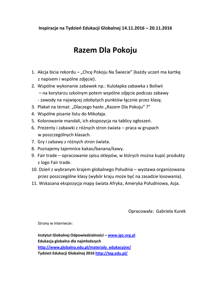 Inspiracje na Tydzień Edukacji Globalnej 14.11.2016 – 20.11.2016 Razem Dla Pokoju 1. Akcja bicia rekordu – „Chcę Pokoju Na Świecie” (każdy uczeń ma kartkę z napisem i wspólne zdjęcie). 2. Wspólne wykonanie zabawek np.: Kulołapka zabawka z Boliwii – na korytarzu szkolnym potem wspólne zdjęcie podczas zabawy - zawody na najwięcej zdobytych punktów łącznie przez klasę. 3. Plakat na temat: „Dlaczego hasło „Razem Dla Pokoju” ?” 4. Wspólne pisanie listu do Mikołaja. 5. Kolorowanie mandali, ich ekspozycja na tablicy ogłoszeń. 6. Prezenty i zabawki z różnych stron świata – praca w grupach w poszczególnych klasach. 7. Gry i zabawy z różnych stron świata. 8. Poznajemy tajemnice kakao/banana/kawy. 9. Fair trade – opracowanie spisu sklepów, w których można kupić produkty z logo Fair trade. 10. Dzień z wybranym krajem globalnego Południa – wystawa organizowana przez poszczególne klasy (wybór kraju może być na zasadzie losowania). 11. Wskazana ekspozycja mapy świata Afryka, Ameryka Południowa, Azja. Opracowała: Gabriela Kurek Strony w Internecie: Instytut Globalnej Odpowiedzialności – www.igo.org.pl Edukacja globalna dla najmłodszych http://www.globalna.edu.pl/materialy_edukacyjne/ Tydzień Edukacji Globalnej 2016 http://teg.edu.pl/ Instrukcja wykonania: http://www.globalna.edu.pl/boliwia/gry_i_zabawy/ cytuję: Enchoque, inaczej kulołapka Zaproponuj dzieciom wykonanie i zabawę enchoque (czyt. enczioke). Jest to bardzo popularna zabawka, a zarazem gra zręcznościowa w Boliwii. Oryginalne enchoque składa się z drewnianego kijka i drewnianej kuli połączonych sznurkiem. W kuli wydrążony jest otwór. Gracz trzyma kijek i stara się, podrzucając kulkę w powietrze, nadziać ją na patyk. Łatwiejsza, często dziś spotykana wersja zabawki składa się z połączonych: kulki i kielicha, do którego kulka powinna wskoczyć. Enchoque możemy zrobić domowym sposobem z papierowego lub plastikowego kubeczka np. po jogurcie, kawałka cienkiego sznurka (np. szpagatu, dratwy, kordonka) i folii aluminiowej (ew. z orzechem włoskim). Odetnij ok. 50-60 cm sznurka, końcówkę połóż na kawałku folii aluminiowej, a następnie zgnieć folię tak, by powstała kulka, a sznurek trzymał się w środku. Zrób grubą igłą lub szpikulcem otwór w dnie kubeczka, przewlecz nitkę i zawiąż pęczek. Enchoque gotowe! Można zacząć trenować!