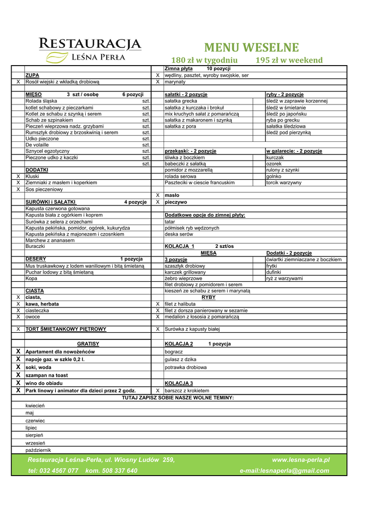 MENU WESELNE 180 zł w tygodniu X ZUPA Rosół wiejski z wkładką drobiową X X X MIĘSO 3 szt / osobę 6 pozycji Rolada śląska szt. kotlet schabowy z pieczarkami szt. Kotlet ze schabu z szynką i serem szt. Schab ze szpinakiem szt. Pieczeń wieprzowa nadz. grzybami szt. Rumsztyk drobiowy z brzoskwinią i serem szt. Udko pieczone szt. De volaille szt. Sznycel egzotyczny szt. Pieczone udko z kaczki szt. szt. DODATKI Kluski Ziemniaki z masłem i koperkiem Sos pieczeniowy SURÓWKI i SAŁATKI 4 pozycje Kapusta czerwona gotowana Kapusta biała z ogórkiem i koprem Surówka z selera z orzechami Kapusta pekińska, pomidor, ogórek, kukurydza Kapusta pekińska z majonezem i czosnkiem Marchew z ananasem Buraczki X X X X 195 zł w weekend Zimna płyta 10 pozycji wędliny, pasztet, wyroby swojskie, ser marynaty sałatki - 2 pozycje sałatka grecka sałatka z kurczaka i brokuł mix kruchych sałat z pomarańczą sałatka z makaronem i szynką sałatka z pora ryby - 2 pozycje śledź w zaprawie korzennej śledź w śmietanie śledź po japońsku ryba po grecku sałatka śledziowa śledź pod pierzynką przekąski: - 2 pozycje śliwka z boczkiem babeczki z sałatką pomidor z mozzarellą rolada serowa Paszteciki w ciescie francuskim w galarecie: - 2 pozycje kurczak ozorek rulony z szynki golnko torcik warzywny masło pieczywo Dodatkowe opcje do zimnej płyty: tatar półmisek ryb wędzonych deska serów KOLACJA 1 DESERY 1 pozycja Mus truskawkowy z lodem waniliowym i bitą śmietaną Puchar lodowy z bitą śmietaną Kopa 2 szt/os MIĘSA X X X X CIASTA ciasta, kawa, herbata ciasteczka owoce X X X 3 pozycje szaszłyk drobiowy karczek grillowany żebro wieprzowe filet drobiowy z pomidorem i serem kieszeń ze schabu z serem i marynatą RYBY filet z halibuta filet z dorsza panierowany w sezamie medalion z łososia z pomarańczą X TORT ŚMIETANKOWY PIĘTROWY X Surówka z kapusty białej X X X X X X Apartament dla nowożeńców bogracz napoje gaz. w szkle 0,2 l. gulasz z dzika soki, woda potrawka drobiowa GRATISY KOLACJA 2 Dodatki - 2 pozycje ćwiartki ziemniaczane z boczkiem frytki dufinki ryż z warzywami 1 pozycja szampan na toast wino do obiadu KOLACJA 3 Park linowy i animator dla dzieci przez 2 godz. X barszcz z krokietem TUTAJ ZAPISZ SOBIE NASZE WOLNE TEMINY: kwiecień maj czerwiec lipiec sierpień wrzesień październik Restauracja Leśna-Perła, ul. Wiosny Ludów 259, tel: 032 4567 077 kom. 508 337 640 www.lesna-perla.pl e-mail:[email protected]