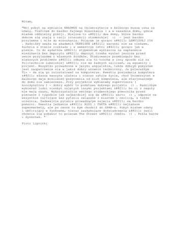 Witam, "Mój pobyt na wymianie ERASMUS na Uniwersytecie w Aalborgu muszę uzna za udany. Trafiłem do bardzo fajnego mieszkania ( a w zasadzie domu, gdzie miałem oddzielny pokój). Miejsce to – dwa domy, które bardzo dobrze się znają z racji interakcji studenckiej :) - jest bardzo przyjemne i miłe do mieszkania. Polecam je gorąco – LEMVIGVEJ 104 . Radziłby uważa na akademik TEKNISKE – warunki nie za ciekawe, kuchnia w stanie rozkładu i w semestrze letni – gorąco jak w piekle. Co do wydatków – stypendium wystarcza na zapłacenie mieszkania bez depozytu – depozyt trzeba wysłać jeszcze przed swoim przyjazdem z własnych środków. Studiowanie przebiegało bez większych problemów – odbywa się to trochę w inny sposób niż na Politechnice Lubelskiej – nie ma żadnych zaliczeń, są egzaminy i projekt. Wszystko prowadzone w języku angielskim, także dobrym pomysłem jest zaopatrzenie się w jakiś dobry słownik techniczny. Ja polecałbym TL+ - da się go zainstalować na komputerze. Kwestia posiadania komputera – własna maszyna ułatwia i nieraz ratuje życie, choć Uniwersytet w Aalborgu daje możliwość pożyczenia od nich komputera, ale stacjonarnego do domu nie zabierzesz. Przy projekcie wybieramy supervisora ( koordynatora ) - dobry wybór to podstawa dobrego projektu :) . Radziłbym wybierać ludzi niezbyt zajętych innymi projektami – bo ci z reguły nie mają czasu. Wykorzystajcie swojego studenckiego pomocnika przez pierwsze 2 tygodnie jak najbardziej się da – warto :) , odpowie na wszystkie nurtujące was pytania związane z miastem i okolicą, a także uczelnią. Zadawajcie pytania prowadzącym zajęcia – są bardzo pomocni. Kwestia jedzenia – ALDI i FAKTA – najtańsze supermarkety, ale po owoce to bym chodził do SPAR-a. Pobyt miałem udany i obfitujący w zyskowne, nieraz zaskakujące doświadczenia – jeśli chcecie się pobawić to polecam The Street – Jomfru :) . Pełna barów i dyskotek. " Piotr Lipnicki