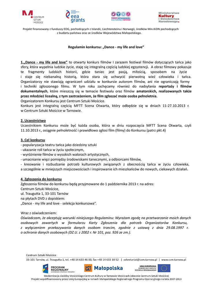 Projekt finansowany z funduszy EOG, pochodzących z Islandii, Liechtensteinu i Norwegii, środków Min.KiDN pochodzących z budżetu państwa oraz ze środków Województwa Małopolskiego. Regulamin konkursu: „Dance - my life and love” 1.„Dance - my life and love” to otwarty konkurs filmów I zarazem festiwal filmów dotyczących tańca jako sfery, która wypełnia ludzkie życie, staję się integralną częścią ludzkiej egzystencji. A obraz filmowy pokazuje te fragmenty ludzkich historii, gdzie taniec jest pasją, miłością, sposobem na życie i staje się niebanalną historią, która stara się uchwycić pierwotną wieź człowieka i tańca. Organizatorzy nie stawiają ograniczeń udziału w konkursie autorom filmów, ani nie ograniczają formy i techniki zgłoszonego filmu. W tym roku zachęcamy również do nadsyłania reportaży i filmów dokumentalnych, które mieszczą się w temacie festiwalu oraz filmów amatorskich, realizowanych także przez młodzież licealną, z tym zastrzeżeniem, że film zgłaszać może osoba pełnoletnia. Organizatorem Konkursu jest Centrum Sztuki Mościce. Konkurs jest integralną częścią MFTT Scena Otwarta, który odbędzie się w dniach 11-27.10.2013 r. w Centrum Sztuki Mościce w Tarnowie. 2. Uczestnictwo Uczestnikiem Konkursu może być każda osoba, która w dniu rozpoczęcia MFTT Scena Otwarta, czyli 11.10.2013 r., osiągnie pełnoletność i prawidłowo zgłosi film (filmy) do Konkursu (patrz pkt.4) 3. Cel konkursu - popularyzacja teatru tańca jako dziedziny sztuki - ukazanie roli tańca w życiu społecznym, - wyróżnienie filmów o wysokich walorach artystycznych, - umacnianie więzi pomiędzy środowiskami tanecznymi, a odbiorcami filmów, - kreowanie i rozbudzanie potrzeb kulturowych związanych z obecnością tańca w życiu człowieka, a szczególnie w mniejszych miejscowościach i inspirowanie ich mieszkańców do nowych, ciekawych działań. 4. Zgłoszenia do konkursu Zgłoszenia filmów do konkursu będą przyjmowane do 1 października 2013 r. na adres: Centrum Sztuki Mościce, ul. Traugutta 1, 33-101 Tarnów na płytach DVD z dopiskiem: „Dance - my life and love - selekcja konkursowa”. Wraz z oświadczeniem: Oświadczam, że akceptuję warunki niniejszego Regulaminu: Wyrażam zgodę na przetwarzanie moich danych osobowych zawartych w formularzu Karty Zgłoszenia dla potrzeb Organizatorów Konkursu, z wyłączeniem przekazywania danych osobom trzecim, zgodnie z ustawą z dnia 29.08.1997 r. o ochronie danych osobowych (DZ.U. z 2002 r. Nr 101, poz. 926 ze zm.). Projekt finansowany z funduszy EOG, pochodzących z Islandii, Liechtensteinu i Norwegii, środków Min.KiDN pochodzących z budżetu państwa oraz ze środków Województwa Małopolskiego. - Zgłoszenie filmu do konkursu jest bezpłatne. - Każdy twórca może zgłosić do konkursu dowolną ilość swoich produkcji. - Nadesłany film bez załączonej podpisanej karty zgłoszenia z akceptacją regulaminu nie zostanie przyjęty do konkursu. - O przyjęciu filmu poinformujemy e-mailem w terminie do 7 października 2013 r. - Lista filmów zakwalifikowanych dostępna będzie również na stronie internetowej Festiwalu. Zgłoszenie filmu do konkursu powinno zawierać: a) Kartę Zgłoszenia filmu – załącznik nr 1 do Regulaminu b) Notę biograficzną, filmografię i zdjęcie autora oraz charakterystyczny kadr z filmu (jpg) – zapisane w wersji elektronicznej w postaci pliku doc lub pdf. 5. Selekcja i ocena konkursowa filmów Organizatorzy zastrzegają sobie prawo do wstępnej selekcji filmów. Do udziału w Konkursie organizatorzy zakwalifikują filmy według następujących kryteriów: a) spełniające założenia ideowe i formalne Regulaminu b) zrealizowane na zadawalającym poziomie artystycznym i technicznym Filmy które przejdą przez selekcję, trafią do konkursu, w którym zostaną ocenione i nagrodzone przez powołaną do tego Komisję Konkursową w składzie: Krzysztof Gradowski, Zofia Rudnicka, Janusz Wróblewski, Bernadetta Cich 6. Ogłoszenie wyników i nagrody Ogłoszenie wyników nastąpi podczas trwania MFTT „Scena Otwarta” w dniach 11-27 października 2013 r. Wszyscy laureaci zostaną poinformowani o wynikach Konkursu mailowo lub telefonicznie. Nagrody i wyróżnienia mogą również przyznać Organizatorzy festiwalu oraz inne osoby związane z kulturą. Możliwe będzie również przyznanie nagród przez widownię festiwalu oraz w drodze głosowania poprzez Internet. Sposób podziału nagród należy do Komisji Konkursowej. O nagrodach poinformujemy w późniejszym terminie. 7. W sprawach nie ujętych w regulaminie decyduje Organizator Konkursu. 8. Organizator zastrzega sobie prawo zmiany postanowień Regulaminu w razie zmiany przepisów prawnych lub z innej ważnej przyczyny. 9. Wszelkich informacji na temat Konkursu udzielają: Bernadetta Cich oraz Anna Sadowska, Biuro Organizacyjne III MFTT „Scena Otwarta” ul. Traugutta 1, 33-101 Tarnów, tel. (14) 633 46 07, e-mail: [email protected] [email protected] Więcej informacji na: www.scenaotwarta.pl www.csm.tarnow.pl Projekt finansowany z funduszy EOG, pochodzących z Islandii, Liechtensteinu i Norwegii, środków Min.KiDN pochodzących z budżetu państwa oraz ze środków Województwa Małopolskiego. 10. Prawa autorskie. a) Zgłaszając film, twórca lub producent (zwany dalej Zgłaszającym) oświadcza, że jest właścicielem lub występuje w imieniu i za zgodą właściciela praw autorskich nadesłanego tytułu i wszelkie wynikłe z tego tytułu spory przejmuje na siebie, zwalniając z odpowiedzialności prawnej Organizatorów Konkursu. b) Zgłaszający zgadza się na pokaz swojego obrazu podczas MFTT „Scena Otwarta” oraz poza nim podczas pokazów pokonkursowych organizowanych przez Centrum Sztuki Mościce oraz innych specjalnych pokazów retrospekcyjnych związanych z promocją MFTT „Scena Otwarta”. c) Zgłaszający zgadza się na wykorzystanie fragmentów swojego filmu w p