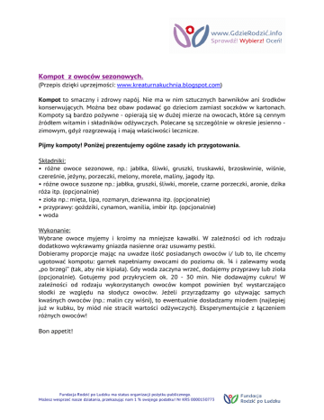 Kompot z owoców sezonowych. (Przepis dzięki uprzejmości: www.kreaturnakuchnia.blogspot.com) Kompot to smaczny i zdrowy napój. Nie ma w nim sztucznych barwników ani środków konserwujących. Można bez obaw podawać go dzieciom zamiast soczków w kartonach. Kompoty są bardzo pożywne - opierają się w dużej mierze na owocach, które są cennym źródłem witamin i składników odżywczych. Polecane są szczególnie w okresie jesienno zimowym, gdyż rozgrzewają i mają właściwości lecznicze. Pijmy kompoty! Poniżej prezentujemy ogólne zasady ich przygotowania. Składniki: • różne owoce sezonowe, np.: jabłka, śliwki, gruszki, truskawki, brzoskwinie, wiśnie, czereśnie, jeżyny, porzeczki, melony, morele, maliny, jagody itp. • różne owoce suszone np.: jabłka, gruszki, śliwki, morele, czarne porzeczki, aronie, dzika róża itp. (opcjonalnie) • zioła np.: mięta, lipa, rozmaryn, dziewanna itp. (opcjonalnie) • przyprawy: goździki, cynamon, wanilia, imbir itp. (opcjonalnie) • woda Wykonanie: Wybrane owoce myjemy i kroimy na mniejsze kawałki. W zależności od ich rodzaju dodatkowo wykrawamy gniazda nasienne oraz usuwamy pestki. Dobieramy proporcje mając na uwadze ilość posiadanych owoców i/ lub to, ile chcemy ugotować kompotu: garnek napełniamy owocami do poziomu ok. ¾ i zalewamy wodą „po brzegi” (tak, aby nie kipiała). Gdy woda zaczyna wrzeć, dodajemy przyprawy lub zioła (opcjonalnie). Gotujemy pod przykryciem ok. 20 - 30 min. Nie dodawajmy cukru! W zależności od rodzaju wykorzystanych owoców kompot powinien być wystarczająco słodki ze względu na słodycz owoców. Jeżeli przyrządzamy go używając samych kwaśnych owoców (np.: malin czy wiśni), to ewentualnie dosładzamy miodem (najlepiej już w kubku, by miód nie stracił wartości odżywczych). Eksperymentujcie z łączeniem różnych owoców! Bon appetit! Fundacja Rodzić po Ludzku ma status organizacji pożytku publicznego. Możesz wesprzeć nasze działania, przekazując nam 1 % swojego podatku! Nr KRS 0000150773 Kompot z jabłek, śliwek i gruszek. Kompot z jabłek, moreli i śliwek, ze świeżą miętą. Kompot z gruszek i melona. Fundacja Rodzić po Ludzku ma status organizacji pożytku publicznego. Możesz wesprzeć nasze działania, przekazując nam 1 % swojego podatku! Nr KRS 0000150773 Kompot z truskawek, wiśni, jeżyn, porzeczek białych i czarnych oraz brzoskwiń. Kompot z jabłek, brzoskwiń i śliwek, ze świeżą miętą. Fundacja Rodzić po Ludzku ma status organizacji pożytku publicznego. Możesz wesprzeć nasze działania, przekazując nam 1 % swojego podatku! Nr KRS 0000150773