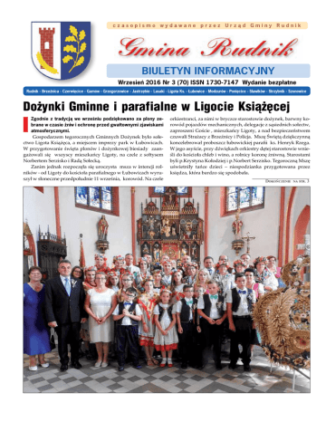 czasopismo wydawane przez Urz¹d Gminy Rudnik BIULETYN INFORMACYJNY Wrzesień 2016 Nr 3 (70) ISSN 1730-7147 Wydanie bezp³atne Rudnik - BrzeŸnica - Czerwiêcice - Gamów - Grzegorzowice - Jastrzêbie - Lasaki - Ligota Ks. - £ubowice - Modzurów - Poniêcice - S³awików - Strzybnik - Szonowice Dożynki Gminne i parafialne w Ligocie Książęcej Zgodnie z tradycją we wrześniu podziękowano za plony zebrane w czasie żniw i ochronę przed gwałtownymi zjawiskami atmosferycznymi. Gospodarzem tegorocznych Gminnych Dożynek było sołectwo Ligota Książęca, a miejscem imprezy park w Łubowicach. W przygotowanie święta plonów i dożynkowej biesiady zaangażowali się wszyscy mieszkańcy Ligoty, na czele z sołtysem Norbertem Serzisko i Radą Sołecką. Zanim jednak rozpoczęła się uroczysta msza w intencji rolników - od Ligoty do kościoła parafialnego w Łubowicach wyruszył w słoneczne przedpołudnie 11 września, korowód. Na czele orkiestranci, za nimi w bryczce starostowie dożynek, barwny korowód pojazdów mechanicznych, delegacje z sąsiednich sołectw, zaproszeni Goście , mieszkańcy Ligoty, a nad bezpieczeństwem czuwali Strażacy z Brzeźnicy i Policja. Mszę Świętą dziękczynną koncelebrował proboszcz łubowickiej parafii ks. Henryk Rzega. W jego asyście, przy dźwiękach orkiestry dętej starostowie wnieśli do kościoła chleb i wino, a rolnicy koronę żniwną. Starostami byli p.Krystyna Kołodziej i p.Norbert Serzisko. Tegoroczną Mszę uświetniły tańce dzieci – niespodzianka przygotowana przez księdza, która bardzo się spodobała. Dokończenie na str. 3 Dożynki gminne Dożynki gminne Dożynki gminne Dożynki Modzurów Dożynki Rudnik Dożynki Rudnik Dożynki Sławików Dożynki Sławików strona - 2 Gmina Rudnik - Biuletyn informacyjny Bruno Kosak odznaczony Pochodzący z Brzeźnicy Bruno Kosak, wieloletni członek Rady Kuratorów Górnośląskiego Centrum Kultury i Spotkań w Łubowicach oraz zarządu Niemieckiego Towarzystwa Oświatowego otrzymał w czerwcu tego roku, we Wrocławiu, Federalny Krzyż Zasługi. Wysokie niemieckie odznaczenie Bruno Kosak przyjął z rąk konsul generalnej Niemiec Elisabeth Wolbers. Bruno Kosak przez lata związany jest z Łubowicami i ziemią rudnicką, należał do władz Niemieckiego Towarzystwa Oświatowego, współpracował z jego pierwszym liderem, Joachimem Czernkiem oraz z Piotrem Baronem. Przez kilka lat sam stał na czele NTO. Pan Kosak szczyci się także długoletnią przynależnością i szefowaniem Towarzystwu Eichendorffa. „Jestem urodzony przed wojną, więc pamiętam łubowicki pałac, kiedy nie był on jeszcze ruiną. Przywiązanie do Eichendorffa i jego twórczości to zasługa rodziców, zwłaszcza ojca. A Krzyż Zasługi Republiki Federalnej Niemiec przyjmuję także jako prezent z okazji zbliżających się 80 urodzin”. Joachim Niemann nagrodzony za pracę dla mniejszości niemieckiej Joachim Niemann podobnie jak Bruno Kosak w czerwcu tego roku otrzymał Federalny Krzyż Zasługi przyznany mu przez prezydenta Niemiec. Joachim Niemann jest wieloletnim działaczem mniejszości niemieckiej w gminie Bierawa. Angażuje się także bardzo w działalność Towarzystwa Josepha von Eichendorffa w Łubowicach. W Górnoślaskim Centrum Kultury i Spotkań pełni rolę szefa rady Kuratorów. Informację o przyznaniu przez prezydenta Niemiec Federalnego Krzyża Zasługi Joachim Niemann otrzymał trzeciego maja. 23 czerwca w Konsulacie Generalnym we Wrocławiu odznaczenie wręczyła mu i wygłosiła laudację pani wicekonsul generalna. Dożynki Gminne i parafialne w Ligocie Książęcej Dokończenie ze str. 1 Po Mszy Goście i mieszkańcy udali się na przygotowany pyszny niedzielny obiad. Po obiedzie starostowie wręczyli bochen chleba Wójtowi p.Alojzemu Pieruszka, który złożył zgromadzonym życzenia, po czym z pomocą starościny tradycyjnie chleb podzielił a starościna poczęstowała nim wszystkich gości, a potem zaczęło się świętowanie. Nikt nie wie ile osób bawiło się na Dożynkach Gminnych. Padają różne wysokie liczby. Wymarzona pogoda, występy świetnie przygotowanych uczniów ze szkół w Brzeźnicy i Grzegorzowicach, gwiazdy kabaretu „To nie my”, gwiazdy estrady – zespół „Relax”, dobrze ułożony program: to wszystko sprawiło, że Dożynki Gminne roku 2016 wypadły dostojnie, okazale i hucznie. Impreza okazała się sukcesem organizacyjnym i logistycznym. Gmina Rudnik - Biuletyn informacyjny strona - 3 Kiedy palenie odpadów w ogródku jest nielegalne i co robić z suchymi liśćmi, trawą czy gałązkami? W związku z interwencjami naszych mieszkańców podejmujemy temat spalania ogrodowych odpadów na łamach naszego biuletynu informacyjnego. . Tumany dymu unoszące się nad domami i przydomowymi ogródkami to częsty widok, zwłaszcza jesienią. Przyczyną nie jest bynajmniej rozpoczęty sezon grzewczy, ale palenie w ogródkach suchych liści, traw czy gałązek. Spalanie odpadów na własnej działce nie zawsze jest legalne. Warto się zastanowić, w jakich sytuacjach możemy minąć się z prawem. Art. 31 ust. 7 ustawy o odpadach mówi, że dopuszcza się spalanie zgromadzonych pozostałości roślinnych poza instalacjami i urządzeniami, chyba że są one objęte obowiązkiem selektywnego zbierania. Na terenie naszej gminy prowadzi się selektywną zbiórkę odpadów, w tym odpadów biodegradowalnych więc nie ma konieczności ich spalania przy posesjach. Przydomowe odpady z ogrodu mamy możliwość wystawić przed posesję zgodnie z harmonogramem odbioru odpadów segregowanych lub umieścić w przydomowym kompostowniku, gałązki można rozdrobnić i użyć jako doskonały materiał do ściółkowania pod drzewami i krzewami. Czy palenie liści jest zgodne z prawem? Każdy ogrodnik wie, że liście chore i zarażone szkodnikami najlepiej spalić. Jednak przepisy regulujące palenie ognisk są bardzo nieprecyzyjne. Ustawa o odpadach, mówi wyraźnie, że „