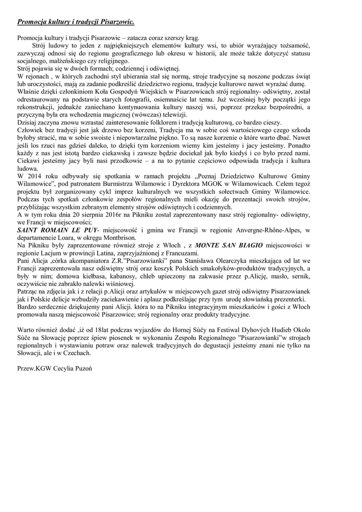 Promocja kultury i tradycji Pisarzowic. Promocja kultury i tradycji Pisarzowic – zatacza coraz szerszy krąg. Strój ludowy to jeden z najpiękniejszych elementów kultury wsi, to ubiór wyrażający tożsamość, zazwyczaj odnosi się do regionu geograficznego lub okresu w historii, ale może także dotyczyć statusu socjalnego, małżeńskiego czy religijnego. Strój pojawia się w dwóch formach; codziennej i odświętnej. W rejonach , w których zachodni styl ubierania stał się normą, stroje tradycyjne są noszone podczas świąt lub uroczystości, mają za zadanie podkreślić dziedzictwo regionu, tradycje kulturowe nawet wyrażać dumę. Właśnie dzięki członkiniom Koła Gospodyń Wiejskich w Pisarzowicach strój regionalny- odświętny, został odrestaurowany na podstawie starych fotografii, osiemnaście lat temu. Już wcześniej były początki jego rekonstrukcji, jednakże zaniechano kontynuowania kultury naszej wsi, poprzez przekaz bezpośredni, a przyczyną była era wchodzenia magicznej (wówczas) telewizji. Dzisiaj zaczyna znowu wzrastać zainteresowanie folklorem i tradycją kulturową, co bardzo cieszy. Człowiek bez tradycji jest jak drzewo bez korzeni, Tradycja ma w sobie coś wartościowego czego szkoda byłoby stracić, ma w sobie swoiste i niepowtarzalne piękno. To są nasze korzenie o które warto dbać. Nawet jeśli los rzuci nas gdzieś daleko, to dzięki tym korzeniom wiemy kim jesteśmy i jacy jesteśmy. Ponadto każdy z nas jest istotą bardzo ciekawską i zawsze będzie dociekał jak było kiedyś i co było przed nami. Ciekawi jesteśmy jacy byli nasi przodkowie – a na to pytanie częściowo odpowiada tradycja i kultura ludowa. W 2014 roku odbywały się spotkania w ramach projektu „Poznaj Dziedzictwo Kulturowe Gminy Wilamowice”, pod patronatem Burmistrza Wilamowic i Dyrektora MGOK w Wilamowicach. Celem tegoż projektu był zorganizowany cykl imprez kulturalnych we wszystkich sołectwach Gminy Wilamowice. Podczas tych spotkań członkowie zespołów regionalnych mieli okazję do prezentacji swoich strojów, przybliżając wszystkim zebranym elementy strojów odświętnych i codziennych. A w tym roku dnia 20 sierpnia 2016r na Pikniku został zaprezentowany nasz strój regionalny- odświętny, we Francji w miejscowości; SAINT ROMAIN LE PUY- miejscowość i gmina we Francji w regionie Anvergne-Rhône-Alpes, w departamencie Loara, w okręgu Montbrison. Na Pikniku były zaprezentowane również stroje z Włoch , z MONTE SAN BIAGIO miejscowości w regionie Lacjum w prowincji Latina, zaprzyjaźnionej z Francuzami. Pani Alicja ,córka akompaniatora Z.R.”Pisarzowianki” pana Stanisława Olearczyka mieszkająca od lat we Francji zaprezentowała nasz odświętny strój oraz koszyk Polskich smakołyków-produktów tradycyjnych, a były w nim; domowa kiełbasa, kabanosy, chleb upieczony na zakwasie przez p.Alicję, masło, sernik, oczywiście nie zabrakło nalewki wiśniowej. Patrząc na zdjęcia jak i z relacji p.Alicji oraz artykułów w miejscowych gazet strój odświętny Pisarzowianek jak i Polskie delicje wzbudziły zaciekawienie i aplauz podkreślając przy tym urodę słowiańską prezenterki. Bardzo serdecznie dziękujemy pani Alicji. która to na Pikniku integracyjnym mieszkańców i gości z Włoch promowała naszą miejscowość Pisarzowice; strój regionalny oraz produkty tradycyjne. Warto również dodać ,iż od 18lat podczas wyjazdów do Hornej Sùčy na Festiwal Dyhových Hudieb Okolo Sùče na Słowację poprzez śpiew piosenek w wykonaniu Zespołu Regionalnego ”Pisarzowianki”w strojach regionalnych i wystawianiu potraw oraz nalewek tradycyjnych do degustacji jesteśmy znani nie tylko na Słowacji, ale i w Czechach. Przew.KGW Cecylia Puzoń