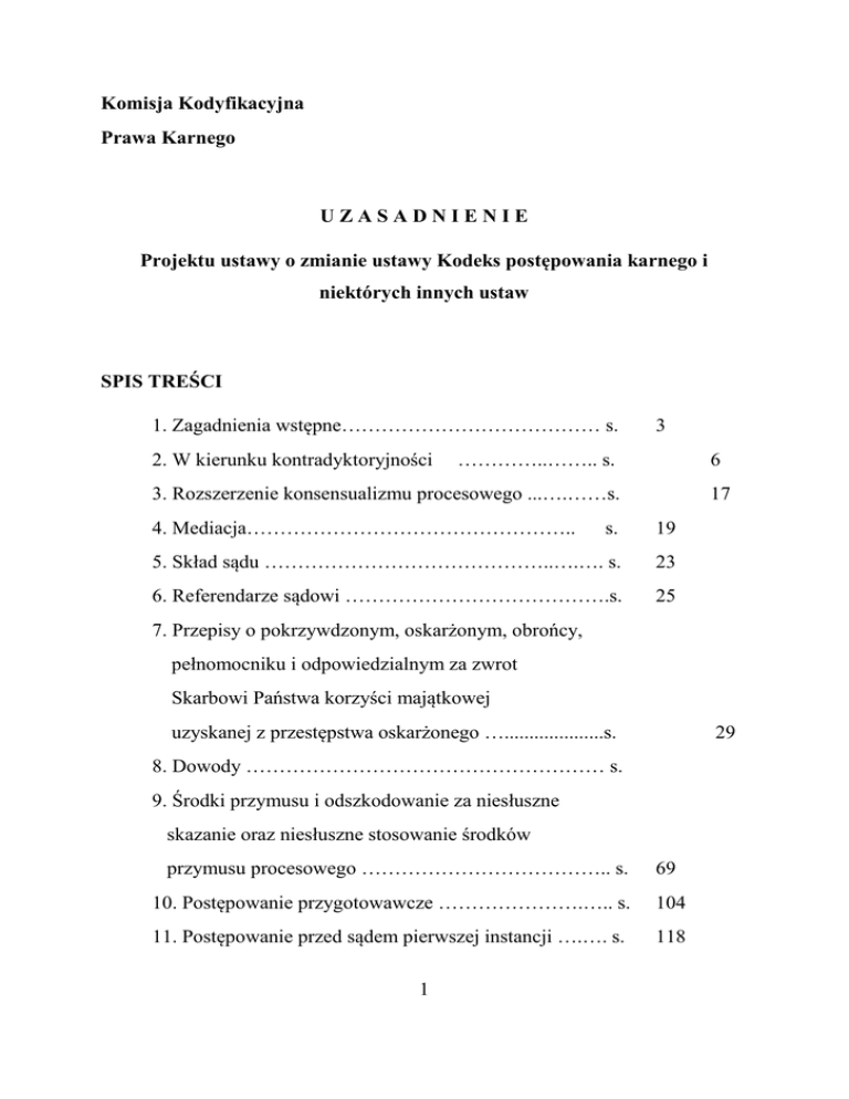 Komisja Kodyfikacyjna Prawa Karnego UZASADNIENIE Projektu ustawy o zmianie ustawy Kodeks postępowania karnego i niektórych innych ustaw SPIS TREŚCI 1. Zagadnienia wstępne………………………………… s. 2. W kierunku kontradyktoryjności 3 …………..…….. s. 6 3. Rozszerzenie konsensualizmu procesowego ...….……s. 4. Mediacja………………………………………….. 17 s. 19 5. Skład sądu ……………………………………..….…. s. 23 6. Referendarze sądowi ………………………………….s. 25 7. Przepisy o pokrzywdzonym, oskarżonym, obrońcy, pełnomocniku i odpowiedzialnym za zwrot Skarbowi Państwa korzyści majątkowej uzyskanej z przestępstwa oskarżonego …....................s. 29 8. Dowody ……………………………………………… s. 9. Środki przymusu i odszkodowanie za niesłuszne skazanie oraz niesłuszne stosowanie środków przymusu procesowego ……………………………….. s. 69 10. Postępowanie przygotowawcze ………………….….. s. 104 11. Postępowanie przed sądem pierwszej instancji ….…. s. 118 1 12. Postępowanie odwoławcze …………………………. s. 137 13. Nadzwyczajne środki zaskarżania …………………. s. 158 14. Rezygnacja z postępowania uproszczonego …….….. s. 168 15. Inne zmiany w Kodeksie postępowania karnego …… s. 172 16. Zgodność projektowanych rozwiązań ze standardami strasburskimi ………………………….. s. 183 17. Zmiany w Kodeksie wykroczeń i Kodeksie postępowania w sprawach o wykroczenia…………s. 200 18. Zmiany w Kodeksie karnym skarbowym ……………s. 211 19. Zmiany w ustawie o odpowiedzialności podmiotów zbiorowych ………………………… …. s. 223 20. Przepisy końcowe i przejściowe …………………..… s. 225 2 1. Zagadnienia wstępne. Powołana z końcem 2009 roku Komisja Kodyfikacyjna Prawa Karnego, działająca przy Ministrze Sprawiedliwości, za swoje priorytetowe zadanie uznała przygotowanie gruntownej nowelizacji przepisów postępowania karnego. Obecny model postępowania karnego powoli wyczerpuje już swoje możliwości. Wobec struktury i natężenia przestępczości, a co za tym idzie, charakteru postępowań prowadzonych przez organy ścigania i wymiaru sprawiedliwości, konieczne okazują się zmiany, których wprowadzenie powinno przeciwdziałać nadmiernej przewlekłości postępowań, a także nadmiernej długotrwałości stosowanego w Polsce tymczasowego aresztowania, co Trybunał Praw Człowieka w Strasburgu sygnalizuje jako polski problem o charakterze strukturalnym (zob. rezolucję tymczasową CM/ResDH (2007)75). Przyczyn tego niekorzystnego stanu rzeczy jest niewątpliwie wiele. Za najważniejsze Komisja uznała: - odejście od kontradyktoryjności postępowania sądowego na rzecz inkwizycyjnego wyjaśniania faktów sprawy w toku postępowania sądowego, a w konsekwencji nieprawidłowe rozłożenie ciężaru odpowiedzialności za wynik procesu, 3 - nadmierny formalizm (czy wręcz fasadowość) wielu czynności, który nie służąc zapewnieniu gwarancji procesowych uczestników postępowania, wydłuża procedowanie, - zbędne angażowanie sędziów do czynności, które z powodzeniem mogą być dokonywane przez czynnik niesądowy, - niewłaściwe realizowanie standardów konstytucyjnych, które wobec rosnącej aktywności Trybunału Konstytucyjnego w obszarze prawa karnego procesowego, jawią się jako coraz bardziej klarowne. Mając świadomość głębokości koniecznych zmian, Komisja Kodyfikacyjna Prawa Karnego uznała za celowe przeprowadzenie możliwie szerokich konsultacji środowiskowych, zarówno wśród teoretyków, jak i – przede wszystkim – wśród praktyków wymiaru sprawiedliwości. W celu wysłuchania głosu tych środowisk, pod auspicjami Komisji Kodyfikacyjnej, w Ministerstwie Sprawiedliwości zorganizowano w 2010 roku trzy konferencje robocze, poświęcone kolejno: modelowi postępowania przygotowawczego i jurysdykcyjnego, stosowaniu środków przymusu w procesie karnym oraz modelowi kontroli instancyjnej i pozainstancyjnej. W zakresie każdego z tematów przygotowano wstępnie dokumenty robocze, zawierające swoiste „ankiety” sygnalizujące potrzebę rozstrzygnięcia ujawniających się problemów legislacyjnych. Ankiety te były podstawą ekspertyz, przygotowywanych na zlecenie Komisji przez ekspertów zewnętrznych, będących wybitnymi teoretykami i praktykami. Ekspertyzy te były zaś podstawą dyskusji konferencyjnych, prowadzonych z udziałem przedstawicieli nauki prawa karnego procesowego oraz praktyków reprezentujących wszystkie profesje prawnicze. Analiza wyników tych dyskusji, a także opinii zgłoszonych Komisji Kodyfikacyjnej w związku z 4 opublikowaniem na stronie internetowej Ministerstwa Sprawiedliwości założeń planowanych reform oraz wspomnianych ekspertyz, była podstawą sformułowania wstępnych propozycji legislacyjnych, które następnie, po wielomiesięcznych dyskusjach w gronie Komisji Kodyfikacyjnej, pozwoliły na sformułowanie wstępnego projektu nowelizacji Kodeksu postępowania karnego i niektórych innych ustaw, który opublikowany został w lutym 2011 r. Rozpoczęło to fazę wszechstronnych konsultacji środowiskowych, w ramach których zgłoszono kilkaset stanowisk i opinii, które następnie poddane były analizie przez Komisję Kodyfikacyjną. Prezentowany obecnie projekt jest wynikiem tej analizy. Niestety, nie było możliwe uwzględnienie wszystkich zgłaszanych przez środowisko postulatów i uwag, przede wszystkim z tego powodu, że zawierały one propozycje zmierzające w różnych kierunkach. Projekt uwzględnia zaś te, które były bezdyskusyjnie trafne, a także te, które uznane zostały za sensowne, po przeprowadzeniu wszechstronnych debat zmierzających do uzyskania kompromisu. Prezentowany projekt zmierza w szczególności do osiągnięcia następujących celów: - przemodelowanie pos