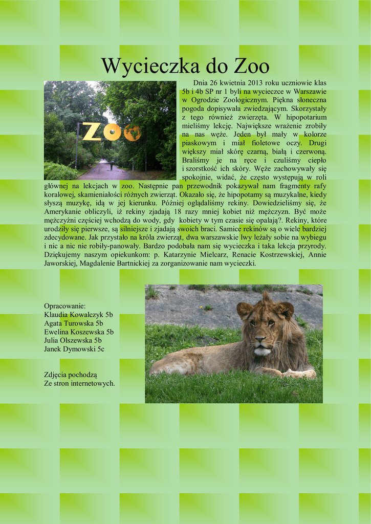 Wycieczka do Zoo Dnia 26 kwietnia 2013 roku uczniowie klas 5b i 4b SP nr 1 byli na wycieczce w Warszawie w Ogrodzie Zoologicznym. Piękna słoneczna pogoda dopisywała zwiedzającym. Skorzystały z tego również zwierzęta. W hipopotarium mieliśmy lekcję. Największe wrażenie zrobiły na nas węże. Jeden był mały w kolorze piaskowym i miał fioletowe oczy. Drugi większy miał skórę czarną, białą i czerwoną. Braliśmy je na ręce i czuliśmy ciepło i szorstkość ich skóry. Węże zachowywały się spokojnie, widać, że często występują w roli głównej na lekcjach w zoo. Następnie pan przewodnik pokazywał nam fragmenty rafy koralowej, skamieniałości różnych zwierząt. Okazało się, że hipopotamy są muzykalne, kiedy słyszą muzykę, idą w jej kierunku. Później oglądaliśmy rekiny. Dowiedzieliśmy się, że Amerykanie obliczyli, iż rekiny zjadają 18 razy mniej kobiet niż mężczyzn. Być może mężczyźni częściej wchodzą do wody, gdy kobiety w tym czasie się opalają?. Rekiny, które urodziły się pierwsze, są silniejsze i zjadają swoich braci. Samice rekinów są o wiele bardziej zdecydowane. Jak przystało na króla zwierząt, dwa warszawskie lwy leżały sobie na wybiegu i nic a nic nie robiły-panowały. Bardzo podobała nam się wycieczka i taka lekcja przyrody. Dziękujemy naszym opiekunkom: p. Katarzynie Mielcarz, Renacie Kostrzewskiej, Annie Jaworskiej, Magdalenie Bartnickiej za zorganizowanie nam wycieczki. Opracowanie: Klaudia Kowalczyk 5b Agata Turowska 5b Ewelina Koszewska 5b Julia Olszewska 5b Janek Dymowski 5c Zdjęcia pochodzą Ze stron internetowych.