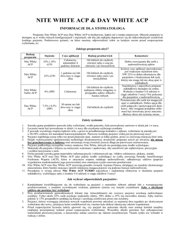 NITE WHITE ACP & DAY WHITE ACP INFORMACJE DLA STOMATOLOGA Preparaty Nite White ACP oraz Day White ACP to bezbarwne, lepkie żel o smaku miętowym. Obecnie preparaty te dostępne są w wielu różnych konfiguracjach i stężeniach, tak aby jak najlepiej dopasować się do indywidualnych oczekiwań każdego pacjenta. Podstawowe pytanie, na które musimy odpowiedzieć sobie za każdym razem przed rozpoczęciem wybielania, to: Jakiego preparatu użyć? Rodzaj preparatu Stężenie Czas aplikacji Rodzaj przebarwień Komentarz Nite White ACP 10% i 16% (CP) Całonocny, minimalnie 4 godziny dziennie Od lekkich do ciężkich, również zęby o szarym odcieniu i po tetracyklinie Dobre rozwiązanie dla osób z nadwrażliwością zębów Nite White ACP 22% (CP) 1 godzina raz lub dwa razy w ciągu dnia Od lekkich do ciężkich, również zęby szare i po tetracyklinie Nite White Turbo ACP 6% (HP) Całonocny Od lekkich do ciężkich, najlepsze efekty osiągamy w przypadku zębów żółtych i bardzo żółtych Day White ACP 7,5% i 9,5% (HP) 30 minut raz lub dwa razy w ciągu dnia Od lekkich do ciężkich Krótszy czas aplikacji spowodowany jest większym stężeniem żelu. NW 22% to dobra alternatywa dla pacjentów z bruksizmem lub tych, którzy nie mogą lub nie chcą spać w nakładkach Najsilniejszy i najszybszy preparat nakładkowy dostępny na rynku. Wybiela o średnio 5-6 odcieni w ciągu zaledwie 3 nocy! Nie polecany dla pacjentów z nadwrażliwością. Przeznaczony dla osób nie mogących spać w nakładkach. Dobra opcja dla osób palących i spożywających dużo kawy. Aby osiągnąć pożądany efekt musi być stosowany przez znacznie dłuższy okres niż systemy nocne. Zalety systemu: Szeroka gama produktów pozwala żeby wybielanie, wedle potrzeby, było prowadzone zarówno w dzień jak i w nocy. Leczenie może być prowadzone w dzień i w nocy dla uzyskania szybszego rezultatu. Z powodu wysokiego stopnia lepkości żelu, a przez to przedłużonego kontaktu z zębami, wybielanie tą metodą jest o 30-50% szybsze niż metodami konwencjonalnymi. Pierwsze rezultaty pacjenci widzą już po pierwszej nocy! 4. Pacjenci napełniają szynę tylko raz przed pójściem spać, zamiast co kilka godzin, przez co zużywają mniejszą ilość żelu. 5. Dzięki wykorzystaniu opatentowanej technologii dwukomorowej strzykawki preparaty nawet po otwarciu nie muszą być przechowywane w lodówce oraz utrzymują swoją świeżość jeszcze długo po pierwszym zastosowaniu. 6. Pacjenci podkreślają szczególne walory smakowe Nite White, których nie posiadają inne środki wybielające. 7. Materiały dla pacjenta i lekarza są estetycznie wykonane i opakowane, aby umożliwić jak najłatwiejsze, precyzyjne i szybkie korzystanie z nich. 8. Firma posiada szeroką gamę materiałów informacyjnych i reklamowych np.: foldery reklamowe, plakaty, standy. 9. Nite White ACP oraz Day White ACP jako jedyne środki wybielające na rynku zawierają formułę Amorficznego Fosforanu Wapnia (ACP), która w znacznym stopniu redukuje nadwrażliwość, odbudowuje szkliwo (poprzez wypełnienie niedoskonałości jego powierzchni) oraz zmniejsza ryzyko nawrotu przebarwień. 10. Nite White ACP oraz Day White ACP zawierają ponadto związek Azotanu Potasu, działający na zasadzie chemicznego znieczulenia, który bardzo znaczący sposób zmniejsza mogącą pojawić się podczas kuracji nadwrażliwość. 11. Posiadamy w swojej ofercie Nite White ACP TURBO najszybszy i najbardziej efektywny w działaniu preparat nakładkowy, wybielający zęby o średnio 5-6 odcieni w ciągu zaledwie 3 nocy! 1. 2. 3. Jak wybrać odpowiednich pacjentów: 1. 2. 3. 4. Kandydatami kwalifikującymi się do wybielania są pacjenci z naturalnie żółtymi zębami lub z występującymi przebarwieniami, z osadami wywołanymi wiekiem, paleniem tytoniu czy innymi czynnikami. Zęby z ubytkami szkliwa nie powinny być wybielane! Przy przebarwieniach spowodowanych lekami (np. tetracyklinami) nie wszyscy pacjenci uzyskują zadowalające rezultaty. Tylko około 25% osób uzyskuje znakomite efekty, 50% dobre a 25% ma niewielkie zmiany. Zęby martwe jedynie w 15% przypadków poddają się kuracji i uzyskują oczekiwane przez nas rezultaty. Pacjenci, którzy wymagają założenia nowych wypełnień powinni odczekać co najmniej dwa tygodnie po skończonym wybielaniu aby nowy, jaśniejszy kolor ustabilizował się i można było dobrać identyczny odcień wypełnienia. Przed rozpoczęciem leczenia należy upewnić się, czy pacjent ma zaleczone ubytki oraz usunąć kamień nazębny (najlepiej przynajmniej tydzień przed rozpoczęciem wybielania). Wszystkie ubytki powinny być zabezpieczone materiałami prowizorycznymi, a nieszczelne zalane czasowo np. lakiem szczelinowym. Tlenek cynku nie wchodzi w reakcję z żelem. 5. 6. 7. Pacjenci z odsłoniętymi szyjkami z powodów chorób przyzębia powinni mieć skróconą szynę lub założone wypełnienia V klasy na obszary wrażliwe. Preparat Nite White nie powinien być stosowany przez kobiety w ciąży oraz karmiące, gdyż nie prowadzono badań co do ewentualnych działań ubocznych nadtlenku karbamidu na rozwijający się organizm. Stany zapalne błon śluzowych są bezwzględnym przeciwwskazaniem do używania preparatu. O czym należy pamiętać przed wydaniem preparatu pacjentowi: 1. 2. 3. Upewnić się, czy możesz spełnić oczekiwania pacjenta. Większość pacjentów oczekuje wybielenia o 2 odcienie wg skali Vita. Sprawdzić czy pacjent ma usunięty kamień nazębny i zabezpieczone ubytki. Upewnić się, czy pacjent wie, że korony i plomby nie wybielają się i mogą wymagać zmiany po zakończonym zabiegu. Wydając pacjentowi preparat: 1. 2. 3. 4. 5. 6. 7. 8. Zrób wysokiej klasy zdjęcie przed wybielaniem lub pokaż pacjentowi, jaki kolor mają jego zęby wg kolornika. Zapisz informacje w karcie pacjenta. Prowadzenie dokładnej dokumentacji jest niezbędne. Przejrzyj instrukcję stosowania preparatu wraz z pacjente