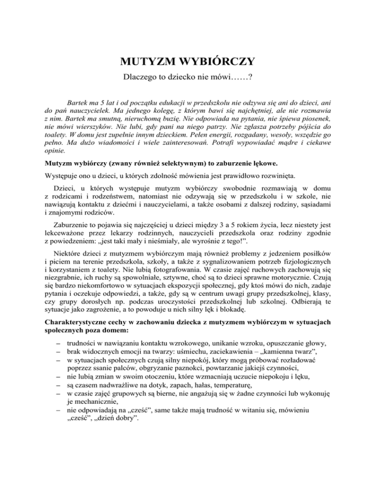 MUTYZM WYBIÓRCZY Dlaczego to dziecko nie mówi……? Bartek ma 5 lat i od początku edukacji w przedszkolu nie odzywa się ani do dzieci, ani do pań nauczycielek. Ma jednego kolegę, z którym bawi się najchętniej, ale nie rozmawia z nim. Bartek ma smutną, nieruchomą buzię. Nie odpowiada na pytania, nie śpiewa piosenek, nie mówi wierszyków. Nie lubi, gdy pani na niego patrzy. Nie zgłasza potrzeby pójścia do toalety. W domu jest zupełnie innym dzieckiem. Pełen energii, rozgadany, wesoły, wszędzie go pełno. Ma dużo wiadomości i wiele zainteresowań. Potrafi wypowiadać mądre i ciekawe opinie. Mutyzm wybiórczy (zwany również selektywnym) to zaburzenie lękowe. Występuje ono u dzieci, u których zdolność mówienia jest prawidłowo rozwinięta. Dzieci, u których występuje mutyzm wybiórczy swobodnie rozmawiają w domu z rodzicami i rodzeństwem, natomiast nie odzywają się w przedszkolu i w szkole, nie nawiązują kontaktu z dziećmi i nauczycielami, a także osobami z dalszej rodziny, sąsiadami i znajomymi rodziców. Zaburzenie to pojawia się najczęściej u dzieci między 3 a 5 rokiem życia, lecz niestety jest lekceważone przez lekarzy rodzinnych, nauczycieli przedszkola oraz rodziny zgodnie z powiedzeniem: „jest taki mały i nieśmiały, ale wyrośnie z tego!”. Niektóre dzieci z mutyzmem wybiórczym mają również problemy z jedzeniem posiłków i piciem na terenie przedszkola, szkoły, a także z sygnalizowaniem potrzeb fizjologicznych i korzystaniem z toalety. Nie lubią fotografowania. W czasie zajęć ruchowych zachowują się niezgrabnie, ich ruchy są spowolniałe, sztywne, choć są to dzieci sprawne motorycznie. Czują się bardzo niekomfortowo w sytuacjach ekspozycji społecznej, gdy ktoś mówi do nich, zadaje pytania i oczekuje odpowiedzi, a także, gdy są w centrum uwagi grupy przedszkolnej, klasy, czy grupy dorosłych np. podczas uroczystości przedszkolnej lub szkolnej. Odbierają te sytuacje jako zagrożenie, a to powoduje u nich silny lęk i blokadę. Charakterystyczne cechy w zachowaniu dziecka z mutyzmem wybiórczym w sytuacjach społecznych poza domem: trudności w nawiązaniu kontaktu wzrokowego, unikanie wzroku, opuszczanie głowy, brak widocznych emocji na twarzy: uśmiechu, zaciekawienia – „kamienna twarz”, w sytuacjach społecznych czują silny niepokój, który mogą próbować rozładować poprzez ssanie palców, obgryzanie paznokci, powtarzanie jakiejś czynności, nie lubią zmian w swoim otoczeniu, które wzmacniają uczucie niepokoju i lęku, są czasem nadwrażliwe na dotyk, zapach, hałas, temperaturę, w czasie zajęć grupowych są bierne, nie angażują się w żadne czynności lub wykonuję je mechanicznie, nie odpowiadają na „cześć”, same także mają trudność w witaniu się, mówieniu „cześć”, „dzień dobry”. Należy pamiętać, że dzieci z mutyzmem wybiórczym mają także inne zaburzenia lękowe np. czują lęk przed burzą, ciemnością, obcym psem, kotem, owadami oraz wodą w basenie lub morzu. Wczesna diagnoza i terapia mogą przyczynić się do poprawy funkcjonowania dziecka. Dzięki temu dziecko uniknie izolacji społecznej, a w przyszłości zaburzeń typu depresyjnego. Istotne jest zatem, aby rodzice, lekarze i nauczyciele jak najwcześniej sygnalizowali problem i podjęli odpowiednie działania. Jak specjaliści mogą pomóc rodzicom dzieci z mutyzmem wybiórczym? Rodzice dzieci z mutyzmem wybiórczym potrzebują wsparcia i pomocy osoby, która ich wysłucha i która zaproponuje konkretne rozwiązania i zalecenia oraz strategie postępowania terapeutycznego, które obejmą zarówno dom, jak i szkołę. Albowiem wg Maggie Johnson - specjalisty w zakresie mutyzmu wybiórczego terapia dziecka powinna odbywać się przede wszystkim tam, gdzie mutyzm wybiórczy występuje. Biorąc pod uwagę, że mutyzm wybiórczy wynika z lęku i niepokoju dziecka, praca terapeutyczna powinna być ukierunkowana przede wszystkim na obniżenie negatywnych odczuć i reakcji dziecka. Nie należy zmuszać dziecka, aby mówiło. Powinno się zachęcać je do dobrej zabawy w sympatycznej atmosferze, tak aby poczuło się bezpiecznie. Każda forma komunikacji niewerbalnej powinna być akceptowana i nagradzana. Należy więc zachęcać dziecko do stosowania innych, pomocnych form porozumiewania się np. potakiwania głową, szeptania. Dzięki nim tworzymy z dzieckiem pozytywną relację, bardzo przydatną w przezwyciężaniu trudności, z jakimi dziecko się boryka. Praca terapeutyczna z dzieckiem z mutyzmem wybiórczym wymaga czasu, cierpliwości i świadomości zarówno rodziców, jak i terapeuty i nauczycieli, że jest to proces, oparty na wykonywaniu małych, ale istotnych kroków w rozwoju emocjonalnym i społecznym dziecka, które powinny doprowadzić je do całkowitej poprawy. Strategie postępowania z dzieckiem z mutyzmem wybiórczym powinny być dostosowane do dziecka, jego możliwości psychofizycznych, zainteresowań a także jego sytuacji życiowej i rodzinnej. Taki program terapii dziecka „szyty na miarę” powinien zostać opracowany przez specjalistów, którzy posiadają odpowiednie szkolenie z zakresu mutyzmu wybiórczego, a także doszkalają się we własnym zakresie. Ich rolą jest nie tylko praca terapeutyczna z dzieckiem z mutyzmem wybiórczym i jego rodziną, ale także przygotowanie nauczycieli dziecka do pracy z nim na terenie przedszkola i szkoły. W roku szkolnym 2015/16 biorąc pod uwagę potrzeby środowiska nauczycieli w tym zakresie przewiduje się przeprowadzenie szkoleń z zakresu diagnozy i terapii dzieci z mutyzmem wybiórczym. Ponadto już we wrześniu 2015 r. zostanie uruchomiony na terenie Powiatowej Poradni Psychologiczno – Pedagogicznej w Złotowie punkt konsultacyjny dla rodziców dzieci z mutyzmem wybiórczym. mgr Katarzyna Szyszka – pedagog, terapeuta pedagogiczny, specjalizuje się w diagnozie i terapii zaburzeń i odchyleń rozwojowych dzieci w wieku prz