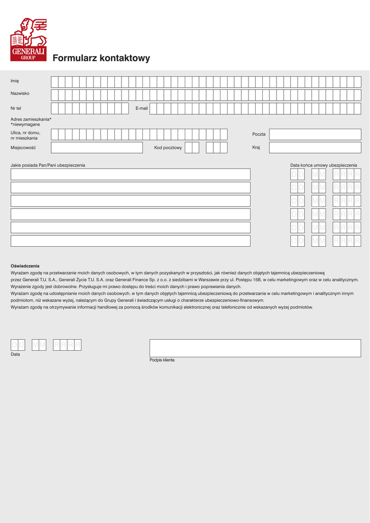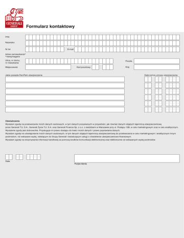 Formularz kontaktowy Imi´ Nazwisko E-mail Nr tel Adres zamieszkania* *niewymagane Ulica, nr domu, nr mieszkania Poczta Kod pocztowy MiejscowoÊç Kraj Jakie posiada Pan/Pani ubezpieczenia Data koƒca umowy ubezpieczenia DD MM RRRR DD MM RRRR DD MM RRRR DD MM RRRR DD MM RRRR DD MM RRRR OÊwiadczenia Wyra˝am zgod´ na przetwarzanie moich danych osobowych, w tym danych pozyskanych w przyszłoÊci, jak równie˝ danych obj´tych tajemnicà ubezpieczeniowà przez Generali T.U. S.A., Generali ˚ycie T.U. S.A. oraz Generali Finance Sp. z o.o. z siedzibami w Warszawie przy ul. Post´pu 15B, w celu marketingowym oraz w celu analitycznym. Wyra˝enie zgody jest dobrowolne. Przysługuje mi prawo dost´pu do treÊci moich danych i prawo poprawiania danych. Wyra˝am zgod´ na udost´pnianie moich danych osobowych, w tym danych obj´tych tajemnicà ubezpieczeniowà do przetwarzania w celu marketingowym i analitycznym innym podmiotom, ni˝ wskazane wy˝ej, nale˝àcym do Grupy Generali i Êwiadczàcym usługi o charakterze ubezpieczeniowo-finansowym. Wyra˝am zgod´ na otrzymywanie informacji handlowej za pomocà Êrodków komunikacji elektronicznej oraz telefonicznie od wskazanych wy˝ej podmiotów. DD MM RRRR Data Podpis klienta