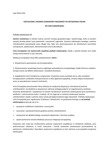 mgr Maria Pelc KSZTAŁCENIE I ROZWÓJ ZAWODOWY MŁODZIEŻY PO WSTĄPIENIU POLSKI DO UNII EUROPEJSKIEJ Polityka edukacyjna UE System oświatowy to bardzo ważny czynnik rozwoju gospodarczego i społecznego, który w pewien sposób określa jakość życia jednostek i zamożność regionów. Systemy edukacyjne każdego z państw członkowskich powstawały przez długie lata. Były one dostosowywane do określonych warunków ustrojowych, społecznych, ekonomicznych oraz kulturalnych. Unia Europejska nie wytworzyła wspólnej polityki edukacyjnej. Każde z państw bardzo ceni sobie swoją różnorodność w tym zakresie. Edukacja europejska służy kilku podstawowym celom: 1. Wzajemnemu poznawaniu się Europejczyków; 2. Wypracowaniu wspólnego kanonu ogólnego wykształcenia europejskiego, dzięki któremu wspólna Europa stanie się faktem kulturowym i świadomościowym; 3. Uzgodnienie treści kształcenia, programów i kryteriów oceny wyników po to, aby umożliwić Europejczykom swobodne funkcjonowanie w skali ogólnoeuropejskiej, zmianę miejsca kształcenia i pracy w poszukiwaniu nowych możliwości. Unia Europejska pozostawiała sferę edukacji do wyłącznej dyspozycji i kompetencji państw członkowskich. Jej działania w powyższym zakresie polegają jedynie na organizowaniu podstaw wymiany doświadczeń i współpracy w ramach narodowych systemów edukacyjnych przy zachowaniu wielkości i zróżnicowania kultur i tradycji. UE nie ingeruje w systemy edukacyjne państw członkowskich. Każde z państw samo ustala jak będą kształceni jego obywatele. Polityka edukacyjna Unii Europejskiej jest regulowana Traktatem z Maastricht, na podstawie którego za cel polityki edukacyjnej przyjmuje się m.in.: • sprzyjanie mobilności studentów i nauczycieli, • nauczanie i upowszechnianie języków państw członkowskich, • zachęcenie do akademickiego uznawania dyplomów i okresów studiów, • upowszechnianie wśród młodzieży poczucia integracji europejskiej. Powyższe cele mają być zrealizowane poprzez wspieranie współpracy w dziedzinie edukacji, przy jednoczesnym założeniu, iż treści nauczania i kształt systemów oświatowych pozostawione są państwom członkowskim. Sposobem wspierania współpracy w tym zakresie są europejskie programy edukacyjne. Programy edukacyjne Lifelong Learning Programme (LLP) to nowy program Unii Europejskiej w dziedzinie edukacji i doskonalenia zawodowego, przewidziany na lata 2007-2013. Idea programu „Uczenie się przez całe życie” ma kluczowe znaczenie dla realizacji celów polityki edukacyjnej UE. Celem programu jest przyczynianie się do rozwoju Wspólnoty jako społeczeństwa opartego na wiedzy, realizującego Strategię Lizbońską. LLP ma podnieść jakość i zwiększyć atrakcyjność szkolnictwa i kształcenia zawodowego w Europie. Program zakłada osiągnięcie powyższego na podstawie rozwoju różnych form uczenia się przez całe życie poprzez wspieranie współpracy między systemami edukacji i szkoleń w krajach uczestniczących. W skład programu „Uczenie się przez całe życie” wchodzą cztery programy sektorowe (Comenius, Erasmus, Leonardo da Vinci, Grundtvig) oraz program międzysektorowy i program Jean Monnet. Programy te skierowane są do wszystkich, bez względu na wiek, w tym także do studentów, nauczycieli i placówek oświatowych z innych krajów, w szczególności do tych sąsiadujących z UE lub planujących wstąpienie do niej. Leonardo da Vinci - kształcenie i szkolenie zawodowe. Program ma na celu promowanie mobilności pracowników na europejskim rynku pracy a także wdrażanie innowacyjnych rozwiązań edukacyjnych dla podnoszenia kwalifikacji zawodowych. LdV wspiera rozwiązania zwiększające przejrzystość i uznawalność kwalifikacji zawodowych w UE, a także działania mające na celu wzmocnienie jakości kształcenia zawodowego i ustawicznego. W ramach programu można uzyskać dofinansowanie do projektów wymian i staży jak również współpracy wielostronnej. Od 2007 roku program Leonardo da Vinci skierowany jest do osób korzystających ze szkolenia i kształcenia zawodowego nie będącego częścią programu studiów wyższych. Erasmus - szkolnictwo wyższe. Program skierowany jest przede wszystkim do szkół wyższych, ich pracowników i studentów. W Erasmusie mogą uczestniczyć także inne instytucje, organizacje lub przedsiębiorstwa, które współpracują z uczelniami. Podstawowym celem tego Programu jest podnoszenie jakości kształcenia w krajach uczestniczących w tym programie poprzez rozwijanie międzynarodowej współpracy między uczelniami oraz wspieranie mobilności studentów i pracowników szkół wyższych. Uczelnia , która chce ubiegać się o fundusze na konkretne działania przewidziane w Erasmusie musi posiadać tzw. Kartę Uczelni Erasmusa (Erasmus Univeristy Charter), która nadawana jest przez Komisję Europejską. Od roku akademickiego 2007/08, uczelnie biorące udział w Erasmusie mają możliwość: • prowadzenia wymiany studentów, • organizowania kursów intensywnych, • udziału w projektach wielostronnych, • prowadzenia wymiany pracowników uczelni, • udziału w sieciach tematycznych Erasmusa. Grundtvig - kształcenie dorosłych i inne ścieżki edukacyjne. Program skierowany jest do różnego typu organizacji działających w obszarze edukacji dorosłych, ich słuchaczy i pracowników. Wspiera przede wszystkim działania, które służą edukacji osób dorosłych z grup defaworyzowanych i o utrudnionym dostępie do oferty edukacyjnej, np. osób starszych, bezrobotnych, niepełnosprawnych, zamieszkujących tereny wiejskie, o niskim wykształceniu i o specjalnych potrzebach edukacyjnych, ale również młodych, które przerwały naukę i potrzebują kolejnej szansy uzyskania formalnych kwalifikacji. Program wspiera trzy typy działań: współpracę międzynarodową w ramach projektów, wizyty przygotowawcze służące opracowaniu przyszłyc