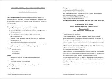 SCENARIUSZE LEKCYJNE Z OKAZJI ŚWIĄT BOŻEGO NARODZENIA Bibliografia: http://en.wikipedia.org/wiki/Christmas_worldwide Temat: Ho!Ho!Ho! It’s Christmas time! http://website.lineone.net/~john_mackie/pudding.htm http://www.lyricskeeper.com/shrek_soundtrack-lyrics/219365-12_days_of_christmas-lyrics.htm http://www.youtube.com/watch?v=-UhcmUU0QpY Lekcje przeznaczone dla uczniów w szkołach ponadgimnazjalnych, poziom niższy średniozaawansowany. Można także wykorzystać pomysł w klasach gimnazjalnych, po http://chomikuj.pl/kingaimis/Dokumenty/Shrek+-+03+of+4++The+Twelve+Days+Of+Christmas,394315652.rar Wszystkie materiały są legalne i można je pobrać z powyższych linków w celach dydaktycznych. uprzednim dopasowaniu słownictwa z zakresu żywności, np. z podręcznika „to the Top 3” (ss. 131,132,24,25) Przebieg lekcji w języku polskim (wersja angielska i materiały w Teacher’s Notes) : Cele (szczegółowo dopasowane w scenariuszach obydwu lekcji): Lekcja 1- wariant 1 rozumienie ze słuchu: rozumienie informacji szczegółowej Temat: Ho!Ho!Ho! It’s Christmas time!- part 1 poszerzenie słownictwa i wiedzy dotyczącej tradycji Świąt Bożego Narodzenia w krajach anglojęzycznych nauka umiejętności dostrzegania wpływu kultury obcej na rodzimą Czynności organizacyjno- porządkowe ćwiczenia translatoryczne 1. Ćwiczenie wprowadzające: nauczyciel rozdaje kopie ćwiczeń. W celu aktywizacji stworzenie uczniom możliwości i zachęcanie ich do kontaktu z autentycznym słownictwa prosi uczniów o rozwiązanie ćwiczenia nr 1 (word search). Należy znaleźć 11 materiałem językowym słów związanych z Bożym Narodzeniem. nauczenie uczniów wyszukiwania potrzebnych informacji 2. Uczniowie czytają tekst o zwyczajach świątecznych w krajach anglojęzycznych, następnie czytanie ze zrozumieniem tekstu oryginalnego- czytanie dla zrozumienia głównej rozwiązują ćwiczenia nr 2 i 3. myśli tekstu, czytanie dla znalezienia infomacji szczegółowej Metody: 3. Nauczyciel prosi o otwarcie podręcznika Matura Plus na stronie 69-70 i zapoznanie się z podanym tam słownictwem dotyczącym żywności. praca indywidualna 4. Uczniowie rozwiązują zadanie 4 z podręcznika, s. 72 praca w grupach 5. Nauczyciel prosi o nie zamykanie podręcznika. Następuje ćwiczenie nr 4 z kopii ćwiczeń- gry dydaktyczne Pomoce: przeczytanie i przetłumaczenie przepisu na pudding świąteczny (nauczyciel pomaga uczniom w ćwiczeniu translatorycznym w zależności od poziomu biegłości uczniów). radio-odtwarzacz CD-MP3 lub laptop z rzutnikiem mulimedialnym 6. Powtórzenie słownictwa w formie gry. Nauczyciel definiuje w języku angielskim słowa, a tablica uczniowie mają za zadanie odgadnąć słowo- klucz. (np. X to jest duża zielona rzecz, którą ćwiczenia przygotowane przez nauczyciela dekorujemy w Wigilię) podręcznik Matura Plus 7. Zadanie domowe: Napisz przepis na polską potrawę świąteczną korzystając za słownictwa w lekcji nr 1 w wariancie 2- sala komputerowa z dostępem do Internetu w podręczniku. Czas trwania: 2 jednostki lekcyjne Autorka: mgr Kinga Oleksa-Skubisz, ZSZ w Dynowie Autorka: mgr Kinga Oleksa-Skubisz, ZSZ w Dynowie Lekcja 1- wariant 2- Lekcja 2 sala komputerowa z dostępem do Internetu Temat: Ho!Ho!Ho! It’s Christmas time!- part 2 Temat: Ho!Ho!Ho! It’s Christmas time!- part 1 Czynności organizacyjno- porządkowe Czynności organizacyjno- porządkowe 1. Odbiór zadania domowego. 1. Ćwiczenie wprowadzające: nauczyciel rozdaje kopie ćwiczeń. W celu aktywizacji 2. Ćwiczenie wprowadzające: wprowadzenie słownictwa za pomocą przywieszonych słownictwa prosi uczniów o rozwiązanie ćwiczenia nr 1 (word search). Należy znaleźć 11 obrazków. słów związanych z Bożym Narodzeniem. 3. Nauczyciel za pomocą magnesów przyczepia do tablicy uprzednio przygotowane liczebniki 2. Nauczyciel prosi uczniów o znalezienie w anglojęzycznej wersji Wikipedii hasła porządkowe w losowej kolejności i prosi uczniów o zapisanie ich w zeszytach w kolejności „Christmas Customs” i o zapoznanie się ze zwyczajami świątecznymi w krajach prawidłowej. Następuje powtórzenie wymowy tych liczebników. anglojęzycznych. Nauczyciel monitoruje pracę uczniów i sprawdza, czy nie korzystają z 4. Nauczyciel rozdaje kopie ćwiczeń i prosi o zapoznanie się z tekstem kolędy. polskich stron WWW. Nauczyciel prosi o feedback wybranych uczniów. 5. Następuje pierwsze odtworzenie kolędy ( w sali z projektorem mulimedialnym oraz 3. Nauczyciel prosi o otwarcie podręcznika Matura Plus na stronie 69-70 i zapoznanie się z laptopem można posłużyć się teledyskiem z YouTube). podanym tam słownictwem dotyczącym żywności. 6. Następuje powtórne odtworzenie kolędy. Uczniowie wraz z nauczycielem odczytują pełny 4. Uczniowie rozwiązują zadanie 4 z podręcznika, s. 72 tekst, nauczyciel w razie potrzeby tłumaczy najtrudniejsze wyrażenia. 5. Nauczyciel prosi o nie zamykanie podręcznika oraz znalezienie przepisu na świąteczny 7. Uczniowie losują karteczki z dniami świąt (1-12). Należy przygotować tyle karteczek ilu pudding. Nauczyciel monitoruje pracę uczniów i sprawdza, czy nie korzystają z polskich jest uczniów. Jako pojemnik na losy można wykorzystać cokolwiek z motywem świątecznym. stron WWW. Nauczyciel pomaga w ćwiczeniu translatorycznym, dostarczając Nauczyciel tłumaczy zabawę- każdy uczeń ma przyporządkowany dzień świąteczny i wstaje z odpowiedniego słownictwa nie zawartego w podręczniku. miejsca kiedy usłyszy swoją kwestię w kolędzie (po jej zakończeniu siada). Dla bardziej 6. Powtórzenie słownictwa w formie gry. Nauczyciel definiuje w języku angielskim słowa, a rozśpiewanych klas można zastosować wersję ze wstawaniem i śpiewaniem. Zabawę należy uczniowie mają za zadanie odgadnąć słowo- klucz. (np. X to jest duża zielona rzecz, którą przeprowadzić co najmniej dwukrotnie, gdyż uczniowie mogą za pierwszym razem nie dek