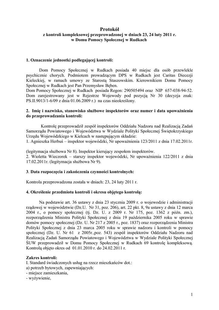 Protokół z kontroli kompleksowej przeprowadzonej w dniach 23, 24 luty 2011 r. w Domu Pomocy Społecznej w Rudkach 1. Oznaczenie jednostki podlegającej kontroli: Dom Pomocy Społecznej w Rudkach posiada 40 miejsc dla osób przewlekle psychicznie chorych. Podmiotem prowadzącym DPS w Rudkach jest Caritas Diecezji Kieleckiej, w ramach umowy ze Starostą Staszowskim. Kierownikiem Domu Pomocy Społecznej w Rudkach jest Pan Przemysław Bęben. Dom Pomocy Społecznej w Rudkach posiada Regon: 290505494 oraz NIP 657-038-94-52. Dom zarejestrowany jest w Rejestrze Wojewody pod pozycją Nr 30 (decyzja znak: PS.II.9013/1-6/09 z dnia 01.06.2009 r.) na czas nieokreślony. 2. Imię i nazwisko, stanowisko służbowe inspektorów oraz numer i data upoważnienia do przeprowadzania kontroli: Kontrolę przeprowadził zespół inspektorów Oddziału Nadzoru nad Realizacją Zadań Samorządu Powiatowego i Województwa w Wydziale Polityki Społecznej Świętokrzyskiego Urzędu Wojewódzkiego w Kielcach w następującym składzie: 1. Agnieszka Herbuś – inspektor wojewódzki, Nr upoważnienia 123/2011 z dnia 17.02.2011r. (legitymacja służbowa Nr 8). Inspektor kierujący zespołem inspektorów. 2. Wioletta Wieczorek – starszy inspektor wojewódzki, Nr upoważnienia 122/2011 z dnia 17.02.2011r. (legitymacja służbowa Nr 9). 3. Data rozpoczęcia i zakończenia czynności kontrolnych: Kontrola przeprowadzona została w dniach: 23, 24 luty 2011 r. 4. Określenie przedmiotu kontroli i okresu objętego kontrolą: Na podstawie art. 36 ustawy z dnia 23 stycznia 2009 r. o wojewodzie i administracji rządowej w województwie (Dz.U. Nr 31, poz. 206), art. 22 pkt. 8, 9a ustawy z dnia 12 marca 2004 r., o pomocy społecznej (tj. Dz. U. z 2009 r. Nr 175, poz. 1362 z późn. zm.), rozporządzenia Ministra Polityki Społecznej z dnia 19 października 2005 roku w sprawie domów pomocy społecznej (Dz. U. Nr 217 z 2005 r., poz. 1837) oraz rozporządzenia Ministra Polityki Społecznej z dnia 23 marca 2005 roku w sprawie nadzoru i kontroli w pomocy społecznej (Dz. U. Nr 61 z 2005r.,poz. 543) zespół inspektorów Oddziału Nadzoru nad Realizacją Zadań Samorządu Powiatowego i Województwa w Wydziale Polityki Społecznej ŚUW przeprowadził w Domu Pomocy Społecznej w Rudkach 69 kontrolę kompleksową. Kontrolą objęto okres od 01.01.2010 r. do 24.02.2011 r. Zakres kontroli: I. Standard świadczonych usług na rzecz mieszkańców dot.: a) potrzeb bytowych, zapewniających: - miejsce zamieszkania, - wyżywienie, 1 - odzież i obuwie, - utrzymanie czystości. b) potrzeb opiekuńczych, polegających na: - udzielaniu pomocy w podstawowych czynnościach życiowych, - niezbędnej pomocy w załatwianiu spraw osobistych. c) wspomagających, polegających na: - umożliwieniu udziału w terapii zajęciowej, - podnoszeniu sprawności i aktywizowaniu mieszkańców domu, - umożliwieniu zaspokajania potrzeb religijnych i kulturalnych, - zapewnieniu warunków do rozwoju samorządności mieszkańców domu, - stymulowaniu nawiązywania, utrzymywania i rozwijania kontaktu z rodziną i społecznością lokalną, - zapewnieniu bezpiecznego przechowywania środków pieniężnych i przedmiotów wartościowych, - finansowaniu mieszkańcowi domu nieposiadającemu własnego dochodu wydatków na niezbędne przedmioty osobistego użytku, w kwocie nieprzekraczającej 30 % zasiłku stałego, - zapewnieniu przestrzegania praw mieszkańców domu oraz dostępność do informacji o tych prawach dla mieszkańców domu, - sprawnym wnoszeniu i załatwianiu skarg i wniosków mieszkańców domu. II. Prawidłowość dokumentacji prowadzonej przez DPS. III. Kwalifikacje zatrudnionej w DPS kadry. 5. Opis stwierdzonego w wyniku kontroli stanu faktycznego, w tym ujawnionych nieprawidłowości oraz ich zakresu i skutków. W dniu kontroli w Domu zamieszkiwało 35 osób, natomiast dwie osoby przebywały w szpitalu. Wśród mieszkańców zamieszkujących Dom przebywa 9 osób ubezwłasnowolnionych, z tego 8 całkowicie, 1 częściowo. Ponadto w DPS Rudki przebywa 13 osób umieszczonych na mocy postanowienia Sądu. W trakcie wizji lokalnej Domu ok. 20 mieszkańców uczestniczyło w terapii zajęciowej poprzez przygotowywanie częściowo wykonanych elementów dekoracyjnych. Natomiast pozostali mieszkańcy przebywali w: pokoju dziennego pobytu, czytając dostępną prasę (5 osób), w pomieszczeniu do rehabilitacji, ćwicząc na dostępnym sprzęcie (2 osoby), na jadalni, oglądając telewizję (3 osoby), w swoich pokojach (5 osób). W pokojach, łazienkach i pozostałych pomieszczeniach Domu było czysto. Dom posiada regulamin organizacyjny opracowany w oparciu o obowiązujące przepisy. I. Standard świadczonych usług na rzecz mieszkańców. a) Potrzeby bytowe. - Miejsce zamieszkania. Placówka zlokalizowana jest na terenie gminy Szydłów w jednopiętrowym budynku. Dom położony jest poza miastem, niezbyt dogodny dojazd środkami komunikacji publicznej. W dniu 29.12.2010r. Caritas Diecezji Kieleckiej zakupił od Gminy Szydłów działkę o pow. 8.768 m² na której usytuowany jest budynek DPS oraz działkę o pow. 546 m², na której 2 aktualnie znajduje się budynek administracyjny DPS. Teren wokół Domu jest ogrodzony i częściowo zagospodarowany. Dom funkcjonuje na dwóch kondygnacjach, komunikację mieszkańców miedzy piętrami ułatwia dźwig osobowy – winda, dostosowana do potrzeb osób niepełnosprawnych. Placówka dysponuje pokojami jedno-, dwuosobowymi, o powierzchni mieszkalnej zgodnej z wymogami standardu. Pokoje wyposażone są w tapczany, łóżka, szafy, krzesła, stoły, szafki nocne. Ogólnie pokoje mieszkańców urządzone są estetycznie i uwzględniają indywidualne gusty mieszkańców. W dniu kontroli Domu na I piętrze zamieszkiwało 27 mieszkańców, natomiast na parterze 10 mieszkańców. Pomieszczenia higieniczno-sanitarne zlokalizowane w pobliżu pokoi. Jedna łazienka z toaletą przypada na 2 pokoje. Pomieszczenia te wyposażone są s