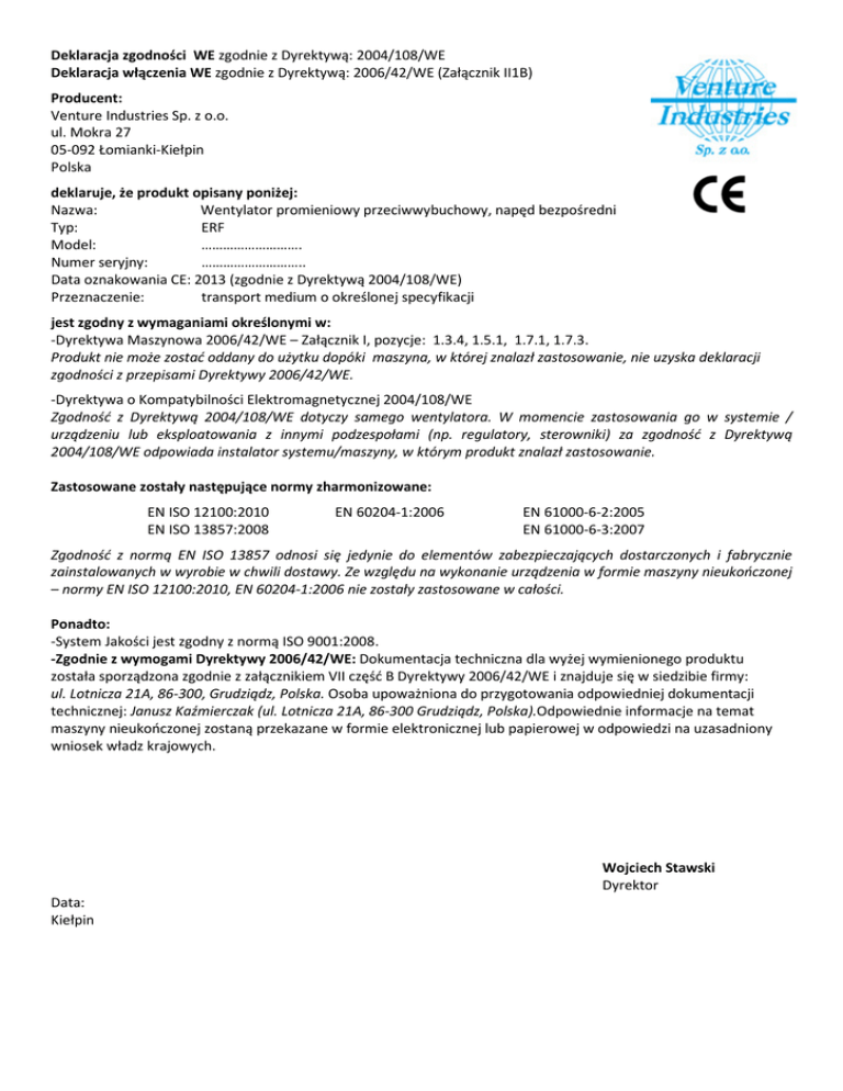 Deklaracja zgodności WE zgodnie z Dyrektywą: 2004/108/WE Deklaracja włączenia WE zgodnie z Dyrektywą: 2006/42/WE (Załącznik II1B) Producent: Venture Industries Sp. z o.o. ul. Mokra 27 05-092 Łomianki-Kiełpin Polska deklaruje, że produkt opisany poniżej: Nazwa: Wentylator promieniowy przeciwwybuchowy, napęd bezpośredni Typ: ERF Model: ………………………. Numer seryjny: ……………………….. Data oznakowania CE: 2013 (zgodnie z Dyrektywą 2004/108/WE) Przeznaczenie: transport medium o określonej specyfikacji jest zgodny z wymaganiami określonymi w: -Dyrektywa Maszynowa 2006/42/WE – Załącznik I, pozycje: 1.3.4, 1.5.1, 1.7.1, 1.7.3. Produkt nie może zostać oddany do użytku dopóki maszyna, w której znalazł zastosowanie, nie uzyska deklaracji zgodności z przepisami Dyrektywy 2006/42/WE. -Dyrektywa o Kompatybilności Elektromagnetycznej 2004/108/WE Zgodność z Dyrektywą 2004/108/WE dotyczy samego wentylatora. W momencie zastosowania go w systemie / urządzeniu lub eksploatowania z innymi podzespołami (np. regulatory, sterowniki) za zgodność z Dyrektywą 2004/108/WE odpowiada instalator systemu/maszyny, w którym produkt znalazł zastosowanie. Zastosowane zostały następujące normy zharmonizowane: EN ISO 12100:2010 EN ISO 13857:2008 EN 60204-1:2006 EN 61000-6-2:2005 EN 61000-6-3:2007 Zgodność z normą EN ISO 13857 odnosi się jedynie do elementów zabezpieczających dostarczonych i fabrycznie zainstalowanych w wyrobie w chwili dostawy. Ze względu na wykonanie urządzenia w formie maszyny nieukończonej – normy EN ISO 12100:2010, EN 60204-1:2006 nie zostały zastosowane w całości. Ponadto: -System Jakości jest zgodny z normą ISO 9001:2008. -Zgodnie z wymogami Dyrektywy 2006/42/WE: Dokumentacja techniczna dla wyżej wymienionego produktu została sporządzona zgodnie z załącznikiem VII część B Dyrektywy 2006/42/WE i znajduje się w siedzibie firmy: ul. Lotnicza 21A, 86-300, Grudziądz, Polska. Osoba upoważniona do przygotowania odpowiedniej dokumentacji technicznej: Janusz Kaźmierczak (ul. Lotnicza 21A, 86-300 Grudziądz, Polska).Odpowiednie informacje na temat maszyny nieukończonej zostaną przekazane w formie elektronicznej lub papierowej w odpowiedzi na uzasadniony wniosek władz krajowych. Wojciech Stawski Dyrektor Data: Kiełpin Deklaracja zgodności WE zgodnie z Dyrektywą: 94/9/WE Producent: Venture Industries Sp. z o.o. ul. Mokra 27 05-092 Łomianki-Kiełpin Polska deklaruje, że produkt opisany poniżej: Nazwa: Wentylator promieniowy przeciwwybuchowy, napęd bezpośredni Typ: ERF Model: .………………………………….. Numer seryjny wentylatora: ………………….……………….. Typ silnika: ..……………….……………….. Numer seryjny silnika: ……………………………….….. Data oznakowania CE: 2013 (zgodnie z Dyrektywą 94/9/WE) Przeznaczenie: transport medium o określonej specyfikacji 0344 jest zgodny z wymaganiami określonymi w: -Dyrektywa ATEX 94/9/WE Produkt nie może zostać wprowadzony do użycia dopóki maszyna, instalacja lub system, w którym znalazł zastosowanie, nie został uznany za zgodny z wymogami Dyrektywy 99/92/WE wraz z jej późniejszymi zmianami. Zastosowane zostały następujące normy zharmonizowane: PN-EN 13463-1:2010 PN-EN 13463-5:2012 PN-EN 14986: 2009 Zgodność z normą EN 14986 jest spełniona jedynie po zastosowaniu po stronie ssawnej wentylatora odpowiedniej ochrony przed zassaniem ciał stałych. Ponadto: - System zapewnienia jakości dla produkcji urządzeń przeznaczonych do stref zagrożonych wybuchem wg. Dyrektywy „ATEX” 94/9/WE jest zgodny z EN ISO/IEC 80079-34:2011. Wojciech Stawski Dyrektor Data: Kiełpin