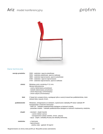 Ariz model konferencyjny Dane techniczne wersje produktu stelaż blat podłokietniki stopki siedzisko 550V - siedzisko i oparcie plastikowe 555V - siedzisko plastikowe, oparcie siatkowe 560V - siedzisko tapicerowane, oparcie plastikowe 570V - siedzisko i oparcie tapicerowane 575V - siedzisko tapicerowane, oparcie siatkowe Metalowy pręt o przekroju fi 11 mm. Wersje kolorystyczne: - czarny (lakierowany proszkowo) - metalik (lakierowany proszkowo) - chrom błyszczący (chromowany) - chrom satyna (chromowany) Z lewej lub z prawej strony, występuje tylko w wersji krzeseł bez podłokietników, kolor stelaża blatu zawsze chrom. Metalowe, zintegrowane ze stelażem, wykończone nakładką PP (kolor nakładki PP koresponduje z kolorami tworzywa): - 550V 2P – nakładki podłokietników dostępne w kolorach krzesła, - pozostałe modele – nakładki podłokietników dostępne w kolorach maskownicy siedziska. - standard - stopki twarde - czarne (stelaż czarny) - transparentne (stelaż metalik, chrom, satyna) - opcja - stopki z wkładką filcową lub wkładką teflonową - z tworzywa - tapicerowane - pianka cięta - gęstość 35 kg/m3 Wygenerowano ze strony www.profim.pl. Wszystkie prawa zastrzeżone. 1/3 - maskownica: czarna (stelaż czarny i chromowany ) i szara (stelaż metalik) oparcie - z tworzywa - tapicerowane - pianka cięta - gęstość 35 kg/m3 - siatkowe waga netto 550V, 575V - 6,5 kg 550V 2P, 575V 2P - 8,0 kg 555V - 6,0 kg 555V 2P - 7,5 kg 560V - 7,0 kg 560V 2P - 8,5 kg 570V - 7,5 kg 570V 2P - 9,0 kg W - 13,0 kg waga brutto 550V, 575V - 10,5 kg 550V 2P, 575V 2P - 12,0 kg 555V - 10,0 kg 555V 2P - 11,5 kg 560V - 11,0 kg 560V 2P - 12,5 kg 570V - 11,5 kg 570V 2P - 13,0 kg W - 16,0 kg sztaplowanie 15/45* szt. - 550V, 555V 10/45* szt. - 550V 2P, 555V 2P 5/20* szt. - 560V, 560V 2P, 570V, 570V 2P, 575V, 575V 2P *Sztaplowanie na wózku do transportu. dodatkowe łączenie w rzędy; wózek do transportu krzeseł (W), kosz na gazety (K) Wymiary Wygenerowano ze strony www.profim.pl. Wszystkie prawa zastrzeżone. 2/3 Wygenerowano ze strony www.profim.pl. Wszystkie prawa zastrzeżone. 3/3