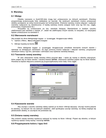 Auto CAD 14 8-1 8. Warstwy. 8.1 Wstęp Obiekty rysowane w AutoCAD-dzie mogą być umieszczone na różnych warstwach. Warstwy przypominają przezroczyste folie nakładane na rysunek. Na osobnych warstwach można umieszczać obiekty powiązane ze sobą konstrukcyjnie lub funkcjonalnie. Wybrane warstwy można włączać i wyłączać (warstwy wyłączone są niewidoczne). Z każdą warstwą można związać kolor oraz typ linii (np. ciągła, przerywana, kropkowana itd.) Wszystkie są umieszczane na tzw. warstwie bieżącej. Standardowo w każdym rysunku zdefiniowana jest warstwa o nazwie „0”. Jeżeli nie zdefiniujesz innych warstw, to wszystko, co narysujesz będzie umieszczone na warstwie 0. 8.2 Sterowanie warstwami Aby przejść do okna dialogowego Layer & Linetype Properties należy: !"wybrać z Menu, Menu⇒ ⇒Format⇒ ⇒Layer !"kliknąć myszką na ikonie Okno dialogowe Layer & Linetype Properties umożliwia tworzenie nowych warstw i operacje na istniejących warstwach. Za jego pomocą można wyłączać i włączać warstwy, przypisywać warstwom kolory i typ linii, zamrażać i odmrażać oraz wybierać warstwę bieżącą. 8.3 Tworzenie nowej warstwy W celu utworzenia nowej warstwy kliknij przycisk New i wpisz jej nazwę w okienku edycyjnym, które pojawi się na liście warstw i naciśnij klawisz ENTER. Utworzona warstwa pojawi się na liście warstw. Warstwa ta będzie włączona zostanie jej przyporządkowany kolor biały i linia ciągła 8.4 Kasowanie warstw Aby usunąć z rysunku warstwę należy wybrać je na liście i kliknąć Delete. Usunąć można jedynie te warstwy, na których nie ma żadnych obiektów. Jeśli spróbujesz usunąć warstwę, na której znajduje się jakiekolwiek obiekty, to usunięcie nie powiedzie się. 8.5 Zmiana nazwy warstwy Aby zmienić nazwę warstwy wystarczy wskazać tę nazwę na liście i kliknąć. Pojawi się okienko, w którym wystarczy wpisać nową nazwę i nacisnąć ENTER. 8.6 Przypisywanie koloru i typu linii Auto CAD 14 8-2 Do każdej warstwy przypisany jest kolor oraz typ linii. Rysowane obiekty przyjmują kolor oraz typ linii w zależności od warstwy, na której się znajdują. Kliknij by przypisać kolor Kliknij by przypisać typ linii Po kliknięciu okienka wyświetlającego kolor warstwy na ekranie pojawi się okno dialogowe umożliwiające wybór koloru, który ma być przypisany warstwie. Po kliknięciu nazwy typu linii na ekranie pojawi się okno dialogowe umożliwiające wybór typu linii, który ma być przypisany warstwie. Auto CAD 14 8-3 Jeżeli w oknie nie będą widoczne typy linii nieciągłych, to wczytaj je za pomocą przycisku Load. 8.7 Status warstw W oknie dialogowym wyświetlone są nazwy warstw zdefiniowanych w rysunku oraz dołączonych z odnośników zewnętrznych. Status warstw jest określony za pomocą charakterystycznych znaczków widocznych na liście warstw. Znaczki te to ikonko-przełączniki, które pokazują bieżący status, a po kliknięciu zmieniają swój status. Kliknij wybrany ikono-przełącznik Znaczenie poszczególnych ikono-przełączników jest następujące: - warstwa włączona - warstwa wyłączona - warstwa zamrożona (zablokowana) - warstwa odmrożona (odblokowana) - warstwa zamknięta - warstwa otwarta - warstwa zamrożona (zablokowana) w bieżącej rzutni - warstwa odmrożona (odblokowana) w bieżącej rzutni - warstwa zamrożona (zablokowana) w nowych rzutniach - warstwa odmrożona (odblokowana) w nowych rzutniach 8.8 Zadanie Auto CAD 14 8-4 Narysuj dowolne obiekty oraz nadaj im warstwy zgodnie z poniższą tabelką. Nazwa warstwy Przerwanie Napisy Oś Przedłużenie Kreskowanie Cienkie Wymiar Kolor warstwy Niebieski Czarny Żółty Zielony Czerwony Fioletowy Czarny Typ linii Linia kreskowa Linia ciągła Linia kreska kropka Linia kreska dwie kropki Linia ciągła Linia kropkowa Linia ciągła