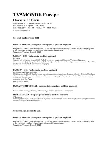 TV5MONDE Europe Horaire de Paris Direction de la Communication - TV5MONDE 131, avenue de Wagram - 75017 Paris Tél. : 33 (0)1 44 18 55 55 - Fax : 33 (0)1 44 18 48 28 www.tv5monde.com Sobota 1 pa ździernika 2011 5:15 SUR MESURES / magazyn « odkrycia » (z polskimi napisami) Kaligrafista, szewc, « skubacz piór »...to nie są zapomniane zawody. Razem z autorami programu « Sur mesures » odkryj niezwykłych artystów i ich rzemiosło. Reżyseria: Vivianne Blassel, 2010 7:00 360° - GÉO / dokument z polskimi napisami Sól Inków Kopalnie soli w Maras, w peruwiańskich Andach, tworzą sieć rozległych labiryntów. W sercu tych pejzaży, które należą do najpiękniejszych w Ameryce Południowej, Andrea Oster spotkał rodziny pracowników kopalni. Tak jak ich przodkowie, zbierają "białe złoto" metodą tradycyjną. 14:00 360° - GÉO / dokument z polskimi napisami Turbulencje w Cieśninie Magellana Chilijski przewodnik Erich Guital prowadzi nas do jednego z najmniej gościnnych regionów świata – Cieśniny Magellana, miejsca znanego z dzikości sztormów, nieoczekiwanej zmiany pogody i niepomyślnych wiatrów. W tym miejscu, rzadko kiedy morze jest spokojne... Rezyseria : Sven Jaax, 2009. Kraj : Niemcy/ Francja 17:05 ARTE REPORTAGE / program informacyjny z polskimi napisami Wiadomości z całego świata, aktualne zagadnienia polityczne i spo łeczne 18:30 THALASSA / magazyn podróżniczy z polskimi napisami W Dunkierce W tym tygodniu ekipa « Thalassy » odwiedzi wybrzeże Flandrii i zwiedzi słynną Dunkierkę. Nasz statek wypłynie również na szerokie wody w stronę Skandynawii. Niedziela 2 pa ździernika 2011 5:20 SUR MESURES / magazyn « odkrycia » (z polskimi napisami) Kaligrafista, szewc, « skubacz piór »...to nie są zapomniane zawody. Razem z autorami programu « Sur mesures » odkryj niezwykłych artystów i ich rzemiosło. Reżyseria: Vivianne Blassel, 2010 12:45 SUR MESURES / magazyn « odkrycia » (z polskimi napisami) Kaligrafista, szewc, « skubacz piór »...to nie są zapomniane zawody. Razem z autorami programu « Sur mesures » odkryj niezwykłych artystów i ich rzemiosło. Reżyseria: Vivianne Blassel, 2010 21:05 LE FEU FOLLET / dramat z polskimi napisami Alain Leroy właśnie wyszedł z odwyku. Czując, że jego życie nie jest nic warte, postanawia ze sobą skończyć. Przed zadaniem sobie smierci, chce odwiedzić dawnych przyjaciół. Wizyta ta utwierdza go w decyzji o samobójstwie... Reżyseria : Louis Malle, 1963 (czarno-biały) Występują : Maurice Ronet (Alain Leroy), Jeanne Moreau (Eva), Alexandra Stewart (Solange), Bernard Noël (Dubourg), Lena Skerla (Lydia)... Kraj : Francja 22:45 BYE BYE / film krótkometra żowy z polskimi napisami Spokojne popołudnie matki i jej córek na kilka dni przed Bożym Narodzeniem... Reżyseria : Edouard Deluc, 2011 Występują: Nathalie Baye (Cécile), Sabrina Ouazani (Rosa), Mati Diop (Jehanne), Vanessa Mikowski (Leïla)... Kraj : Francja Poniedziałek 3 pa żdziernika 2011 14:00 MA TERRE / magazyn podróżniczy Magazyn « Ma Terre » skupia się na poznawaniu dziedzictwa kulturowego i historii Walonii – regionu Belgii. 17:05 LE POINT / magazyn informacyjny (z polskimi napisami) prowadzący : Céline Galipeau. Dzięki dziennikarzom rozproszonym po całym świecie, magazyn « Le point » daje nastychmiastowy dostęp do każdego wydarzenia. Jest wiarygodnym źródłem wiedzy na temat tego, co dzieje się w najważniejszych obszarach wszsytkich kontynentów 18:35 LES OUBLIÉES / serial kryminalny z polskimi napisami Przez kolejne 15 lat, sześć kobiet zniknęło w niewyjaśnionych okolicznościach. Icha ciała nigdy nie zostały odnalezione, nie znaleziono również żadnych wskazówek, co mogło stać się z ofiarami. Jedyna wskazówka : po każdym zniknięciu, sprawca pozostawiał na ławkach wyprane i wyprasowane ubrania swoich ofiar. Kapitan Christian Janvier obsesyjnie chce rozwiąza ć tę zagadkę... Reżyseria : Hervé Hadmar, 2007 Scenariusz : Hervé Hadmar et Marc Herpoux Występują : Jacques Gamblin (Christian Janvier), Aïssa Fabien Busetta (Olivier Ducourt), William Nadylam (le juge Galbert), Nathalie Besançon (Suzanne Janvier), Priscilla Attal (Caroline Janvier), Arsène Jiroyan (Roland Guerrand), Morgane Cabot (Clara), Annie Bertin (madame Juisnard), Fred Bouraly (Bourgueux), Didier Constant (Hermand) 19:25 LES OUBLIÉES / serial kryminalny z polskimi napisami Przez kolejne 15 lat, sześć kobiet zniknęło w niewyjaśnionych okolicznościach. Icha ciała nigdy nie zostały odnalezione, nie znaleziono również żadnych wskazówek, co mogło stać się z ofiarami. Jedyna wskazówka : po każdym zniknięciu, sprawca pozostawiał na ławkach wyprane i wyprasowane ubrania swoich ofiar. Kapitan Christian Janvier obsesyjnie chce rozwiąza ć tę zagadkę... Reżyseria : Hervé Hadmar, 2007 Scenariusz : Hervé Hadmar et Marc Herpoux Występują : Jacques Gamblin (Christian Janvier), Aïssa Fabien Busetta (Olivier Ducourt), William Nadylam (le juge Galbert), Nathalie Besançon (Suzanne Janvier), Priscilla Attal (Caroline Janvier), Arsène Jiroyan (Roland Guerrand), Morgane Cabot (Clara), Annie Bertin (madame Juisnard), Fred Bouraly (Bourgueux), Didier Constant (Hermand) 22:00 360° - GÉO / dokument z polskimi napisami Turbulencje w Cieśninie Magellana Chilijski przewodnik Erich Guital prowadzi nas do jednego z najmniej gościnnych regionów świata – Cieśniny Magellana, miejsca znanego z dzikości sztormów, nieoczekiwanej zmiany pogody i niepomyślnych wiatrów. W tym miejscu, rzadko kiedy morze jest spokojne... Rezyseria : Sven Jaax, 2009. Kraj : Niemcy/ Francja 23:55 ZAZIE DANS LE MÉTRO / komedia z polskimi napisami 10-letnia Zazie przyjeżdża po raz pierwszy do Paryża. Opiekuje sie nią wujek, który oczarowany jest jej elegancj ą i wygadaniem. Zazie ma jedno życzenia : przejechać się metrem. Niestety, pracownicy metra strajkują i dziwczynak nie może zrealizowac swojego celu. Postana