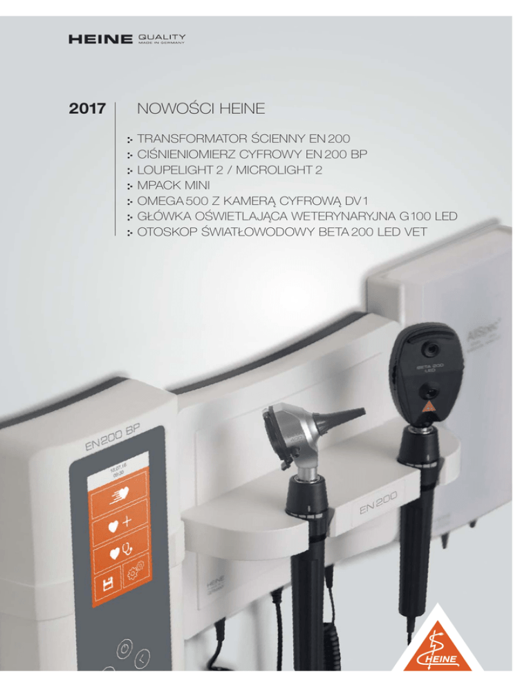 2017 NOWOŚCI HEINE TRANSFORMATOR ŚCIENNY EN 200 CIŚNIENIOMIERZ CYFROWY EN 200 BP LOUPELIGHT 2 / MICROLIGHT 2 MPACK MINI OMEGA 500 Z KAMERĄ CYFROWĄ DV 1 GŁÓWKA OŚWIETLAJĄCA WETERYNARYJNA G 100 LED OTOSKOP ŚWIATŁOWODOWY BETA 200 LED VET HEINE | TRANSFORMATOR ŚCIENNY EN 200 Transformator ścienny HEINE EN 200 Nowoczesny, energooszczędny system ścienny w sprawdzonej jakości HEINE Doskonała efektywność energetyczna. Niższy pobór prądu zmniejsza koszty i jest bardziej przyjazny środowisku. Jednoczesne stosowanie rękojeści. Dwoje lekarzy może używać urządzenia do badania niezależnie od siebie. Łatwe czyszczenie. Płaska, kompaktowa obudowa, bez otworów umożliwia łatwe czyszczenie. Brak mechanicznych przełączników zmniejsza ryzyko infekcji krzyżowej. Płynna regulacja jasności pomiędzy 100 % a 3 % zarówno dla oświetlenia XHL i LED. Gotowość do użycia w każdej chwili. Dzięki zastosowaniu najnowocześniejszej technologii w HEINE EN 200 rękojeść włącza i wyłącza się automatycznie, kiedy zostaje podniesiona lub odłożona. Raz ustawiony poziom jasności pozostaje taki sam za każdym razem, kiedy ponownie używasz instrumentu. Możliwość rozbudowy. Urządzenie posiada port USB umożliwiający jego rozbudowę o dodatkowe moduły HEINE, takie jak nowy ciśnieniomierz cyfrowy HEINE EN 200 BP. Technologia Soft Start. Zwiększa żywotność żarówek dzięki umiarkowanemu, oszczędnemu dopływowi prądu podczas załączania urządzenia. Więcej informacji na stronach 134 – 135. HEINE | CIŚNIENIOMIERZ CYFROWY EN 200 BP Ciśnieniomierz cyfrowy HEINE EN 200 BP Wiarygodne i istotne medycznie wartości pomiarów dla profesjonalnej diagnozy Cyfrowy, w pełni automatyczny i z przyjaznym menu. Łatwy w użyciu, optymalizuje i oszczędza czas pracy. Łatwiejszy w utrzymaniu czystości dzięki zoptymalizowanej konstrukcji bez żadnych ruchomych elementów sterujących. Trzy tryby pomiaru. Dwa automatyczne i jeden ręczny tryb pomiaru: szybkie pomiary pojedyncze, podwójne pomiary i pomiary manualne (osłuchiwanie stetoskopem). Pamięć 500 odczytów w trybie pomiaru. Szybkozłącze. Mankiety (wielokrotnego użytku mankiety i mankiety jednego pacjenta) mogą być zmienione w ciągu kilku sekund. Odpowiedni rozmiar mankietu dla każdego pacjenta. Znakomita dokładność pomiaru z absolutnie precyzyjnym wynikiem (+/- 3 mmHg). Dostępny jako pojedyncza jednostka (zasilanie z transformatora sieciowego) lub jako element Centrum Diagnostycznego EN 200 (zasilanie z transformatora EN 200). Więcej informacji na stronach 092 – 093. HEINE | LOUPELIGHT 2 / MICROLIGHT 2 HEINE LoupeLight 2 / MicroLight 2 Kompaktowa diodowa lampka z LEDHQ – teraz jeszcze jaśniejsza NOWOŚĆ: Przewód zasilający SC 1. Wymienny przewód połączeniowy z wysokiej jakości, odpornym na zabrudzenie gwintowanym łącznikiem o długości 1,6 m. NOWOŚĆ: ok. 55 000 luksów. Całkowicie jednolite oświetlenie całego pola widzenia daje w rezultacie wyraźnie odgraniczony punkt świetlny. Oświetlenie współosiowe: kompaktowa konstrukcja ze współosiowym oświetleniem zapewnia obraz bez cieni i umożliwia dobre oświetlenie miejsc trudnych do oglądu. Kompaktowa, lekka (80 g z ramką okularową S-FRAME) dla zapewnienia komfortu noszenia. Aluminiowy korpus – zgrabny i wytrzymały, chroni optykę przed kurzem i brudem, zapewniając wyjątkowo długą żywotność. LED w jakości HQ. Nowy standard oświetlenia LED zapewniający optymalne natężenie, jednorodność i odwzorowanie kolorów, co pozwala na precyzyjną diagnostykę. Czerwony to czerwony, niebieski to niebieski. Temperatura koloru ok. 4 000 K, wskaźnik odwzorowania koloru (CRI) > 90, specjalny wskaźnik dla koloru czerwonego: R9 > 75. Więcej informacji na stronach 113 – 117. HEINE | MPACK MINI Porównanie wielkości HEINE mPack LL / mPack mini HEINE mPack mini Kompaktowe i lekkie źródło zasilania do LoupeLight 2 i MicroLight 2 NOWOŚĆ: Kompaktowa i lekka. Waga tylko 81g; wymiary 44 x 23 x 101mm. NOWOŚĆ: Standardowy czas pracy to 9 godzin. (W ciągłej pracy przy pełnej mocy – około 4 godzin.) NOWOŚĆ: mPack mini można ładować przy użyciu każdej ładowarki USB lub innego źródła energii ze złączem USB z absolutnym spokojem. Zintegrowany moduł separacji galwanicznej chroni baterię akumulatorową i użytkownika przed skutkami wadliwych źródeł zasilania. Czas ładowania wynosi około 4 godzin. Technologia litowo-jonowa. Brak „efektu pamięci”, bez obaw o poziom naładowania baterii i jej żywotność. Wolność od kabli, które wiążą użytkownika z biurkiem, ścianą lub innym stałym źródłem zasilania. Wskaźnik stanu naładowania. Wyświetla pozostały poziom naładowania baterii przy użyciu trzech diod LED. Płynna regulacja jasności. Optymalna regulacja jasności pomiędzy 100 % a 3 % zapobiega niepożądanym refleksom. Więcej informacji na stronie 133. HEINE | OMEGA® 500 Z KAMERĄ CYFROWĄ DV 1 Oftalmoskop pośredni HEINE OMEGA® 500 z kamerą cyfrową DV 1 Cyfrowe obrazowanie dna oka w wysokiej rozdzielczości NOWOŚĆ: rozdzielczość 5 megapikseli. Do pozyskiwania obrazów i filmów w wysokiej rozdzielczości. Żadnych przeszkadzających zakłóceń w obrazie dzięki podwyższonej światłoczułości kamery. Idealna kamera, aby dzielić się obrazem widzianym przez badającego z osobami obserwującymi badanie, do wyjaśniania diagnozy pacjentowi i do dokumentacji jego choroby oraz do nagrywania techniki badania w celu szerszej prezentacji. Nadaje się również do badania wcześniaków. Prosta obsługa. Cyfrowe obrazowanie bez jakichkolwiek dodatkowych regulacji. Po prostu rozpocznij nagrywanie i obraz widziany przez oftalmoskop OMEGA 500 zostanie pokazany na monitorze lub ekranie. Więcej informacji na stronie 057. Zintegrowana regulacja ogniskowania. Wysoka głębia ostrości instrumentu łącznie z łatwą do obsługi regulacją ogniskowania zapewniają, także dla asystenta, wyr