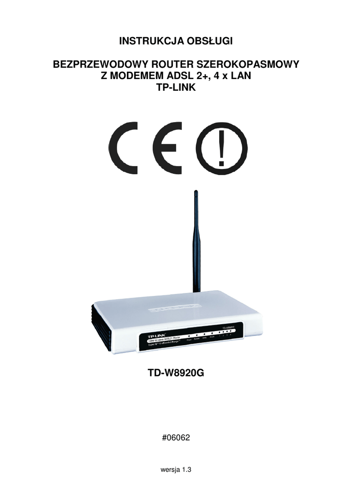 INSTRUKCJA OBSŁUGI BEZPRZEWODOWY ROUTER SZEROKOPASMOWY Z MODEMEM ADSL 2+, 4 x LAN TP-LINK TD-W8920G #06062 wersja 1.3 Wstęp Bezprzewodowy router szerokopasmowy z modemem ADSL 2+ przeznaczony jest do współpracy z istniejącymi liniami telefonicznymi i pozwala na podłączenie komputera PC do sieci Internet za pomocą łącza ADSL. Router umoŜliwia łatwe i stosunkowo tanie przyśpieszenie transmisji danych, jak i wspólne wykorzystanie szerokopasmowego łącza oraz połączenia bezprzewodowego przez kilku uŜytkowników sieci lokalnej. Urządzenie wykorzystuje technologię 2x to 3x eXtended Range ™, która umoŜliwia 2 lub 3 krotne zwiększenie zasięgu przy zastosowaniu tradycyjnych rozwiązać standardu 11b/g. Ponadto router korzysta z technologii 108M Super G™ WLAN Transmission Techlology, umoŜliwiającej uzyskanie maksymalnej przepustowości do 108Mb/s. Urządzenie łączy w sobie 4-portowy przełącznik, zaporę ogniowa, router sieci NAT i bezprzewodowy punkt dostępowy. Został zaprojektowany dla małych biur oraz domowych sieci bezprzewodowych. Dzięki zastosowaniu licznych systemów zabezpieczeń zarówno dla infrastruktury WLAN jak i LAN, korzystanie z bezprzewodowej sieci jest bardzo bezpieczne. Dodatkowymi atutami urządzenia jest wyposaŜenie w serwer DHCP, obsługa PPPoE, DDNS, VPN, LAN ACL, serwery wirtualne, strefa DMZ, kontrola rodzicielska oraz SIP ALG. Oświadczenie ETSI dotyczące zakłóceń Urządzenie generuje i wykorzystuje fale o częstotliwościach radiowych. Instalacja niezgodna z podanymi w instrukcji zaleceniami moŜe powodować zakłócenia w komunikacji radiowej i spowodować pracę urządzenia niezgodną z przepisami prawa. OstrzeŜenie NaleŜy zapewnić bezpieczne warunki pracy urządzenia. Dokonanie przez uŜytkownika jakichkolwiek własnych zmian w urządzeniu moŜe spowodować utratę moŜliwości jego legalnego uŜytkowania. Bezpieczeństwo uŜytkowania Urządzenie zostało zaprojektowane i wyprodukowane z najwyŜszą starannością o bezpieczeństwo osób instalujących i uŜytkujących. Dla zapewnienia bezpieczeństwa pracy, naleŜy stosować się do wszelkich wskazań zawartych w tej instrukcji jak i instrukcjach obsługi urządzeń towarzyszących (np. komputera PC). Oświadczenie dotyczące promieniowania Nie powinno się przebywać w odległości mniejszej niŜ 20cm od pracującego urządzenia. Deklaracja zgodności R&TTE Urządzenie pracuje zgodnie z wymaganiami zawartymi w dyrektywie europejskiej opisującej urządzenia radiowe, terminale telekomunikacyjne oraz ich wzajemne rozpoznawanie i zgodność. (Directive 1999/5/CE of the European Parliament and the Council of Europe, march 1999, on radio equipment and telecommunication terminal equipment and the mutual recognition of their conformity). Kraje przeznaczenia Urządzenie jest przystosowane do pracy na terenie Polski. Urządzenie pracujące w trybie ETSI jest przeznaczone do pracy w warunkach domowych i biurowych w krajach Unii Europejskiej, a takŜe w Norwegii i Szwajcarii - członkach EFTA. Nie ma krajów europejskich, w których nie zaleca się stosowania tego urządzenia. Ograniczenia w uŜytkowaniu Francja: dopuszcza się pracę tego urządzenia wyłącznie na kanałach nr 10, 11, 12, 13 (IEEE 802.11b/g). 2 1. Zawartość opakowania - bezprzewodowy router szerokopasmowy z modemem ADSL 2+ TD-W8920G, - zewnętrzny zasilacz AC/DC, - przyłącze UTP z wtykiem RJ-45, - dwa przyłącza telefoniczne z wtykami RJ-11, - rozdzielacz ADSL, - skrócona instrukcja obsługi w języku angielskim, - płyta CD, - niniejsza instrukcja obsługi. Podczas dostawy naleŜy upewnić się, Ŝe opakowanie nie jest uszkodzone. W przypadku stwierdzonych uszkodzeń naleŜy niezwłocznie skontaktować się z dostawcą. Prosimy równieŜ o sprawdzenie zgodności zawartości opakowania z powyŜej zamieszczoną listą. 2. Zawartość instrukcji Instrukcja ta zawiera opis bezprzewodowego routera szerokopasmowego z modemem ADSL 2+ TD-W8920G z odpowiednimi procedurami instalacji, konfiguracji i uŜytkowania. Przed przystąpieniem do instalacji urządzenia naleŜy dokładnie przeczytać całość tej instrukcji, w szczególności zaś punkty poświęcone bezpieczeństwu. 3. Zasady bezpieczeństwa Bezprzewodowy router szerokopasmowy z modemem ADSL 2+ jest zgodny z przepisami w zakresie bezpieczeństwa uŜytkowania urządzeń elektrycznych. NaleŜy przestrzegać zaleceń: - gniazdo sieciowe musi być uziemione zgodnie z obowiązującymi przepisami, - przed przeniesieniem lub wykonywaniem innych operacji technicznych urządzenie naleŜy odłączyć od zasilania, - nie stosować uszkodzonych lub zuŜytych przewodów zasilania, gdyŜ powodują one znaczne zagroŜenie dla bezpieczeństwa uŜytkownika, - prace instalacyjne muszą być wykonywane przez odpowiednio przeszkolony personel techniczny, - nie stosować urządzenia w miejscach występowania substancji łatwopalnych, - zabezpieczyć urządzenie przed dostępem dzieci lub osób niepowołanych, - upewnić się, Ŝe urządzenie zostało odpowiednio zamocowane, - urządzenie traktowane jest jako wyłączone dopiero po odłączeniu przewodów zasilania oraz przewodów łączących je z innymi urządzeniami, - jeśli urządzenie zostanie przeniesione z miejsca chłodnego do ciepłego, w jego wnętrzu moŜe skroplić się para wodna uniemoŜliwiając prawidłowe funkcjonowanie. NaleŜy wówczas odczekać, aŜ wilgoć odparuje. Uwaga! Nie naleŜy dotykać styków gniazd znajdujących się na obudowie urządzenia. Wyładowanie elektrostatyczne moŜe spowodować trwałe uszkodzenie urządzenia. 4. Instalacja sprzętu 4.1 Zasilanie Bezprzewodowy router szerokopasmowy z modemem ADSL 2+ TD-W8920G jest zasilany przez dostarczony zewnętrzny zasilacz AC/DC. NaleŜy podłączyć zasilacz do sieci prądu przemiennego 230V 50 Hz, a złącze 9V AC naleŜy wpiąć do gniazda zasilania urządzenia (oznaczonego jako POWER). 4.2 Oprogramowanie Do prawidłowego funkcjonowania urządzeni