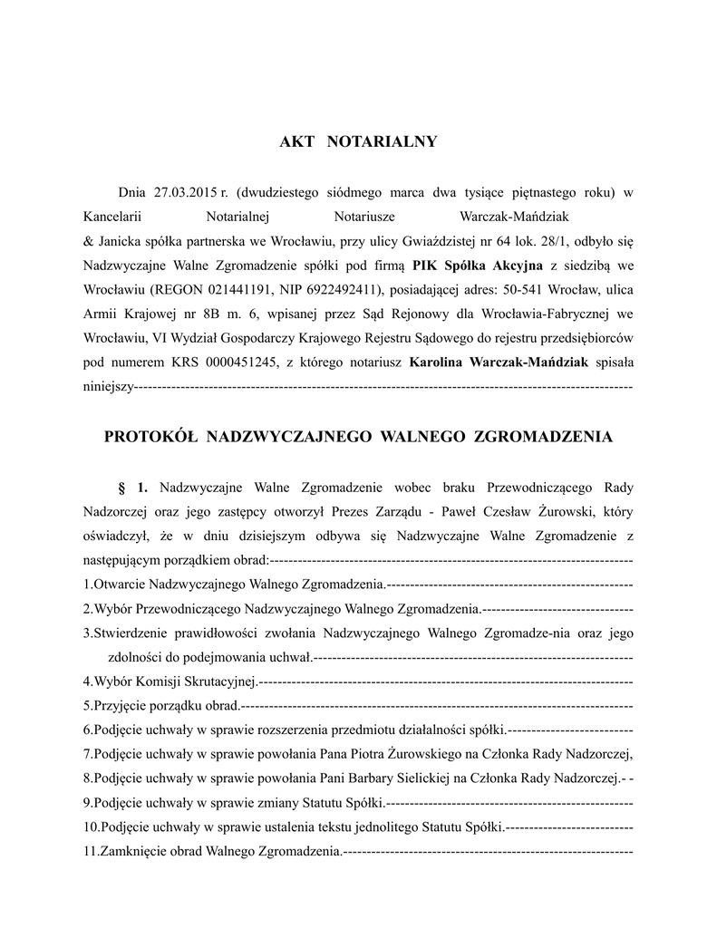 AKT NOTARIALNY Dnia 27.03.2015 r. (dwudziestego siódmego marca dwa tysiące piętnastego roku) w Kancelarii Notarialnej Notariusze Warczak-Mańdziak & Janicka spółka partnerska we Wrocławiu, przy ulicy Gwiaździstej nr 64 lok. 28/1, odbyło się Nadzwyczajne Walne Zgromadzenie spółki pod firmą PIK Spółka Akcyjna z siedzibą we Wrocławiu (REGON 021441191, NIP 6922492411), posiadającej adres: 50-541 Wrocław, ulica Armii Krajowej nr 8B m. 6, wpisanej przez Sąd Rejonowy dla Wrocławia-Fabrycznej we Wrocławiu, VI Wydział Gospodarczy Krajowego Rejestru Sądowego do rejestru przedsiębiorców pod numerem KRS 0000451245, z którego notariusz Karolina Warczak-Mańdziak spisała niniejszy---------------------------------------------------------------------------------------------------------- PROTOKÓŁ NADZWYCZAJNEGO WALNEGO ZGROMADZENIA § 1. Nadzwyczajne Walne Zgromadzenie wobec braku Przewodniczącego Rady Nadzorczej oraz jego zastępcy otworzył Prezes Zarządu - Paweł Czesław Żurowski, który oświadczył, że w dniu dzisiejszym odbywa się Nadzwyczajne Walne Zgromadzenie z następującym porządkiem obrad:----------------------------------------------------------------------------1.Otwarcie Nadzwyczajnego Walnego Zgromadzenia.---------------------------------------------------2.Wybór Przewodniczącego Nadzwyczajnego Walnego Zgromadzenia.-------------------------------3.Stwierdzenie prawidłowości zwołania Nadzwyczajnego Walnego Zgromadze-nia oraz jego zdolności do podejmowania uchwał.-------------------------------------------------------------------4.Wybór Komisji Skrutacyjnej.-------------------------------------------------------------------------------5.Przyjęcie porządku obrad.----------------------------------------------------------------------------------6.Podjęcie uchwały w sprawie rozszerzenia przedmiotu działalności spółki.-------------------------7.Podjęcie uchwały w sprawie powołania Pana Piotra Żurowskiego na Członka Rady Nadzorczej, 8.Podjęcie uchwały w sprawie powołania Pani Barbary Sielickiej na Członka Rady Nadzorczej.- 9.Podjęcie uchwały w sprawie zmiany Statutu Spółki.---------------------------------------------------10.Podjęcie uchwały w sprawie ustalenia tekstu jednolitego Statutu Spółki.--------------------------11.Zamknięcie obrad Walnego Zgromadzenia.-------------------------------------------------------------- Ad 2) Paweł Czesław Żurowski zaproponował własną kandydaturę na Przewodniczącego Nadzwyczajnego Walnego Zgromadzenia.-----------------------------------------------------------------Paweł Czesław Żurowski zaproponował podjęcie uchwały w sprawie wyboru Przewodniczącego Walnego Zgromadzenia.---------------------------------------------------------------Uchwała nr 1/2015 Nadzwyczajnego Walnego Zgromadzenia spółki pod firmą PIK Spółka Akcyjna z siedzibą we Wrocławiu z dnia 27 marca 2015 roku w sprawie wyboru Przewodniczącego Walnego Zgromadzenia § 1. Na podstawie regulacji art. 409 § 1 Kodeksu spółek handlowych, Nadzwyczajne Walne Zgromadzenie wybiera na Przewodniczącego Walnego Zgromadzenia Pana Pawła Czesława Żurowskiego, syna Piotra i Teresy, pesel 86053108674, zamieszkałego 59-300 Lubin, ulica Leszczynowa nr 12 m. 11, legitymującego się dowodem osobistym o numerze ASH976672.-----§ 2. Uchwała wchodzi w życie z chwilą podjęcia.-------------------------------------------------------------Paweł Czesław Żurowski stwierdził, że w głosowaniu tajnym wzięło udział 3.800.000 (trzy miliony osiemset tysięcy) akcji, z których oddano 3.800.000 (trzy miliony osiemset tysięcy) ważnych głosów, co stanowi 69,06 % (sześćdziesiąt dziewięć i sześć setnych procenta) kapitału zakładowego, w tym:------------------------------------------------------------------------------------------- za podjęciem uchwały 3.800.000 głosów,----------------------------------------------------- - przeciw 0 głosów,------------------------------------------------------ - wstrzymało się 0 głosów.------------------------------------------------------ Paweł Czesław Żurowski stwierdził, że uchwała została podjęta jednogłośnie.----------------------Paweł Czesław Żurowski wybór ten przyjął.--------------------------------------------------------------- 2 Ad 3) Przewodniczący stwierdził, że Nadzwyczajne Walne Zgromadzenie zostało zwołane z zachowaniem wymogów formalnych, na podstawie art. 399 § 1 w trybie art. 402 Kodeksu spółek handlowych. Przewodniczący oświadczył, że na Nadzwyczajnym Walnym Zgromadzeniu reprezentowane jest 3.800.000 (trzy miliony osiemset tysięcy) akcji, co stanowi 69,06 % (sześćdziesiąt dziewięć i sześć setnych procenta) akcji w kapitale zakładowym uprawnionych do wykonywania prawa głosów na Walnym Zgromadzeniu, a zatem Walne Zgromadzenie odbywa się prawidłowo i jest zdolne do podjęcia ważnych uchwał.-----------------------------------------------------------------------Ad 4) Przewodniczący zaproponował podjęcie uchwały w sprawie wyboru Komisji Skrutacyjnej. Uchwała nr 2/2015 Nadzwyczajnego Walnego Zgromadzenia spółki pod firmą PIK Spółka Akcyjna z siedzibą we Wrocławiu z dnia 27 marca 2015 roku w sprawie wyboru Komisji Skrutacyjnej § 1. Nadzwyczajne Walne Zgromadzenie spółki pod firmą PIK Spółka Akcyjna z siedzibą we Wrocławiu odstępuje od wyboru Komisji Skrutacyjnej.--------------- § 2. Uchwała wchodzi w życie z chwilą podjęcia.--------------------------------------------------------------Przewodniczący stwierdził, że w głosowaniu jawnym wzięło udział 3.800.000 (trzy miliony osiemset tysięcy) akcji, z których oddano 3.800.000 (trzy miliony osiemset tysięcy) ważnych głosów, co stanowi 69,06 % (sześćdziesiąt dziewięć i sześć setnych procenta) kapitału zakładowego, w tym:------------------------------------------------------------------------------------------- 3 - za podjęc