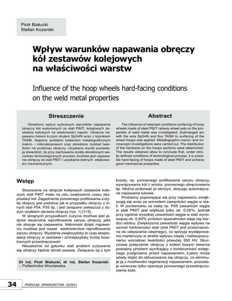 Piotr Białucki Stefan Kozerski wpływ warunków napawania obręczy kół zestawów kolejowych na właściwości warstw influence of the hoop wheels hard-facing conditions on the weld metal properties Streszczenie Abstract Określono wpływ wybranych warunków napawania obręczy kół wykonanych ze stali P60T, kolejowych zestawów kołowych na właściwości napoin. Obręcze napawano łukiem krytym drutem SpG4N wraz z topnikiem TASt6. Napoiny poddano badaniom metalograficznym makro- i mikroskopowym oraz określono rozkład twardości na przekroju obręczy. Uzyskane wyniki pozwalają stwierdzić, że przy zachowaniu ściśle określonych warunków technologicznych procesu możliwe jest napawanie obręczy ze stali P60T i uzyskanie dobrych właściwości mechanicznych. The influence of selected conditions surfacing of hoop wheels made of steel P60T railway wheel sets on the properties of weld metal was investigated. Submerged arc with the wire SpG4N and flux TASt6 to surfacing of the wheel hoops was applied. Metallographic macro- and microscopic investigations were carried out. The distribution of the hardness on the hoops sections were determined. The results obtained allow to conclude that, under strictly defined conditions of technological process, it is possible hard-facing of hoops made of steel P60T and achieve good mechanical properties. Wstęp Stosowanie na obręcze kolejowych zestawów kołowych stali P60T miało na celu zwiększenie czasu eksploatacji kół. Zagadnienie ponownego profilowania zużytej obręczy jest podobne jak w przypadku obręczy z innych stali P54, P55 itp. i jest związane zwłaszcza z dużym ubytkiem obrzeża obręczy (rys. 1) [1÷5]. W skrajnych przypadkach zużycia możliwe jest jedynie dwukrotne reprofilowanie zarysu obręczy, jeśli nie stosuje się napawania. Natomiast dzięki napawaniu możliwe jest nawet siedmiokrotne reprofilowanie zarysu obręczy. Wydatnie zwiększyłoby to czas eksploatacji obręczy w zestawie i zmniejszyłoby liczbę kosztownych przeobręczowań. Niezależnie od gatunku stali problem zużywania się obręczy będzie istniał zawsze. Związane są z tym Dr inż. Piotr Białucki, dr inż. Stefan Kozerski – Politechnika Wrocławska. 34 Przegląd sPawalnictwa 10/2011 koszty, np. ponownego profilowania zarysu obręczy, wywiązywania kół z wózka, ponownego obręczowania itp. Można próbować je obniżyć, stosując automatyczne napawanie łukowe. Problemy pojawiające się przy napawaniu zwiększają się wraz ze wzrostem zawartości węgla w stali. W porównaniu ze stalą np. P55 zawartość węgla w stali P60T jest większa tylko ok. 0,05%, jednak przy ogólnie wysokiej zawartości węgla w stali wynoszącej ok. 0,60% problem spawalności staje się bardzo istotny. Zwiększona zawartość węgla wpływa na wzrost hartowności stali (stal P60T jest przeznaczona do ulepszania cieplnego), co sprzyja występowaniu martenzytu w strefie wpływu ciepła i niebezpiecznemu wzrostowi twardości powyżej 350 HV. Skurczowe połączenie obręczy z kołem bosym stwarza poważny problem wynikający z konieczności wstępnego podgrzania przed napawaniem. Łatwo może wtedy dojść do obluzowania się obręczy, co eliminuje ją z możliwości regeneracji napawaniem, pozostaje wówczas tylko operacja ponownego przeobręczowania koła. a) b) Rys.2.Próbi przygotowane do analizy składu chemicznego na spektrometrze LECO: a) z obręczy ze stali P60T, b) próbka drutu SpG4N Fig. 2. Sample for chemical composition analysis with the use of LECO spectrometer: a) P60T hoop wheel, b) SpG4N wire TablicaIII. Skład chemiczny topnika TA.St. 6 MA Table.III. Chemical composition of the TA.St. 6 MA flux Zawartość składników, % Gat. topnika Rys.1. Kwalifikacja zużytej obręczy do napawania Fig.1.Wear wheel hoop qualifying for hard-facing SiO2+TiO2 Al2O3+MnO+CaO CaF2 40 50 3 TA.St.6 Materiałyużytedobadań TA.St. 6 MA firmy EMA Brzezie. Główne składniki stopowe topnika podano w tablicy III. Topnik ten wykazuje bardzo dobre właściwości jonizacyjne, a w procesie spawania wprowadza mangan i krzem do spoiny. Według kwalifikacji MIS jego oznaczenie jest zbliżone do F12 ay 97. Bardzo dobrze nadaje się do napawania, jego dobra płynność żużla korzystnie wpływa na kształt napoiny, a po skrzepnięciu żużel łatwo daje się usunąć. Topnik nadaje się do spawania prądem stałym lub przemiennym. Do napawania zastosowano źródło prądu przemiennego. W tablicy I zestawiono wyniki analizy chemicznej badanej obręczy z zawartością składników stopowych w stali P60T wg normy PN-84/H-84027/06. Analizę wykonano na spektrometrze LECO. Miejsce wykonania analizy na obręczy pokazano na rysunku 2a. Jak widać z tablicy I, analiza chemiczna wykazała dużą ilość węgla w stali, ale zawartości innych pierwiastków mieszczą się w granicach określonych normą. Zawartość fosforu i siarki w stali jest niewielka, co jest bardzo korzystne z punktu widzenia spawalności stali, natomiast wysoka zawartość węgla, wynosząca ponad 0,60%, sprzyja pęknięciom na zimno, kwalifikuje materiał do grupy stali niespawalnych i podczas napawania może być przyczyną dużych trudności technologicznych. Analiza składu chemicznego drutu użytego do badań wykazała zwiększoną zawartość krzemu w porównaniu z zawartością określoną w normie (tab. II). Próbkę drutu przygotowaną do analizy chemicznej pokazano na rysunku 2b. Do osłony łuku podczas napawania obręczy użyto topionego topnika kwaśnego wysokomanganowego Warunkinapawaniaobręczy Badane obręcze kół wykonane ze stali P60T napawano automatycznie łukiem krytym zasilanym źródłem prądu TEP 800. Do napawania zastosowano drut SpG4N oraz topnik TA.St.6MA. Napawanie przeprowadzono dla dwóch zestawów parametrów spawania celem uzyskania różnej głębokości wtopienia w materiał rodzimy obręczy i różnego udziału materiału stopiwa w napoinie. TablicaI. Zawartość pierwiastków stopowych 