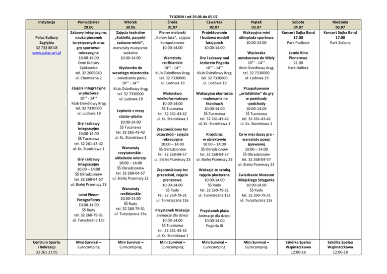 Instytucja Pałac Kultury Zagłębia 32 733 88 08 www.palac.art.pl Poniedziałek 29.06 Zabawy integracyjne, nauka piosenek turystycznych oraz gry sportoworekreacyjne 10:00-14:00 Dom Kultury Ząbkowice tel. 32 2605640 ul. Chemiczna 2 Zajęcia integracyjne w placówce 10°° - 14°° Klub Osiedlowy Krąg tel. 32 7330000 ul. Ludowa 19 Gry i zabawy integracyjne 10:00-14:00 ŚŚ Tucznawa tel. 32 261-43-42 ul. Ks. Stanisława 1 Gry i zabawy integracyjne 10:00 – 14:00 ŚŚ Okradzionów tel. 32 268-04-57 ul. Białej Przemszy 23 Letni Plener Fotograficzny 10.00-14.00 ŚŚ Rudy tel. 32 260-79-31 ul. Turystyczna 13a Centrum Sportu i Rekreacji 32 261 21 05 Mini Survival – Eurocamping Wtorek 30.06 Zajęcia teatralne „Kukiełki, pacynkiradosne minki”, warsztaty muzycznowokalne 10.00-14.00 Wycieczka do wesołego miasteczka – zwiedzanie parku 10°° - 14°° Klub Osiedlowy Krąg tel. 32 7330000 ul. Ludowa 19 Lepienie z masy ciasto–plasto 10:00-14:00 ŚŚ Tucznawa tel. 32 261-43-42 ul. Ks. Stanisława 1 Warsztaty recytatorskie układanie wierszy 10:00 – 14:00 ŚŚ Okradzionów tel. 32 268-04-57 ul. Białej Przemszy 23 Warsztaty rzeźbiarskie 10.00-14.00 ŚŚ Rudy tel. 32 260-79-31 ul. Turystyczna 13a Mini Survival – Eurocamping TYDZIEN I od 29.06 do 05.07 Środa Czwartek 01.07 02.07 Plener malarski Projektowanie „Kolory lata”, zajęcia i budowa modeli komputerowe latających 10.00-14.00 10.00-14.00 Warsztaty rzeźbiarskie 10°° - 14°° Klub Osiedlowy Krąg tel. 32 7330000 ul. Ludowa 19 Gry i zabawy nad Jeziorem Pogoria 10°° - 14°° Klub Osiedlowy Krąg tel. 32 7330000 ul. Ludowa 19 Malarstwo wielkoformatowe 10:00-14:00 ŚŚ Tucznawa tel. 32 261-43-42 ul. Ks. Stanisława 1 Wakacyjna eko-torba - malowanie na tkaninach 10:00-14:00 ŚŚ Tucznawa tel. 32 261-43-42 ul. Ks. Stanisława 1 Zręcznościowy tor przeszkód - zajęcia rekreacyjne 10:00 – 14:00 ŚŚ Okradzionów tel. 32 268-04-57 ul. Białej Przemszy 23 Krajobraz w obiektywie 10:00 – 14:00 ŚŚ Okradzionów tel. 32 268-04-57 ul. Białej Przemszy 23 Zręcznościowy tor przeszkód, zajęcia plenerowe 10.00-14.00 ŚŚ Rudy tel. 32 260-79-31 ul. Turystyczna 13a Wakacje ze sztuką zajęcia plastyczne 10.00-14.00 ŚŚ Rudy tel. 32 260-79-31 ul. Turystyczna 13a Przystanek Wakacje animacje dla dzieci 10.00-14.00 ŚŚ Tucznawa tel. 32 261-43-42 ul. Ks. Stanisława 1 Przystanek plaża Animacje dla dzieci 10.00-14.00 Pogoria III Mini Survival – Eurocamping Mini Survival – Eurocamping Piątek 03.07 Wakacyjna mini olimpiada sportowa 10.00-14.00 Sobota 04.07 Koncert Sojka Band 17.00 Park Podlesie Wycieczka autokarowa do Wisły 10°° - 14°° Klub Osiedlowy Krąg tel. 32 7330000 ul. Ludowa 19 Letnie Kino Plenerowe 21.00 Park Hallera Niedziela 05.07 Koncert Sojka Band 17.00 Park Zielona Przygotowanie „artefaktów” do gry w podchody -podchody 10:00-14:00 ŚŚ Tucznawa tel. 32 261-43-42 ul. Ks. Stanisława 1 Co w mej duszy gra warsztaty poezji śpiewanej 10:00 – 14:00 ŚŚ Okradzionów tel. 32 268-04-57 ul. Białej Przemszy 23 Zwiedzanie Muzeum Miejskiego Sztygarka 10.00-14.00 ŚŚ Rudy tel. 32 260-79-31 ul. Turystyczna 13a Mini Survival – Eurocamping Szkółka Speleo Wspinaczkowa 12:00-18 Szkółka Speleo Wspinaczkowa 12:00-18 www.csir.pl Aquapark NemoWodny Świat 32 639 05 79 www.nemowodnyswiat.pl Aqua Park Nemo 9:00-16:00 kl. IVwzwyż 9:00-21:00 przedszkola i kl. I-III Aqua Park Nemo 9:00-16:00 kl. IVwzwyż 9:00-21:00 przedszkola i kl. I-III Aqua Park Nemo 9:00-16:00 kl. IVwzwyż 9:00-21:00 przedszkola i kl. I-III Aqua Park Nemo 9:00-16:00 kl. IVwzwyż 9:00-21:00 przedszkola i kl. I-III Aqua Park Nemo 9:00-16:00 kl. IVwzwyż 9:00-21:00 przedszkola i kl. I-III Szkółka Speleo Wspinaczkowa 12:00-18 CSLiW w Parku Zielona Szkółka Speleo Wspinaczkowa 12:00-18 CSLiW w Parku Zielona Akademia Samurajów i Rycerzy 10:00-13:00 Hala WidowiskowoSportowa ,,Centrum” Szkółka Speleo Wspinaczkowa 12:00-18 CSLiW w Parku Zielona Szkółka Speleo Wspinaczkowa 12:00-18 CSLiW w Parku Zielona Akademia Samurajów i Rycerzy 10:00-13:00 Hala WidowiskowoSportowa ,,Centrum” Akademia Samurajów i Rycerzy 10:00-13:00 Hala WidowiskowoSportowa ,,Centrum” Akademia Samurajów i Rycerzy 10:00-13:00 Hala WidowiskowoSportowa ,,Centrum” Akademia Samurajów i Rycerzy 10:00-13:00 Hala WidowiskowoSportowa ,,Centrum” Nurkowanie dla młodzieży i dorosłych WOPR 12:00-14:00 Pogoria III Otwarte Treningi Piłki Nożnej z Akademią Silent 17:00-18:00 (2006 i młodsi) 18:00-19:00 (20032005) Stadion przy ul. Konopnickiej 29 Miejska Biblioteka Publiczna 32 639 03 01 www.biblioteka-dg.pl Odkrywamy fascynujące książki, godz. 12.00-14.00 Biblioteka Główna ul. T. Kościuszki 25 Odkrywamy bibliotekę godz. 11.00-13.00 Filia MBP Najsławniejsi odkrywcy i ich niezwykłe wynalazki, godz. 12.00-14.00, Biblioteka Główna ul. T. Kościuszki 25 Klub Młodych Odkrywców – omówienie Extreme City luźna jazda (chill, zabawy, jamy) deskorolka, bmx, rolki, hulajnoga godz. 11.00 – 14.00 Skatepark Park Zielona Dzieci świata i ich zwyczaje godz. 12.00-14.00 Biblioteka Główna ul. T. Kościuszki 25 Cuda przyrody godz. 12.00 Filia 2 MBP ul. Chemiczna 2 Odkrywamy gry i zabawy z czasów naszych dziadków, godz. 16.00-17.30 Biblioteka Główna ul. T. Kościuszki 25 Świat w zasięgu ręki. Poznajemy kulę ziemską Otwarte Treningi Piłki Nożnej z Akademią Silent 17:00-18:00 (2006 i młodsi) 18:00-19:00 (20032005) Stadion przy ul. Konopnickiej 29 Coś z niczego nasze plastyczne wynalazki godz. 12.00-14.00 Biblioteka Główna ul. T. Kościuszki 25 Dąbrowskie legendy – zajęcia literackoplastyczne godz. 11.00-13.00 CSLiW w Parku Zielona CSLiW w Parku Zielona Extreme City zawody CHROM skate Jam Skatepark Zielona Skatepark Park Zielona Crossfit i Fitness z Klubem Sparta Pogoria III Wspólne treningi biegowe ze Stowarzyszeniem Pogoria Biega Molo Pogoria III Godz. 9.00 Al. J. Piłsudskiego 32 Naukowe poniedziałki – przez zabawę do nauki „Lato młodych odkrywców co 