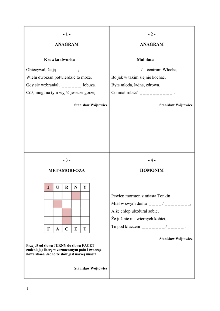 -1- -2- ANAGRAM ANAGRAM Krewka dworka Małolata Obiecywał, Ŝe ją _ _ _ _ _ _ , _ _ _ _ _ _ _ _ _ / _ centrum Włocha, Wielu dworzan potwierdzić to moŜe. Bo jak w takim się nie kochać. Gdy się wzbraniał, _ _ _ _ _ _ łobuza. Była młoda, ładna, zdrowa. CóŜ, mógł na tym wyjść jeszcze gorzej. Co miał robić? _ _ _ _ _ _ _ _ _ _ . Stanisław Wójtowicz Stanisław Wójtowicz -3- -4- METAMORFOZA HOMONIM J U R N Y Pewien mormon z miasta Tonkin Miał w swym domu _ _ _ _ / _ _ _ _ _ _ _ _, A Ŝe chłop ubzdurał sobie, śe juŜ nie ma wiernych kobiet, F A C E T To pod kluczem _ _ _ _ _ _ _ / _ _ _ _ _ . Stanisław Wójtowicz Przejdź od słowa JURNY do słowa FACET zmieniając literę w zaznaczonym polu i tworząc nowe słowo. Jedno ze słów jest nazwą miasta. Stanisław Wójtowicz 1 -5- -6- LOGOGRYF ANAGRAM Napisała _ _ _ _ _ _ _ _ _ _ _ _ _ , Szmatławiec, co się zowie, śe dzięcioł _ _ _ _ _ / _ / _ _ _ / _ _ _ _ Wszystkie drzewa w dąbrowie. Stanisław Wójtowicz W rzędach odczytaj trzywyrazowe rozwiązanie. - częsty po sylwestrze - Edgar Allan, pisarz - hiszpański producent samochodów cięŜarowych i wojskowych Stanisław Wójtowicz -7- -8- ZMIEŃ LITERĘ SKRÓTKA Powiedz, czy cię to _ _ _ _ _ _ _ _ , Jeśli ściągnę _ _ _ _ _ _ _ / _ _ ? Zmień w kaŜdym odgadniętym wyrazie jedna literę tak, aby moŜna było odczytać dwuwyrazowe sportowe rozwiązanie. - ceremonia przed weselem, - domniemany pseudonim agenta Oleksego, - hutniczy z Ŝarem, - Ŝerdź, Stanisław Wójtowicz 2 Stanisław Wójtowicz -9- - 10 - LOGOKOMBINATKA KALAMBUR WIĄZANY S Opychają się wybrani Z Ł W panu i pani. W Stanisław Wójtowicz Uzupełnij diagram tak, aby w rzędach powstały 5literowe wyrazy, a w białych polach moŜna było odczytać imię i nazwisko brytyjskiego aktora. Stanisław Wójtowicz - 11 - +1 - 12 - JOLKA-SZYFR UZUPEŁNIANKA 7 5 8 9 11 4 10 6 12 3 1 2 Rozwiązaniem jolki jest nazwisko dwukrotnego mistrza świata. Dodatkowy punkt za podanie w jakiej dyscyplinie. - roślina na olej, - burgundy, - w dawnej Polsce, termin posiedzeń sądu, - „łamistrajk” w latach 80-tych. 6 5 2 3 8 4 7 10 1 9 Wpisz kolejne litery wyrazu o objaśnieniu: „wytwórnia spoiwa murarskiego” do kratek z liczbami, a następnie uzupełnij niebieskie kratki tak, aby powstały czteroliterowe wyrazy, a dopisane litery czytane rzędami utworzyły rozwiązanie: nazwę zabawki. Stanisław Wójtowicz Stanisław Wójtowicz 3 - 13 - - 14 - HOMONIM B O R G A S I A D O R A S U N D Niejedno nowe _ _ _ _ _ powstało na wsi w _ _ _ _ _ . Ewa Jowik Zmień w kaŜdym wyrazie jedna literę tak, aby moŜna było odczytać dwuwyrazowe sportowe rozwiązanie. Stanisław Wójtowicz - 15 - - 16 - HOMONIM ANAGRAM Nie ma to jak grube ryby O dwóch takiCH z oazy Przytulił się dorsz do szprotki Wsiadł jeden z drugim spragniony _ _ _ _ _ _ _ _ , ____/ __/______ a Ŝe chuda była, biedak I udają, Ŝe to karawana. przez skórę _ _ _ _ / _ _ _ _ . Ewa Jowik 4 Stanisław Wójtowicz - 17 - - 18 - ANAGRAM ANAGRAM Jacek i Placek Egzotyczna ćwikła? Szukają słońca Jacek i Placek Tak to natura wymyśliła _ _ _ / _ _ / _ _ w studni ni w starej pace, i nie chce być inaczej: Ani pod kołdrą, ani na klonie …. nie wyrośnie na wierzbie cytryna Co za _ _ _ _ _ _ _ ! i na _ _ _ _ _ _ _ _ /_ _ _ _ _ _ _ _ . Stanisław Wójtowicz Magdalena Wójtowicz - 19 - - 20 - ANAGRAM PSOTKA 1 2 3 Jurna świnka 4 Na _ _ _ _ _ _ _ _ / _ _ _ _ _ / _ _ _ , Gdy ją swędzi pod pachwiną. Zmień kolejność liter w jednym z wyrazów określenia i odczytaj właściwą definicję wpisywanego do diagramu wyrazu. 5 Marek Polkowski POZIOMO: 1) pracownik polanki. 4) wyniosłość ratownika. 5) bałkańska arnika. PIONOWO: 1) odgłos przelewania. 2) honorowa dilerka. 3) gruba Pierrota. Stanisław Wójtowicz 5 - 21 - - 22- KRZYśÓWKA HOMONIM 1 2 3 Miastowa turystka W gryczane _ _ _ _ / _ _ _ _ _ gołe wyszła opalać za stodołę. 4 Pół wsi płci męskiej _ _ _ _ _ _ _ _ _ i dziwowisko oglądało. 5 Ewa Jowik Poziomo: 2) głowonóg o ciele w kształcie 4, 4) pocisk w kształcie 5, 5) 2 raczej go nie wypali. Pionowo: 1) gitara Murzynów amerykańskich, 2) groch – strąki, ziarno - ? , 3) szkiełko powiększające. Magdalena Wójtowicz - 23 - - 24 - REBUS HOMONIMOWY SAMOSIA Z OGREM Uzupełnij diagram wyrazami tak, aby w kolorowych polach znalazły się następujące zlepki liter: OGR, ORG, ROG, RGO, GRO, GOR. Stanisław Wójtowicz Magdalena i Zuzanna Wójtowicz 6 - 25 - - 26 - ANAGRAM ANAGRAM SMS Z PUSTYNI Na Podhalu nowe trendy, Bo na stołach _ _ _ _ _ _ _ / _ / _ _ _ _ _ _ Lub oscypki, whisky z lodem. „Jeśli tylko _ _ _ _ _ _ mnie nie zawiedzie, Wszystko na zachodnią modę? Wpadnę do oazy _ / _ _ _ _ _ odwiedzę.” Marek Polkowski Marek Polkowski - 27 - - 28 - REBUS HOMONIMOWY KALAMBUR Mandat i łamanie kołem Amerykańskim sokołem. Marek Polkowski Rozwiązanie rebusu (K.M.A.) jest określeniem wyrazu będącego rozwiązaniem zadania. Magdalena Wójtowicz 7 - 29 - - 30 - SAMOSIA REBUS KOŁOWY G T R * R B K E N Uzupełnij w diagramie wyrazy tak, aby od pola z gwiazdką moŜna było odczytać prawoskrętnie 8literowy wyraz. Stanisław Wójtowicz Początkowe litery wyrazów: C. Ź. Stanisław i Wojciech Wójtowicz - 31 - - 32 - HOMONIM ANAGRAM Dostał kosza Intelekt Emocji wiele _ _ _ _ _ _ _ Jestem oburzona! w męŜczyznach pierś kobieca To _ _ _ _ _ niesłychana! i _ _ _ _ _ _ _ walka kobiet, Muszę _ _ _ _ / _ przykrością, Ŝe waŜne to, co w głowie. nie wyjdę za pana! Ewa Jowik Ewa Jowik 8 - 33 - - 34 - ANAGRAM ANAGRAM Kocia rada Na Orinoko Jeśli widzisz, Ŝe dwie kapibary _ _ _ / _ _ _ / _ _ _ _ _ _ dziabnie kajak, Dorwie nas piranii zgraja. W środku dŜungli się biorą za bary, Nie czekaj, aŜ krew się pokaŜe. ________/________! Stanisław Wójtowicz Magdalena Wójtowicz - 35 – - 36 – ANAGRAM ANAGRAM W parku jurajskim Dziwili się straŜnicy I specjalistów grono, Dlaczego _ _ _ _ _ _ _ _ _ _ _ WciąŜ łapy _ _ _ _ _ 