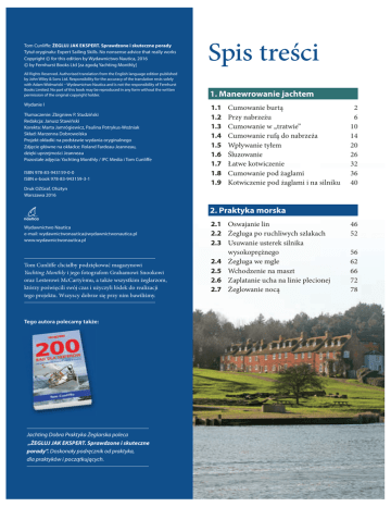 Tom Cunliffe: ŻEGLUJ JAK EKSPERT. Sprawdzone i skuteczne porady Tytuł oryginału: Expert Sailing Skills. No nonsense advice that really works Copyright © for this edition by Wydawnictwo Nautica, 2016 © by Fernhurst Books Ltd [za zgodą Yachting Monthly] All Rights Reserved. Authorised translation from the English language edition published by John Wiley & Sons Ltd. Responsibility for the accuracy of the translation rests solely with Adam Widmański – Wydawnictwo Nautica and is not the responsibility of Fernhurst Books Limited. No part of this book may be reproduced in any form without the written permission of the original copyright holder. Wydanie I Tłumaczenie: Zbigniew P. Studziński Redakcja: Janusz Stawiński Korekta: Marta Jamrógiewicz, Paulina Potrykus-Woźniak Skład: Marzenna Dobrowolska Projekt okładki na podstawie wydania oryginalnego Zdjęcie główne na okładce: Roland Fardeau-Jeanneau, dzięki uprzejmości Jeanneau Pozostałe zdjęcia: Yachting Monthly / IPC Media i Tom Cunliffe ISBN 978-83-943159-0-0 ISBN e-book 978-83-943159-3-1 Druk OZGraf, Olsztyn Warszawa 2016 Spis treści 1. Manewrowanie jachtem 1.1 1.2 1.3 1.4 1.5 1.6 1.7 1.8 1.9 Cumowanie burtą Przy nabrzeżu Cumowanie w „tratwie” Cumowanie rufą do nabrzeża Wpływanie tyłem Śluzowanie Łatwe kotwiczenie Cumowanie pod żaglami Kotwiczenie pod żaglami i na silniku 2 6 10 14 20 26 32 36 40 2. Praktyka morska Wydawnictwo Nautica e-mail: [email protected] www.wydawnictwonautica.pl Tom Cunliffe chciałby podziękować magazynowi Yachting Monthly i jego fotografom Grahamowi Snookowi oraz Lesterowi McCarty’emu, a także wszystkim żeglarzom, którzy poświęcili swój czas i użyczyli łódek do realizacji tego projektu. Wszyscy dobrze się przy nim bawiliśmy. Tego autora polecamy także: Jachting Dobra Praktyka Żeglarska poleca „ŻEGLUJ JAK EKSPERT. Sprawdzone i skuteczne porady”. Doskonały podręcznik od praktyka, dla praktyków i początkujących. iv 2.1 Oswajanie lin 2.2 Żegluga po ruchliwych szlakach 2.3 Usuwanie usterek silnika wysokoprężnego 2.4 Żegluga we mgle 2.5 Wchodzenie na maszt 2.6 Zaplatanie ucha na linie plecionej 2.7 Żeglowanie nocą 46 52 56 62 66 72 78 3. Nawigacja 3.1 Krzywe pływów 3.2 Jak pozostać bezpiecznym używając radaru 3.3 Dewiacja kompasu 3.4 Radar i AIS 5. Dowodzenie 82 88 94 98 4. Żeglowanie i trymowanie żagli 4.1 4.2 4.3 4.4 4.5 4.6 Trymowanie żagli Zwroty przez sztag i przez rufę Żeglowanie po rzece Obsługa spinakera Genakery Redukowanie nawietrzności 5.1 5.2 5.3 5.4 Szkolenie załogi Żeglowanie z dziećmi Żeglowanie we dwoje Zadowolenie załogi 128 132 136 140 6. Nagłe wypadki 102 106 112 116 120 124 6.1 6.2 6.3 6.4 6.5 6.6 Wejście na mieliznę Uwalnianie oplątanej śruby napędowej Przyjmowanie holu Człowiek za burtą! Podejmowanie człowieka na pokład Ratownictwo lotnicze 144 150 156 162 168 174 1