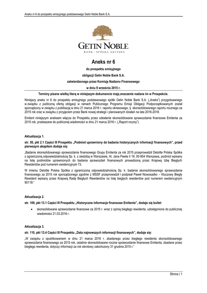 Aneks nr 6 do prospektu emisyjnego podstawowego Getin Noble Bank S.A. Aneks nr 6 do prospektu emisyjnego obligacji Getin Noble Bank S.A. zatwierdzonego przez Komisję Nadzoru Finansowego w dniu 9 września 2015 r. Terminy pisane wielką literą w niniejszym dokumencie mają znaczenie nadane im w Prospekcie. Niniejszy aneks nr 6 do prospektu emisyjnego podstawowego spółki Getin Noble Bank S.A. („Aneks”) przygotowanego w związku z publiczną ofertą obligacji w ramach Publicznego Programu Emisji Obligacji Podporządkowanych został sporządzony w związku z publikacją w dniu 21 marca 2016 r. raportu okresowego, tj. skonsolidowanego raportu rocznego za 2015 rok oraz w związku z przyjęciem przez Bank nowej strategii i planowanych działań na lata 2016-2018. Emitent niniejszym aneksem włącza do Prospektu przez odesłanie skonsolidowane sprawozdanie finansowe Emitenta za 2015 rok, przekazane do publicznej wiadomości w dniu 21 marca 2016 r. („Raport roczny”). Aktualizacja 1. str. 50, pkt 2.1 Części III Prospektu „Podmiot uprawniony do badania historycznych informacji finansowych”, przed pierwszym akapitem dodaje się: „Badanie skonsolidowanego sprawozdania finansowego Grupy Emitenta za rok 2015 przeprowadził Deloitte Polska Spółka z ograniczoną odpowiedzialnością Sp. k. z siedzibą w Warszawie, Al. Jana Pawła II 19, 00-854 Warszawa, podmiot wpisany na listę podmiotów uprawnionych do badania sprawozdań finansowych prowadzoną przez Krajową Izbę Biegłych Rewidentów pod numerem ewidencyjnym 73. W imieniu Deloitte Polska Spółka z ograniczoną odpowiedzialnością Sp. k. badanie skonsolidowanego sprawozdania finansowego za 2015 rok sporządzonego zgodnie z MSSF przeprowadził i podpisał Paweł Nowosadko – Kluczowy Biegły Rewident wpisany przez Krajową Radę Biegłych Rewidentów na listę biegłych rewidentów pod numerem ewidencyjnym 90119.” Aktualizacja 2. str. 109, pkt 13.1 Części III Prospektu „Historyczne informacje finansowe Emitenta”, dodaje się bullet: skonsolidowane sprawozdanie finansowe za 2015 r. wraz z opinią biegłego rewidenta, udostępnione do publicznej wiadomości 21.03.2016 r. Aktualizacja 3. str. 110, pkt 13.4 Części III Prospektu „Data najnowszych informacji finansowych”, dodaje się: „W związku z opublikowaniem w dniu 21 marca 2016 r. zbadanego przez biegłego rewidenta skonsolidowanego sprawozdania finansowego za 2015 rok, ostatnie skonsolidowane roczne sprawozdanie finansowe Emitenta, zbadane przez biegłego rewidenta, dotyczy informacji za rok obrotowy zakończony 31 grudnia 2015 r.” Strona | 1 Aneks nr 6 do prospektu emisyjnego podstawowego Getin Noble Bank S.A. Aktualizacja 4. str. 112, pkt 13.7 Części III Prospektu „Znaczące zmiany w sytuacji finansowej lub handlowej Emitenta”, dodaje się: „(vi) Czynniki istotne dla wyników Grupy W 2015 roku Grupa Kapitałowa Getin Noble Bank S.A. wypracowała skonsolidowany zysk netto w kwocie 54,3 mln zł. Największą kontrybucję do wyniku Grupy spośród spółek zależnych miał Noble Funds TFI S.A., który osiągnął zysk netto na poziomie 17,5 mln zł oraz Noble Securities S.A. z wynikiem 12,6 mln zł zysku netto. W skonsolidowanym zysku netto ujęto również 32,4 mln zł zysku netto wypracowanego przez Spółki Grupy Getin Leasing S.A. w I kwartale 2015 roku, czyli do momentu rozliczenia utraty samodzielnej kontroli w spółce zależnej Getin Leasing S.A. Począwszy od II kwartału 2015 roku w skonsolidowanym rachunku zysków i strat Grupy Kapitałowej Getin Noble Banku S.A. ujmowany jest procentowy udział w zysku wspólnego przedsięwzięcia – Grupy Getin Leasing S.A., który za trzy kwartały 2015 roku wyniósł 22,3 mln zł. Z tytułu posiadanej inwestycji w jednostce stowarzyszonej w wyniku skonsolidowanym ujęto 12,2 mln zł udziału w zysku Grupy Kapitałowej Open Finance S.A. W 2015 roku Grupa odnotowała spadek wyniku odsetkowego w stosunku do 2014 roku o 16,4%, przy czym: przychody z tytułu odsetek zmniejszyły się o 16,4% - głównym składnikiem przychodów odsetkowych są przychody z działalności kredytowej (81,9% przychodów odsetkowych Grupy), które w 2015 roku uległy obniżeniu o 14,2%, koszty z tytułu odsetek obniżyły się o 16,3% - głównym składnikiem kosztów odsetkowych są koszty z działalności depozytowej (odsetki od zobowiązań wobec klientów stanowiły 86,7% kosztów z tytułu odsetek Grupy), które w 2015 roku uległy obniżeniu o 10,8%. Bank sukcesywnie zwiększa udział w portfelu kredytowym kredytów krótkoterminowych, co wpływa na obserwowany od kilku lat spadek udziału w przychodach odsetek od długoterminowych kredytów hipotecznych – w 2015 roku odsetki od kredytów hipotecznych stanowiły 45% przychodów odsetkowych od kredytów i pożyczek udzielonych klientom, podczas gdy w 2014 roku 49,9%. Głównym czynnikiem zewnętrznym determinującym zmianę przychodów i kosztów odsetkowych są zmiany rynkowych stóp procentowych, wpływające bezpośrednio na poziom oprocentowania depozytów oraz kredytów klientowskich bazujących na stawkach rynkowych skorygowanych o marżę. Wynik z tytułu opłat i prowizji wyniósł w 2015 roku 326,8 mln zł i był o 110,2 mln zł (tj. o 25,2%) niższy niż rok wcześniej. Głównym elementem wyniku z prowizji była nie ujmowana w rachunku efektywnej stopy procentowej część przychodów ze sprzedaży ubezpieczeń (52,2% wyniku). Istotny udział stanowiły również prowizje z tytułu produktów inwestycyjnych i bankowych (19,8%) oraz prowizje z tytułu kredytów i pożyczek (10,3%). Osiągnięty w 2015 roku wynik na pozostałych pozycjach (przychody z tytułu dywidend, wynik na instrumentach finansowych wycenianych do wartości godziwej przez wynik finansowy oraz wynik z pozycji wymiany, wynik z tytułu utraty kontroli w jednostce zależnej, wynik na pozostałych instrumentach finansowych oraz wynik z tytułu pozostałych przychodów i kosztów operacyjnych) by