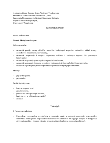 Agnieszka Giesa, Romina Szala, Wojciech Teodorowicz Studenckie Koło Naukowe Nauczycieli „Sowa” Pracownia Nowoczesnych Strategii Nauczania Biologii, Wydział Nauk Biologicznych, Uniwersytet Wrocławski KONSPEKT ZAJĘĆ szkoła podstawowa Temat: Biologiczne kasyno. Cele warsztatów: uczestnik podaje nazwy układów narządów budujących organizm człowieka: układ kostny, oddechowy, pokarmowy, krwionośny, uczestnik rozpoznaje i nazywa organizmy roślinne i zwierzęce typowe dla poznanych krajobrazów, uczestnik rozpoznaje poszczególne organella komórkowe, uczestnik rozpoznaje i nazywa organizmy należące do królestwa bakterii oraz grzybów, uczestnik zapoznaje się z budową układu odpornościowego i jego działaniem. Metody: gry dydaktyczne, pogadanka. Środki dydaktyczne: karty z grupami krwi gra planszowa, plansza do zoologicznego twistera, karty do gry w „Biologiczną mafię”, domino. Tok zajęć: I. Faza wprowadzająca Prowadzący wprowadza uczestników w tematykę zajęć, a następnie prezentuje poszczególne stanowiska oraz system nagradzania (uczniowie w zależności od zajętego miejsca w rozgrywce otrzymują punkty – zbierają zakrętki przedstawiające konkretne wartości punktowe). II. Faza realizacyjna Uczestnicy podchodzą do dowolnych stanowisk, gdzie muszą wykazać się różnorodną wiedzą oraz umiejętnościami. W zależności od zajętych miejsc w rozgrywce otrzymują punkty. Liczba uczestników Liczba prowadzących 2x2 2 2x2 1 Królestwa świata żywego to gra karciana na zasadach „Uno”. Zadaniem uczestników jest dopasowanie karty (do ostatnio wyrzuconej) kolorem karty lub według przynależności do danego królestwa świata żywego (zwierzęta, rośliny, grzyby, bakterie). Wygrywa osoba, która jako pierwsza dopasuje wszystkie karty. 4 1 Zoologiczny twister Twister to gra ruchowa, w której udział może wziąć standardowo od dwóch do czterech graczy. Do gry potrzebna jest mata. Każdy rząd posiada inne zwierzę. Każde zwierzę posiada sześć, kół więc jest 4 1 Gra dydaktyczna Domino Dwie wersje tematyczne: 1. Organy 2. Gady Opis gry Każdy z uczestników dostaje określoną ilość kart. Następnie uczestnik wykłada taką kartę, aby pasowała do pierwszej obrazkiem lub nazwą. W przypadku braku odpowiedniej karty uczestnik pobiera do swojej puli dodatkową kartę. Wygrywa osoba, która najszybciej dopasuje wszystkie swoje karty. Przewidziane są dwie wersje tematyczne: karty z organami ludzkimi oraz z gadami. Memory Dwie wersje tematyczne: 1. Organella komórkowe 2. Płazy Uczestnicy zabawy rozkładają zestaw kart. Karty zostają wymieszane. W zestawie znajdują się po dwie karty tego samego typu. Gracze mają za zadanie odsłaniać zawsze dwie takie same karty. Na kartach widnieją ilustracje różnych organelli komórkowych (oraz druga wersja: zdjęcia płazów). Gra jest pomocna przy realizacji kilku celów dydaktycznych, takich jak rozwijanie pamięci mechanicznej, doskonalenie umiejętności koncentracji uwagi. Królestwa świata żywego ich łącznie dwadzieścia cztery. Zadaniem graczy jest umieszczanie dłoni lub stopy na wskazanym miejscu na macie. Sędzia kręci strzałką i informuje graczy o kolejnych ruchach. Biologiczne kalambury Biologiczna Mafia Uczestnicy są podzieleni na dwie grupy. Członek jednej z drużyn przedstawia wylosowane hasło swoim kolegom. Czas odgadywania to 90 sekund. Dalej następuje zamiana drużyny i osoby przedstawiającej hasło. Wygrywa drużyna, która odgadnie najwięcej haseł. nieograniczona 1 Prowadzący, rozpoczyna grę krótką prelekcją dotyczącą powstawania komórek rakowych w organizmie człowieka i tego, jak organizm z nimi walczy. Po omówieniu tematu przedstawia zasady. Gra dzieli się na następujące po sobie dzień i noc. W nocy budzą się komórki rakowe, które chcą „wykończyć” komórki ciała, lecz one nie są bezsilne, bowiem jest komórka, która może ochronić jedną komórkę organizmu – komórka dendrytyczna, limfocyt T próbuje się dowiedzieć, kto pełni, jaką funkcję, a makrofagi starają się dojść, kto jest komórką rakową. Każdorazowo podczas jednej nocy komórka rakowa zabija jedną komórkę w organizmie. W dzień z kolei komórki ciała, w osłabionym już składzie, próbują na podstawie analizy mowy ciała, interpretacji i analizy zasłyszanych informacji ustalić, kto jest winien tych zbrodni. Ostatecznie po dyskusji organizm typują jedną komórkę, która zostaje zlikwidowana. Gra kończy się w momencie, kiedy komórki rakowe zostaną zidentyfikowane i wyeliminowane przez organizm lub gdy komórki rakowe zlikwidują pozostałe komórki ciała. od 10 1 Przyrodnicza gra planszowa Karty z grupami krwi Uczestnicy losują pytania, po czym na nie odpowiadają. Prawidłowa odpowiedź skutkuje uzyskaniem przywileju do rzutu kostką, a tym samym zmniejsza się odległość do mety. Następnie pytania losują kolejni zawodnicy. Zagadnienia w grze dotyczą właściwości substancji, krajobrazu Polski i Europy, organizmu człowieka, Ziemi we Wszechświecie, lądów i oceanów. 3 1 W grze uczestniczą dwie osoby (dawca i biorca). Prowadzący rozdaje wcześniej przygotowane karty uczestnikom gry (karty z grupami krwi). Uczestnicy nie widzą, jakie dostali karty, które zostają wykładane po kolei (nie ma wyboru, jaką kartę się wyłoży). Osoba rozpoczynająca jest biorcą. Po położeniu karty, druga osoba, która jest dawcą również kładzie kartę na stół. Jeżeli dawca wyłoży kartę, która ratuje biorcę to biorcą zabiera obie karty, w przeciwnym wypadku dawca zyskuję karty. Dochodzi dalej do zamiany ról. Gra kończy się w momencie, kiedy jedna z osób pozbędzie się wszystkich kart. 2 1 III. Faza podsumowująca Prowadzący wyłania uczestnika z największą liczbą punktów, po czym dziękuje za wspólną zabawę.