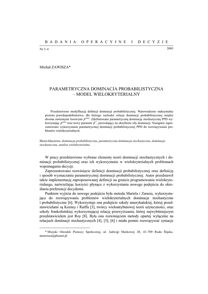 B A D A N I A O P E R A C Y J N E I D E C Y Z J E 2005 Nr 3–4 Michał ZAWISZA* PARAMETRYCZNA DOMINACJA PROBABILISTYCZNA – MODEL WIELOKRYTERIALNY Przedstawiono modyfikację definicji dominacji probabilistycznej. Wprowadzono maksymalny poziom prawdopodobieństwa, dla którego zachodzi relacja dominacji probabilistycznej między dwoma zmiennymi losowymi β max. Zdefiniowano parametryczną dominację stochastyczną PPD wykorzystując β max oraz nowy parametr β *, pozwalający na określenie siły dominacji. Następnie zaprezentowano wykorzystanie parametrycznej dominacji probabilistycznej PPD do rozwiązywania problemów wielokryterialnych. Słowa kluczowe: dominacja probabilistyczna, parametryczna dominacja stochastyczna, dominacja stochastyczna, analiza wielokryterialna W pracy przedstawiono wybrane elementy teorii dominacji stochastycznych i dominacji probabilistycznej oraz ich wykorzystanie w wielokryterialnych problemach wspomagania decyzji. Zaprezentowano rozwinięcie definicji dominacji probabilistycznej oraz definicję i sposób wyznaczania parametrycznej dominacji probabilistycznej. Autor przedstawił także implementację zaproponowanej definicji na gruncie programowania wielokryterialnego, naświetlając korzyści płynące z wykorzystania nowego podejścia do określania preferencji decydenta. Punktem wyjścia do nowego podejścia była metoda Martela i Zarasia, wykorzystująca do rozwiązywania problemów wielokryterialnych dominacje stochastyczne i probabilistyczne [6]. Wykorzystuje ona podejście szkoły amerykańskiej, której przedstawicielami są Keeney i Raiffa [3], twórcy wieloatrybutowej teorii użyteczności, oraz szkoły frankofońskiej wykorzystującej relację przewyższania, której najwybitniejszym przedstawicielem jest Roy [8]. Była ona rozwinięciem metody opartej wyłącznie na relacjach dominacji stochastycznych [4], [5], [6] i miała pomóc rozwiązywać sytuacje * Miejski Ośrodek Pomocy Społecznej, ul. Jadwigi Markowej 20, 41-709 Ruda Śląska. [email protected] 130 M. ZAWISZA decyzyjne, których nie rozstrzygają relacje dominacji stochastycznych. Relacje te mają zastosowanie tylko dla pewnych klas funkcji użyteczności i nie zawsze mogą być wykorzystane do określania preferencji decydenta. Niestety metoda wykorzystująca dominacje stochastyczne i probabilistyczne nadal pozostawiała wiele niewyjaśnionych relacji na etapie budowania globalnej relacji preferencji pomiędzy wszystkimi parami wariantów w problemie wielokryterialnym. W modelach wielokryterialnych, gdzie kryteria są przeciwstawne, ta sytuacja zdarza się bardzo często. Wykorzystanie zaproponowanej w opracowaniu metody, wykorzystującej parametryczną dominację probabilistyczną pozwala w wielu takich przypadkach na zbudowanie dokładniejszej globalnej relacji preferencji przez określenie większej liczby globalnych relacji częściowych pomiędzy poszczególnymi wariantami. Pierwsza część opracowania jest poświęcona dominacji stochastycznej. W drugiej przedstawiono modyfikację definicji dominacji probabilistycznej – parametryczną dominację probabilistyczną. W trzeciej części autor omówił wykorzystanie nowej definicji w wielokryterialnym wspomaganiu decyzji, prezentując na przykładach zmodyfikowaną metodę analizy wielokryterialnej. 1. Dominacje stochastyczne Dominację stochastyczną pierwszego stopnia FSD (First Stochastic Dominance) zdefiniowali J. P. Quirk i R. Saposnik w swojej pracy Admissibility and Measurable Utility Functions [7] w 1962 r. W 1969 roku J. Hadar i W.R. Russel przedstawili dominację stochastyczną drugiego stopnia SSD (Second Stochastic Dominance) [2]. W 1970 roku G.A. Whitemore zaproponował dominację stochastyczną trzeciego stopnia TSD (Third Stochastic Dominance) [10]. Niech zmienna losowa X będzie określona na przedziale [a, b] i ma dystrybuantę Fi oraz zmienna losowa Y będzie określona na przedziale [a, b] i ma dystrybuantę Fj, wówczas zmienna losowa X dominuje zmienną losową Y i jest to dominacja stochastyczna stopnia pierwszego, gdy spełnione są następujące warunki [7]: H1 ( x) = Fi ( x) − F j ( x) ≤ 0 dla każdego x ∈ [a, b] i Fi ≠ Fj, (1) co zapisujemy jako X FSD Y. Zmienna losowa X dominuje zmienną losową Y i jest to dominacja stochastyczna stopnia drugiego, gdy spełnione są następujące warunki [2]: x ∫ H 2 ( x) = H1 ( y )dy ≤ 0 dla każdego x ∈ [a, b] i Fi ≠ Fj, a co zapisujemy jako X SSD Y. (2) Parametryczna dominacja probabilistyczna ... 131 Zmienna losowa X dominuje zmienną losową Y i jest to dominacja stochastyczna stopnia trzeciego, gdy spełnione są następujące warunki [10]: x ∫ H 3 ( x) = H 2 ( y )dy ≤ 0 dla każdego x ∈ [a, b] i Fi ≠ Fj, (3) a oraz E(X) ≥ E(Y ), (4) co zapisujemy jako X TSD Y. Zdefiniowane dominacje stochastyczne są wykorzystywane do opisu zachowań decydenta, który ma awersję do ryzyka, charakteryzującego się wklęsłą funkcją użyteczności typu DARA. Powyższe dominacje dają nam pewną informację o preferencjach takiego decydenta. Jeżeli zachodzi FSD, SSD lub TSD, to możemy stwierdzić, że dla decydenta X jest przynajmniej tak dobra jak Y. Mówimy wtedy, że zachodzi jawna dominacja stochastyczna. Odwrotne dominacje stochastyczne SISD (Second Inversed Stochastic Dominance) oraz TISD1 (Third Inversed Stochastic Dominance 1) zostały zaproponowane przez M. J. Goovaertsa [1] w 1984 r., chociaż określenie „odwrotna”, dla tego szczególnego rodzaju dominacji, zaproponował po raz pierwszy, wraz z dominacją TISD2 (Third Inversed Stochastic Dominance 2) K. Zaraś dopiero w 1989 roku [12]. Niech zmienna losowa X będzie określona na przedziale [a, b] i ma dystrybuantę Fi oraz zmienna losowa Y będzie określona na przedziale [a, b] i ma dystrybuantę Fj. Wówczas zmienna losowa X dominuje zmienną losową Y i jest to odwrotna dominacja stochastyczna stopnia drugiego, gdy spełnione są następujące warunki [1]: a ∫ H 2 ( x) = H1 (