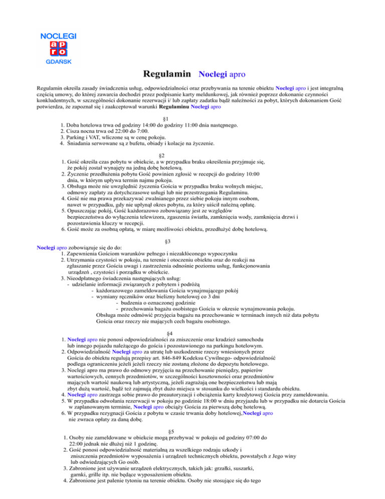 Regulamin Noclegi apro Regulamin określa zasady świadczenia usług, odpowiedzialności oraz przebywania na terenie obiektu Noclegi apro i jest integralną częścią umowy, do której zawarcia dochodzi przez podpisanie karty meldunkowej, jak również poprzez dokonanie czynności konkludentnych, w szczególności dokonanie rezerwacji i/ lub zapłaty zadatku bądź należności za pobyt, których dokonaniem Gość potwierdza, że zapoznał się i zaakceptował warunki Regulaminu Noclegi apro §1 1. Doba hotelowa trwa od godziny 14:00 do godziny 11:00 dnia następnego. 2. Cisza nocna trwa od 22:00 do 7:00. 3. Parking i VAT, wliczone są w cenę pokoju. 4. Śniadania serwowane są z bufetu, obiady i kolacje na życzenie. §2 1. Gość określa czas pobytu w obiekcie, a w przypadku braku określenia przyjmuje się, że pokój został wynajęty na jedną dobę hotelową. 2. Życzenie przedłużenia pobytu Gość powinien zgłosić w recepcji do godziny 10:00 dnia, w którym upływa termin najmu pokoju. 3. Obsługa może nie uwzględnić życzenia Gościa w przypadku braku wolnych miejsc, odmowy zapłaty za dotychczasowe usługi lub nie przestrzegania Regulaminu. 4. Gość nie ma prawa przekazywać zwalnianego przez siebie pokoju innym osobom, nawet w przypadku, gdy nie upłynął okres pobytu, za który uiścił należną opłatę. 5. Opuszczając pokój, Gość każdorazowo zobowiązany jest ze względów bezpieczeństwa do wyłączenia telewizora, zgaszenia światła, zamknięcia wody, zamknięcia drzwi i pozostawienia kluczy w recepcji. 6. Gość może za osobną opłatą, w miarę możliwości obiektu, przedłużyć dobę hotelową. §3 Noclegi apro zobowiązuje się do do: 1. Zapewnienia Gościom warunków pełnego i niezakłóconego wypoczynku 2. Utrzymania czystości w pokoju, na terenie i otoczeniu obiektu oraz do reakcji na zgłaszanie przez Gościa uwagi i zastrzeżenia odnośnie poziomu usług, funkcjonowania urządzeń , czystości i porządku w obiekcie. 3. Nieodpłatnego świadczenia następujących usług: - udzielanie informacji związanych z pobytem i podróżą - każdorazowego zameldowania Gościa wynajmującego pokój - wymiany ręczników oraz bielizny hotelowej co 3 dni - budzenia o oznaczonej godzinie - przechowania bagażu osobistego Gościa w okresie wynajmowania pokoju. Obsługa może odmówić przyjęcia bagażu na przechowanie w terminach innych niż data pobytu Gościa oraz rzeczy nie mających cech bagażu osobistego. §4 1. Noclegi apro nie ponosi odpowiedzialności za zniszczenie oraz kradzież samochodu lub innego pojazdu należącego do gościa i pozostawionego na parkingu hotelowym. 2. Odpowiedzialność Noclegi apro za utratę lub uszkodzenie rzeczy wniesionych przez Gościa do obiektu regulują przepisy art. 846-849 Kodeksu Cywilnego- odpowiedzialność podlega ograniczeniu jeżeli jeżeli rzeczy nie zostaną złożone do depozytu hotelowego. 3. Noclegi apro ma prawo do odmowy przyjęcia na przechowanie pieniędzy, papierów wartościowych, cennych przedmiotów, w szczególności kosztowności oraz przedmiotów mających wartość naukową lub artystyczną, jeżeli zagrażają one bezpieczeństwu lub mają zbyt dużą wartość, bądź też zajmują zbyt dużo miejsca w stosunku do wielkości i standardu obiektu. 4. Noclegi apro zastrzega sobie prawo do preautoryzacji i obciążenia karty kredytowej Gościa przy zameldowaniu. 5. W przypadku odwołania rezerwacji w pokoju po godzinie 18:00 w dniu przyjazdu lub w przypadku nie dotarcia Gościa w zaplanowanym terminie, Noclegi apro obciąży Gościa za pierwszą dobę hotelową. 6. W przypadku rezygnacji Gościa z pobytu w czasie trwania doby hotelowej,Noclegi apro nie zwraca opłaty za daną dobę. §5 1. Osoby nie zameldowane w obiekcie mogą przebywać w pokoju od godziny 07:00 do 22:00 jednak nie dłużej niż 1 godzinę. 2. Gość ponosi odpowiedzialność materialną za wszelkiego rodzaju szkody i zniszczenia przedmiotów wyposażenia i urządzeń technicznych obiektu, powstałych z Jego winy lub odwiedzających Go osób. 3. Zabronione jest używanie urządzeń elektrycznych, takich jak: grzałki, suszarki, garnki, grille itp. nie będące wyposażeniem obiektu. 4. Zabronione jest palenie tytoniu na terenie obiektu. Osoby nie stosujące się do tego zarządzenia będą obciążone kosztami doprowadzenia pomieszczeń do stanu poprzedniego oraz kosztami interwencji Straży Pożarnej, jednak kwotą nie mniejszą niż 200 PLN. 5. Przedmioty osobistego użytku pozostawione przez wyjeżdżającego gościa w pokoju będą odesłane na wskazany przez Gościa adres na Jego koszt. W przypadku nie otrzymania takiej dyspozycji Noclegi apro przechowa je przez 3 miesiące 6. Noclegi apro może odmówić świadczenia usług osobie, która narusza lub wcześniej naruszyła Regulaminu. 7. Gość nie może, bez zgody pracowników obiektu, przenosić wyposażenia pokoju. 8. Na terenie Noclegi apro dzieci nie mogą pozostawać bez opieki dorosłych. 9. Wprowadzenie zwierząt na teren obiektu, może odbywać się tylko za zgodą kierownictwa obiektu. §6 1. Noclegi apro świadczy usługi zgodnie ze swoim standardem. W przypadku zastrzeżeń dotyczących jakości usług, Gość jest proszony o niezwłoczne zgłaszanie ich w recepcji. 2. Wyposażenie pokoi oraz pozostałych pomieszczeń obiektu oraz otoczenia stanowi własność Noclegi apro, Gość zobowiązany jest do niezwłocznego powiadamiania pracowników recepcji o wszelkich zauważonych awariach, szkodach i zniszczeniach powstałych podczas jego pobytu w Noclegi apro. Życzymy Państwu miłego pobytu. Noclegi apro