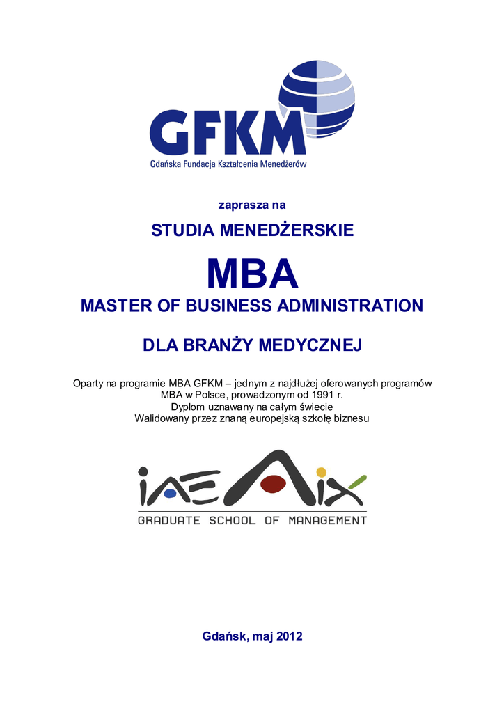 zaprasza na STUDIA MENEDŻERSKIE MBA MASTER OF BUSINESS ADMINISTRATION DLA BRANŻY MEDYCZNEJ Oparty na programie MBA GFKM – jednym z najdłużej oferowanych programów MBA w Polsce, prowadzonym od 1991 r. Dyplom uznawany na całym świecie Walidowany przez znaną europejską szkołę biznesu Gdańsk, maj 2012 Gdańska Fundacja Kształcenia Menedżerów oraz Uniwersytet Gdański, we współpracy z IAE Aix-En-Provence Graduate School of Management, jako instytucją walidującą, zapraszają do udziału w specjalnej I edycji programu STUDIA MENEDŻERSKIE MBA MASTER OF BUSINESS ADMINISTRATION DLA BRANŻY MEDYCZNEJ C echy w yr óż niające St udia Menedż er skie MB A dla Br anż y Medycz nej 1. Program studiów dostosowany do potrzeb menedżerów średnich i wyższych szczebli zarządzania w branży medycznej. Zawiera sesje poświęcone w całości zarządzaniu. Pozostałe sesje nawiązują do funkcjonowania branży medycznej 2. Zajęcia prowadzone przy wykorzystaniu metodologii ABL (Activity Based Learning – warsztatu partycypacyjnego), uznanej za najskuteczniejszą dla rozwijania kompetencji menedżerskich i kierowniczych. 3. Obszerne materiały i podręczniki prezentujące najnowsze osiągnięcia w dziedzinie zarządzania. 4. Wymiana wiedzy pomiędzy uczestnikami doświadczenie firmowe i biznesowe. 5. Silna motywacja do uczenia się rozwoju w gronie wyróżniających się menedżerów z branży medycznej. 6. „Efekt sieci” - możliwość nawiązania i wzmocnienia relacji pomiędzy kluczowymi osobami z branży. 7. Program realizowany przez GFKM od 20 lat. Uznawany za jeden z najbardziej praktycznych w Polsce. posiadającymi cenne 2 STUDIA MENEDŻERSKIE MBA DLA BRANŻY MEDYCZNEJ 1. Program trwa 24 miesiące – październik 2012 r. (4 semestry). Rozpoczęcie studiów 2. Program przeznaczony dla kadry menedżerskiej 3. Grupa uczestników 20-35 osób. 4. Akredytacja programu przez uczelnię zagraniczną IAE Graduate School of Management działającą w strukturze Uniwersytetu Aix-Marseille im. Paula Cezane’a – najstarszą państwową szkołą biznesu we Francji o międzynarodowym charakterze. IAE należy do najlepszych szkół biznesu w Europie, czego potwierdzeniem jest posiadanie europejskiej akredytacji EQUIS. 5. Podstawą przyjęcia na studia jest wynik rozmowy kwalifikacyjne, której termin uzgodniony zostaje z chwilą otrzymania kompletu dokument ów (w tym kopii dyplomu ukończenia studiów wyższych) złożonych przez kandydata. 6. Zajęcia prowadzone w języku polskim. 7. Uczestnicy programu otrzymują: możliwość udziału we wszystkich zajęciach programowych i spotkaniach integracyjnych, konsultacje międzysesyjne z wykładowcami, opiekę nad pracami dyplomowymi, pełen zestaw niezbędnych podręczników i materiałów dydaktycznych, stałe wsparcie we wszystkich kwestiach merytorycznych i organizacyjnych, obiad, kawę i napoje w trakcie sesji szkoleniowych. 8. Praca dyplomowa ma wartość praktyczną dla słuchaczy i ich firm - dotyczy aktualnych zagadnień firmowych. 9. Po pomyślnym ukończeniu studiów słuchacze otrzymają dyplom MB A podpisany przez wszystkie partnerskie instytucje: Gdańską Fundację Kształcenia Menedżer ów, Uniwersytet Gdański, IAE Aix-en-Provence Graduate School of Management 10. Opłata za udział w programie: 7 900,00 złotych plus VAT za semestr. 3 KONTAKT W SPRAWIE STUDIÓW MBA DLA BRANŻY MEDYCZNEJ Prof. Wojciech Rybowski Prezes Zarządu GFKM tel. (58) 558 58 58 w. 321 e-mail: [email protected] Adam Ubertowski Dyrektor Programu MBA tel. (58) 558 58 58 w. 385 tel. kom. 602 362 729 e-mail: [email protected] Halina Frątczak Koordynator Programu MBA tel. (58) 558 58 58 w. 310 tel. kom. 0600 095 672 e-mail: [email protected] Bardzo prosimy o zgłoszenia do 30 września 2012 r. na stronie http://www.gfkm.pl/programy/mba-medyczny/form 4