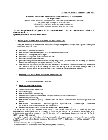 Jędrzejów, dnia 22 września 2015 roku. Komenda Powiatowa Państwowej Straży Pożarnej w Jędrzejowie ul. Reymonta 5 ogłasza nabór do służby na stanowisko związane bezpośrednio z udziałem w działaniach ratowniczo – gaśniczych stanowisko: stażysta w służbie przygotowawczej stanowisko etatowe: starszy ratownik-kierowca Liczba kandydatów do przyjęcia do służby w okresie 1 roku od zakończenia naboru: 1 Wymiar etatu: 1 System pełnienia służby: zmianowy 1. Wymagania niezbędne związane ze stanowiskiem: Kandydat do służby w Państwowej Straży Pożarnej musi spełniać następujące kryteria wynikające z zapisów ustawy o PSP: posiadać obywatelstwo polskie, niekaralność za przestępstwo lub za przestępstwo skarbowe, korzystać z pełni praw publicznych, posiadać co najmniej wykształcenie średnie, posiadać prawo jazdy kategorii C, posiadać uregulowany stosunek do służby wojskowej (przeniesienie do rezerwy po odbyciu służby lub bez odbycia służby) - nie dotyczy kobiet, legitymować się bardzo dobrym stanem zdrowia, tj. zdolnością fizyczną i psychiczną konieczną do pełnienia służby w PSP (oceny zdolności do służby w PSP dokonują komisje lekarskie podległe ministrowi spraw wewnętrznych-weryfikacja w ostatnim etapie naboru). 2. Wymagania pożądane stawiane kandydatom: Zostały wymienione w tabeli Nr 1. 3. Wymagane dokumenty: życiorys (napisany odręcznie), list motywacyjny, kserokopia dowodu osobistego, kserokopia książeczki wojskowej - wszystkie strony (nie dotyczy kobiet), kserokopia prawa jazdy, kserokopie świadectw pracy, zaświadczeń lub innych dokumentów potwierdzających staż pracy, kserokopie dokumentów potwierdzających wykształcenie, kwalifikacje zawodowe (w tym specjalistyczne) i dodatkowe uprawnienia, podpisane oświadczenia kandydata (wg wzoru - załącznik nr 1): - o wyrażeniu zgody na przetwarzanie danych osobowych niezbędnych do realizacji procesu postępowania kwalifikacyjnego w związku z naborem do służby w Komendzie Powiatowej PSP w Jędrzejowie, zgodnie z ustawą z dnia 29 sierpnia 1997 r. o ochronie danych osobowych (t.j. Dz. U. z 2014 r. poz. 1182 ze zm.), - o wyrażeniu zgody na publikację wyników poszczególnych etapów postępowania w naborze do służby w PSP na stronie internetowej Komendy Powiatowej PSP w Jędrzejowie i tablicy ogłoszeń w jej siedzibie, - o korzystaniu z pełni praw publicznych, - o niekaralności za przestępstwo lub za przestępstwo skarbowe, - o świadomości odpowiedzialności karnej, wynikającej z art. 233 § 1 Kodeksu Karnego przewidującego karę pozbawienia wolności do lat 3 za składanie fałszywych zeznań, - o niewnoszeniu roszczeń w stosunku do tut. komendy o wypłatę odszkodowania z tytułu ewentualnego wypadku, kontuzji lub uszczerbku na zdrowiu zaistniałego z winy kandydata podczas naboru do służby w Komendzie Powiatowej PSP w Jędrzejowie, aktualne zaświadczenie lekarskie od lekarza rejonowego (rodzinnego, medycyny pracy, medycyny sportowej lub internisty) dopuszczające do: próby wydolnościowej zmodyfikowaną metodą harwardzką („Harvard Step-Up Test”), biegu na 50 m, biegu na 1 000 m, podciągania się na drążku, próby wysokościowej i sprawdzianu z pływania, wystawione nie wcześniej niż 30 dni przed dniem przystąpienia do próby wydolnościowej (wg wzoru - załącznik nr 2 lub o odpowiadającej mu treści). Zaświadczenie lekarskie kandydat dostarcza najpóźniej w dniu przeprowadzenia próby wydolnościowej zmodyfikowaną metodą harwardzką („Harvard StepUp Test”). Koszty badań lekarskich w celu wydania zaświadczenia ponosi kandydat. 4. Termin i miejsce składania dokumentów: Termin składania dokumentów: od dnia 22 września 2015 roku do dnia 1 października 2015 roku do godz. 1530. Miejsce składania dokumentów: sekretariat Komendy Powiatowej Państwowej Straży Pożarnej w Jędrzejowie lub drogą pocztową (decyduje data i godzina wpływu do sekretariatu) na adres: Komenda Powiatowa Państwowej Straży Pożarnej w Jędrzejowie, ul. Reymonta 5, 28 - 300 Jędrzejów. Dokumenty należy dostarczyć w zaklejonej kopercie opatrzonej imieniem i nazwiskiem kandydata oraz dopiskiem „Nabór do służby w KP PSP w Jędrzejowie”. Oferty niekompletne (brak jakiegokolwiek wymaganego dokumentu) lub złożone po terminie wskazanym w ogłoszeniu nie będą brane pod uwagę w postępowaniu kwalifikacyjnym. Postępowanie kwalifikacyjne Postępowanie kwalifikacyjne składać się będzie z czterech etapów, które przeprowadzi komisja kwalifikacyjna powołana przez Komendanta Powiatowego PSP w Jędrzejowie przy udziale funkcjonariuszy Komendy Wojewódzkiej PSP w Kielcach, delegowanych przez Świętokrzyskiego Komendanta Wojewódzkiego PSP w Kielcach. I etap postępowania kwalifikacyjnego – weryfikacja złożonych dokumentów Ten etap obejmuje weryfikację zgodności ofert ze stawianymi wymaganiami oraz dokonanie oceny złożonych dokumentów za pomocą punktów gratyfikacyjnych. Tabela Nr 1 Lp. Posiadane kwalifikacje i uprawnienia 1. wyszkolenie pożarnicze w PSP, tj. kurs podstawowy 2. wyszkolenie pożarnicze w PSP, tj. kurs uzupełniający (podoficerski) 3. wyszkolenie pożarnicze w PSP, tj. technik pożarnictwa 4. wyszkolenie pożarnicze w PSP, tj. inżynier pożarnictwa wyszkolenie pożarnicze w OSP, tj. szkolenie podstawowe strażaków ratowników OSP + kurs w zakresie kwalifikowanej pierwszej pomocy 5. Liczba punktów 15 20 25 30 10 10. wyszkolenie pożarnicze w OSP, tj. szkolenie podstawowe strażaków ratowników OSP + kurs w zakresie kwalifikowanej pierwszej pomocy + szkolenie z zakresu ratownictwa technicznego dla strażaków ratowników OSP wyszkolenie pożarnicze w OSP, tj. szkolenie podstawowe strażaków ratowników OSP + kurs w zakresie kwalifikowanej pierwszej pomocy + szkolenie z zakresu ratownictwa technicznego dla strażaków ratowników OSP + szkolenie strażaków ratowników OSP z zakresu działań przeciwpowodziowych