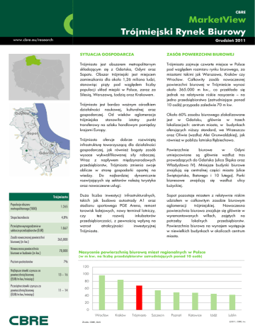 CBRE MarketView Trójmiejski Rynek Biurowy www.cbre.eu/research Grudzień 2011 SYTUACJA GOSPODARCZA ZASÓB POWIERZCHNI BIUROWEJ Trójmiasto jest obszarem metropolitarnym składającym się z Gdańska, Gdyni oraz Sopotu. Obszar trójmiejski jest miejscem zamieszkania dla około 1,26 miliona ludzi, stanowiąc piąty pod względem liczby populacji układ miejski w Polsce, zaraz za Silesią, Warszawą, Łodzią oraz Krakowem. Trójmiasto zajmuje czwarte miejsce w Polsce pod względem rozmiaru rynku biurowego, za miastami takimi jak Warszawa, Kraków czy Wrocław. Całkowity zasób nowoczesnej powierzchni biurowej w Trójmieście wynosi około 365.000 m kw., co przekłada się jednak na relatywnie niskie nasycenie – na jedno przedsiębiorstwo (zatrudniające ponad 10 osób) przypada zaledwie 70 m kw. Trójmiasto jest bardzo ważnym ośrodkiem działalności naukowej, kulturalnej oraz gospodarczej. Od wieków aglomeracja trójmiejska stanowiła istotny punkt transferowy na szlaku handlowym pomiędzy krajami Europy. Gdynia Sopot Trójmiasto oferuje dobrze rozwiniętą infrastrukturę towarzyszącą dla działalności gospodarczej, jak również bogaty zasób wysoce wykwalifikowanej siły roboczej. Wraz z napływem międzynarodowych przedsiębiorstw, Trójmiasto zmienia swoje oblicze w stronę gospodarki opartej na wiedzy. Do najbardziej dynamicznie rozwijających się sektorów należą turystyka oraz nowoczesne usługi. Gdańsk Trójmiasto Populacja obszaru metropolitarnego (‘000) 1.265 Stopa bezrobocia 4,8% Przeciętne wynagrodzenie w sektorze przedsiębiorstw (EUR) 1.067 Zasób nowoczesnej powierzchni biurowej (m kw.) 365,000 Nowoczesna powierzchnia biurowa w budowie (m kw.) Poziom pustostanów 70,000 Duża liczba inwestycji infrastrukturalnych, takich jak budowa autostrady A1 oraz stadionu sportowego PGE Arena, remont torowisk kolejowych, nowy terminal lotniczy, czy też rozwój inkubatorów przedsiębiorczości, z pewnością wpłyną na wzrost atrakcyjności inwestycyjnej Trójmiasta. Około 60% zasobu biurowego zlokalizowane jest w Gdańsku, głównie w trzech lokalizacjach: centrum miasta, w budynkach oferujących niższy standard, we Wrzeszczu oraz Oliwie (wzdłuż Alei Grunwaldzkiej), jak również w pobliżu lotniska Rębiechowo. Powierzchnie biurowe w Gdyni umiejscowione są głównie wzdłuż tras prowadzących do Gdańska (ulica Śląska oraz Władysława IV). Mniejsze budynki biurowe znajdują się centralnej części miasta (ulice Świętojańska, Batorego i 10 lutego). Parki biznesowe znajdują się wzdłuż ulicy Łużyckiej. Sopot pozostaje miastem z relatywnie niskim udziałem w całkowitym zasobie biurowym aglomeracji trójmiejskiej. Nowoczesna powierzchnia biurowa znajduje się głównie w wyremontowanych willach, zajętych na potrzeby lokalnych przedsiębiorstw. Powierzchnia biurowa na wynajem występuje w niewielkich budynkach w okolicach centrum miasta. Nasycenie powierzchnią biurową miast regionalnych w Polsce (w m kw. na liczbę przedsiębiorstw zatrudniających ponad 10 osób) 7% 120 Najlepsze stawki czynszu za powierzchnię biurową (EUR/m kw./miesiąc) 13 – 16 Przeciętne stawki czynszu za powierzchnię biurową (EUR/m kw./miesiąc) 11 – 14 100 80 60 40 20 0 Wrocław Źródło: CBRE, GUS Kraków Trójmiasto Szczecin Poznań Katowice Łódź Lublin ©2011, CBRE, Inc. Pierwszym znaczącym projektem biurowym w Trójmieście był Baltic Business Centre, wybudowany w Parki biurowe w Trójmieście 1995 r. Dobre czasy dla rynku biurowym nastały jednak po 2000 r., gdy oddano wiele dużych projektów, włącznie z siedzibą Grupy Lotos – pierwszym projektem biurowym o powierzchni ponad 20.000 m kw. Koniunktura na rynku biurowym w Gdańsku osiągnęła szczyt w roku 2008 gdy na rynek trafiło około Arkońska Business Park Łużycka Office Park 55.000 mkw. w dziesięciu niezależnych obiektach. Obecnie, do największych i najbardziej znanych istniejących projektów biurowych należą Arkońska Podaż nowoczesnej powierzchni biurowej w Trójmieście Business Park w Gdańsku oraz Łużycka Office Park w Gdyni. Nowa Podaż Unikalnym elementem Trójmiasta jest dominacja na W budowie Planowane 80 000 rynku biurowym lokalnych deweloperów takich jak Allcon Investment, Grupa Inwestycyjna Hossa, Torus, TPS czy Euro Styl. 60 000 40 000 są: Alchemia firmy Torus, Garnizon.biz – Omega & Gamma, pierwsza faza BCB Business Park oraz Opera Office. Wśród istotnych projektów Wybrane budynki biurowe planowane / w budowie planowanych na następne lata należy wymienić budynek Neptun spółki Hines, kolejne fazy Olivia Business Centre, BCB Business Park oraz Garnizon.biz. Ze względu na rosnące zainteresowanie nowoczesnymi biurami, zarówno wśród istniejących najemców, jak też nowych graczy, absorpcja nowej powierzchni jest potencjalnie bardzo wysoka. W Olivia Business Centre - Tower Garnizon.biz związku z tym wysokiej klasy budynki biurowe relatywnie zapełniają się najemcami. Obecnie, dla przedsiębiorstwa szukającego 4.000 m kw. powierzchni biurowej w następnym roku, dostępnych jest 7 możliwości (biorąc pod uwagę budynki istniejące oraz w budowie). W całym Trójmieście dostępność postindustrialnych terenów inwestycyjnych jest bardzo wysoka. Dawne obszary Stoczni Gdańskiej czy też Stoczni Gdyńskiej kuszą inwestorów atrakcyjną lokalizacją przy głównych trasach, w niedalekiej odległości od centrum miasta. W skutecznie przyszłości przekształcone te tereny w mogą atrakcyjne zostać obiekty biurowe, bądź też o wielofunkcyjnym przeznaczeniu. Strona 2 ©2011, CBRE, Inc. BCB Business Park Alchemia 2013P Business Centre – Olivia Gate spółki TPS. W budowie 2012P należy Olivia 2011 największych projektów w tym roku 0 2010 70.000 mkw. nowoczesnej powierzchni biurowej. Do 2009 kw. 2011. Obecnie, w budowie znajduje się około 20 000 2008 Trójmieście przekroczył 365.000 mkw. pod koniec 3 2007 Całkowity zasób nowoczesnej powierzchni bi